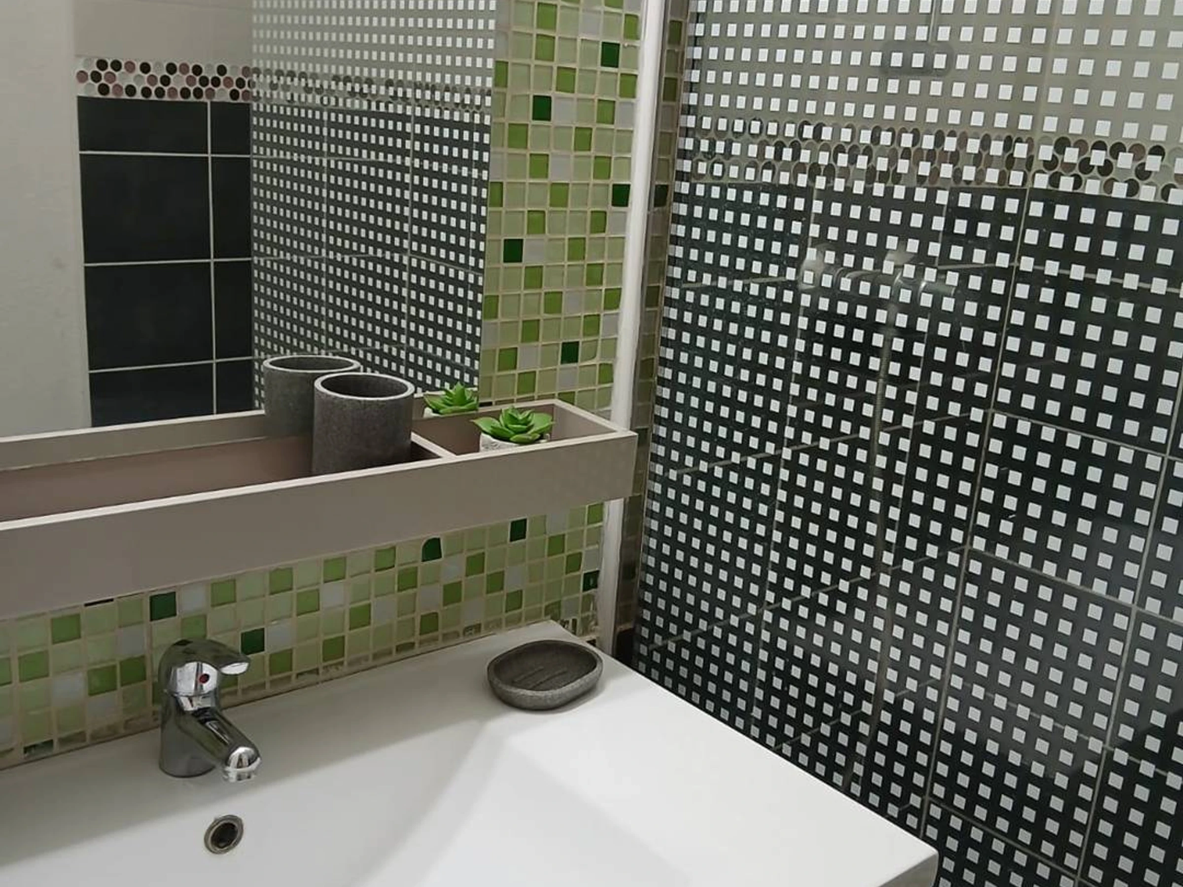 L’espace de vie comprend un salon lumineux avec un canapé convertible (140x190 cm), un téléviseur, une table à manger, des rangements, un ventilateur, ainsi qu’un fer et une table à repasser. Le coin cuisine, fonctionnel et bien équipé, dispose d’un réfrigérateur top, d’un micro-ondes, d’une cafetière à filtre, d’une bouilloire, d’un grille-pain et de deux plaques de cuisson électriques.