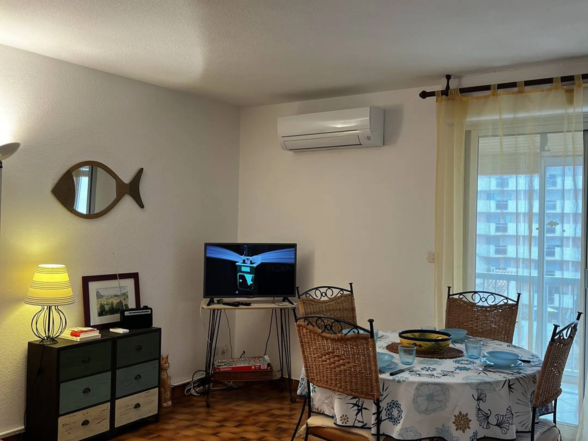 Le séjour, climatisé, dispose d’un canapé convertible type clic-clac, d’un espace TV et d’une table à manger confortable pour vos repas en famille ou entre amis