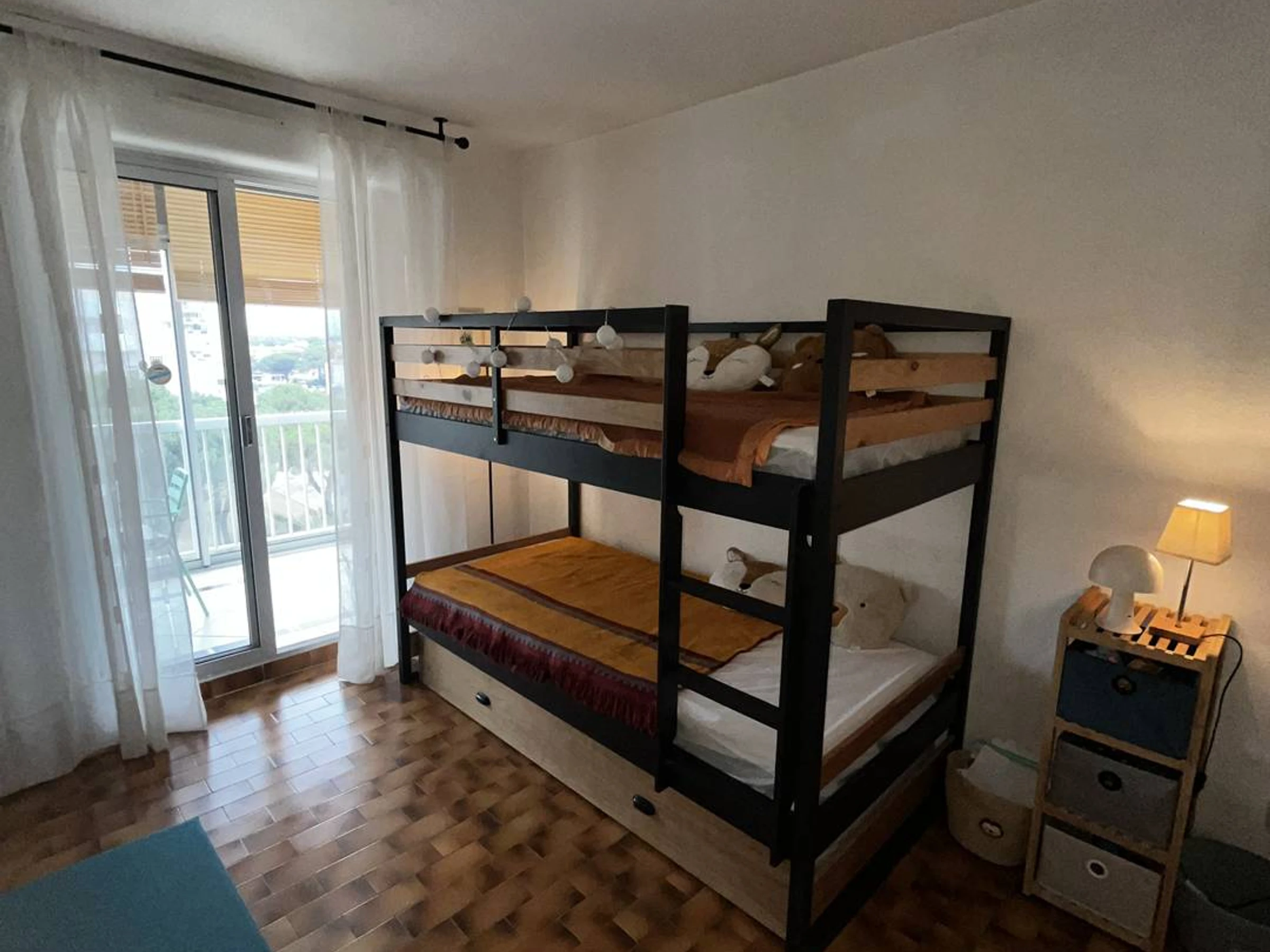 La chambre est pensée pour les enfants, avec deux lits superposés et un lit d'appoint, un placard de rangement et un ventilateur pour assurer leur confort