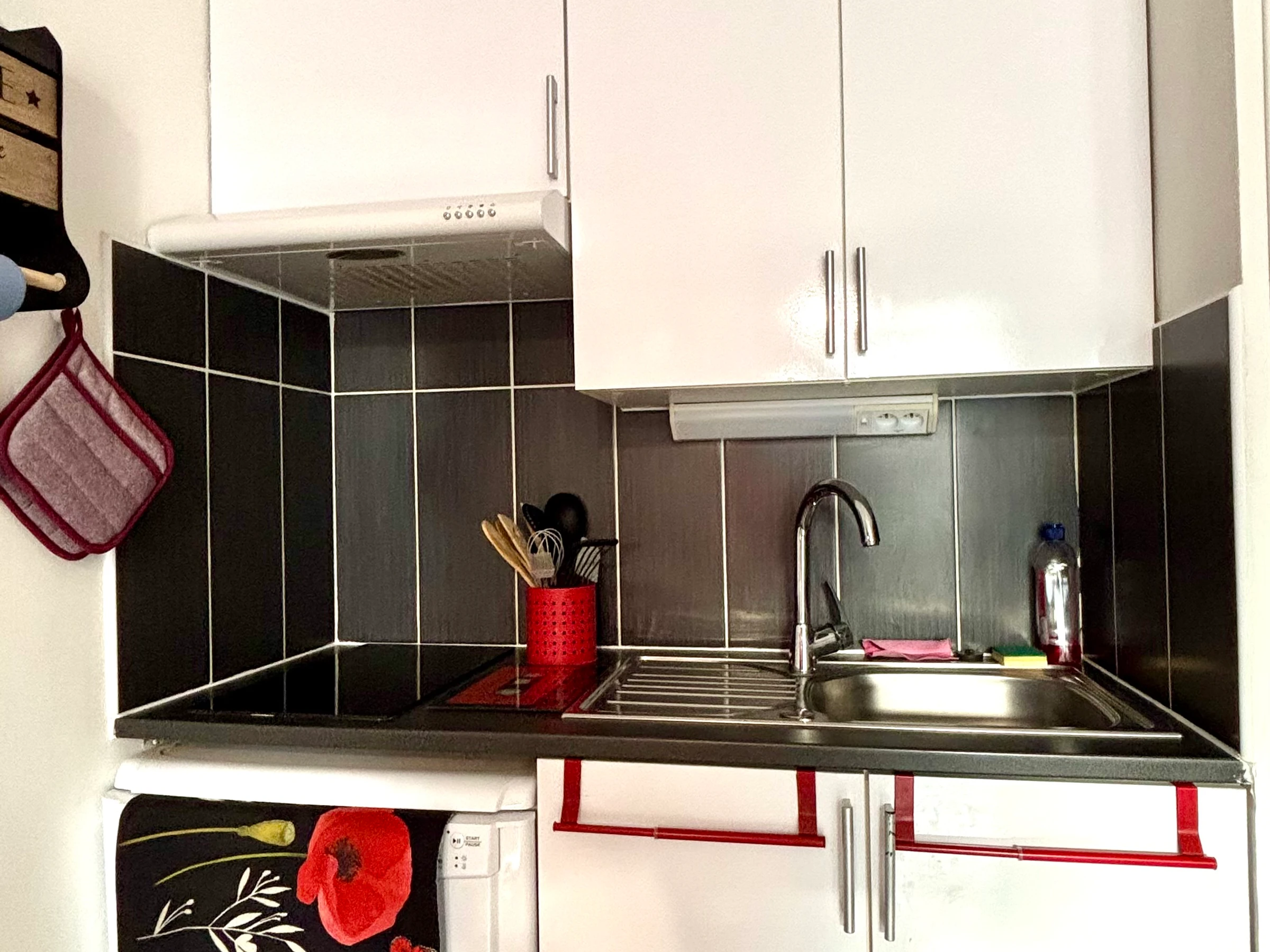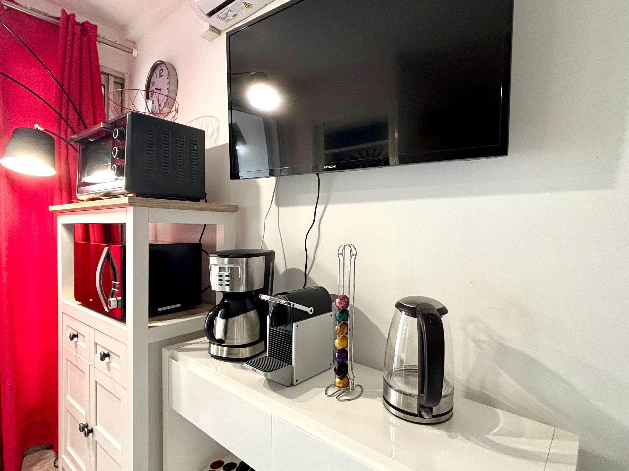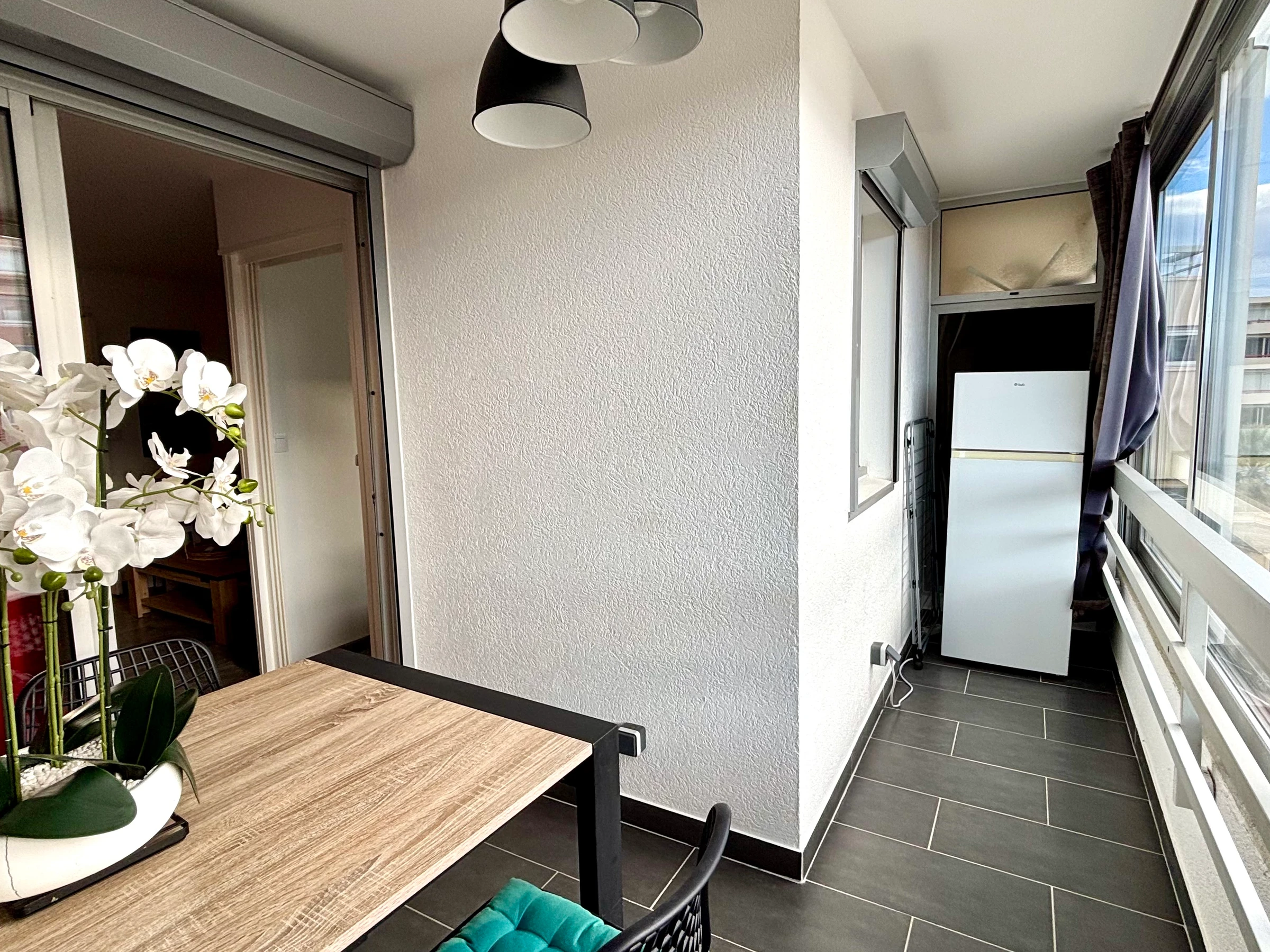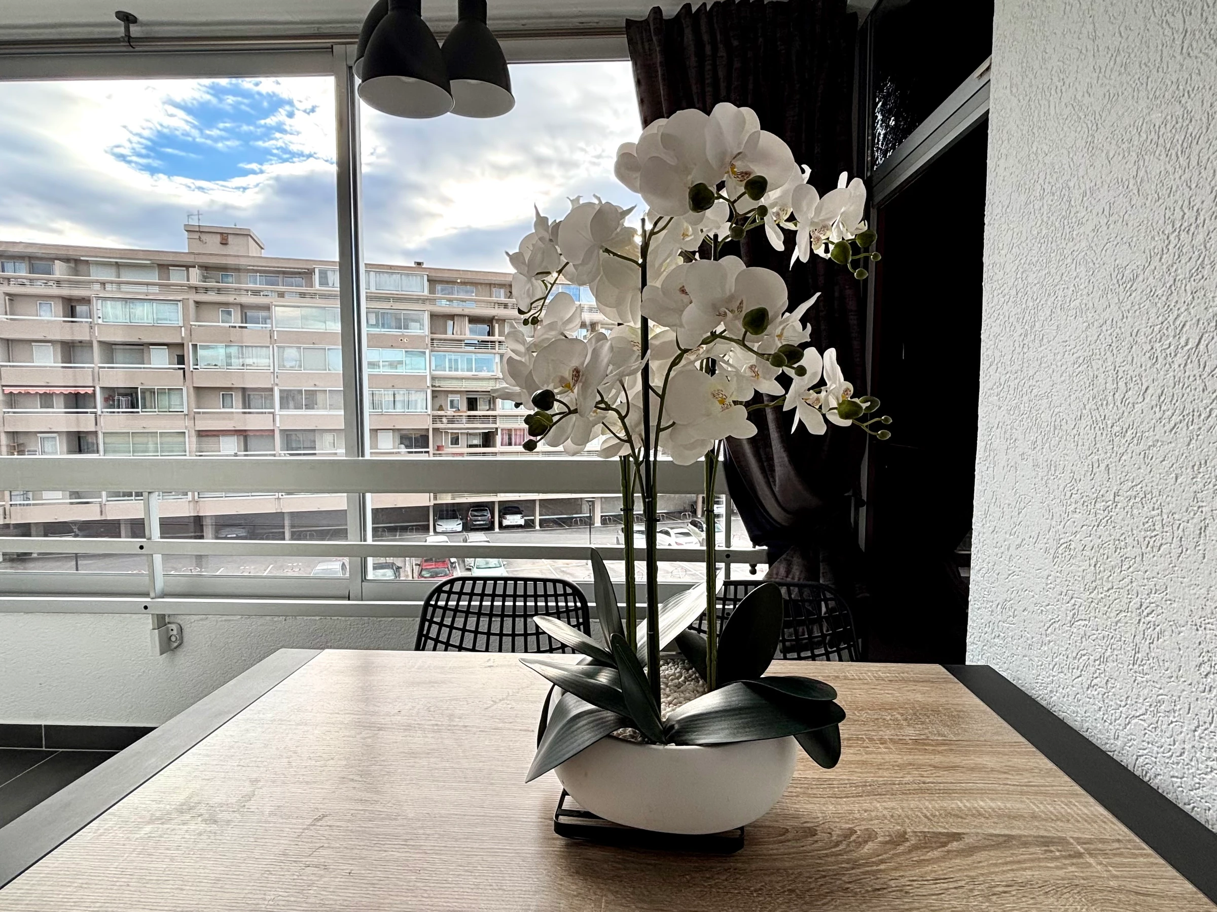 Entrée avec placard, salle d'eau avec douche (lave-linge), wc indépendant, séjour climatisé (BZ 140x190cm, TV, WIFI), kitchenette équipée (frigo, lave-vaisselle, micro-onde et lave-linge, cafetière nespresso, micro-ondes, mini four), chambre (lit 140x190cm), loggia fermée avec baie vitrées coulissantes pour vos coins repas.