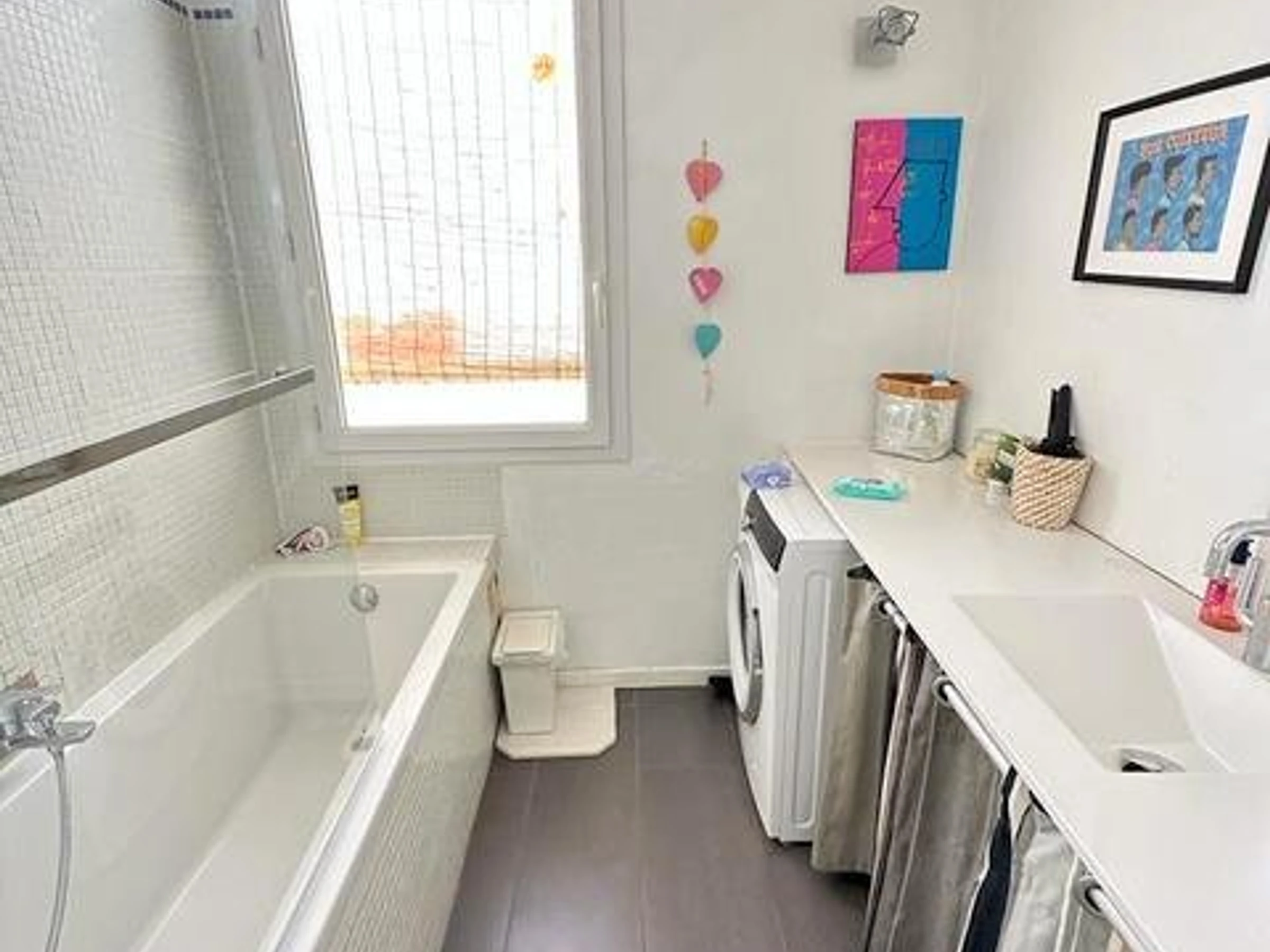 La salle d’eau est dotée d'une vasque et d’une baignoire, avec des toilettes séparées.