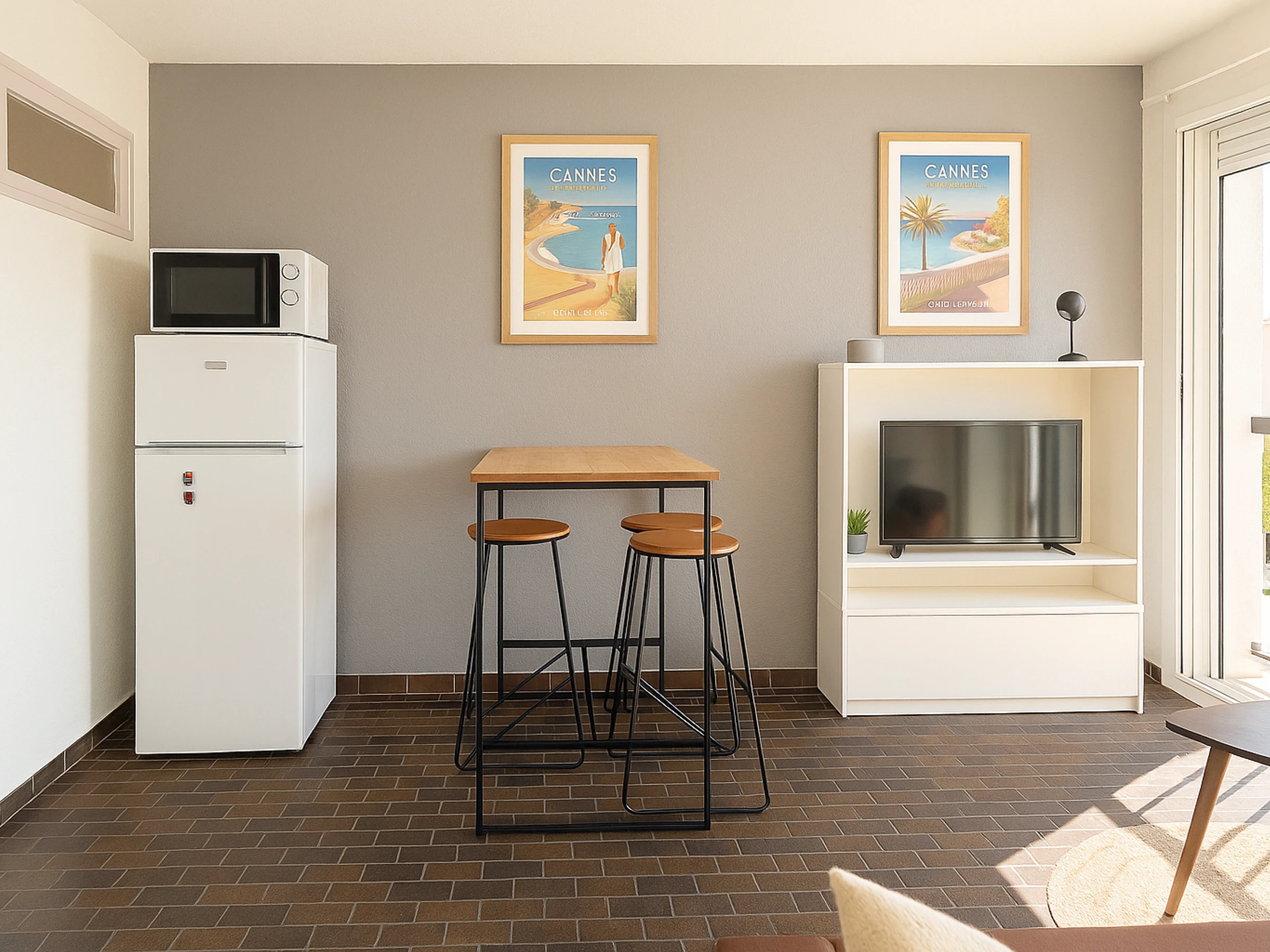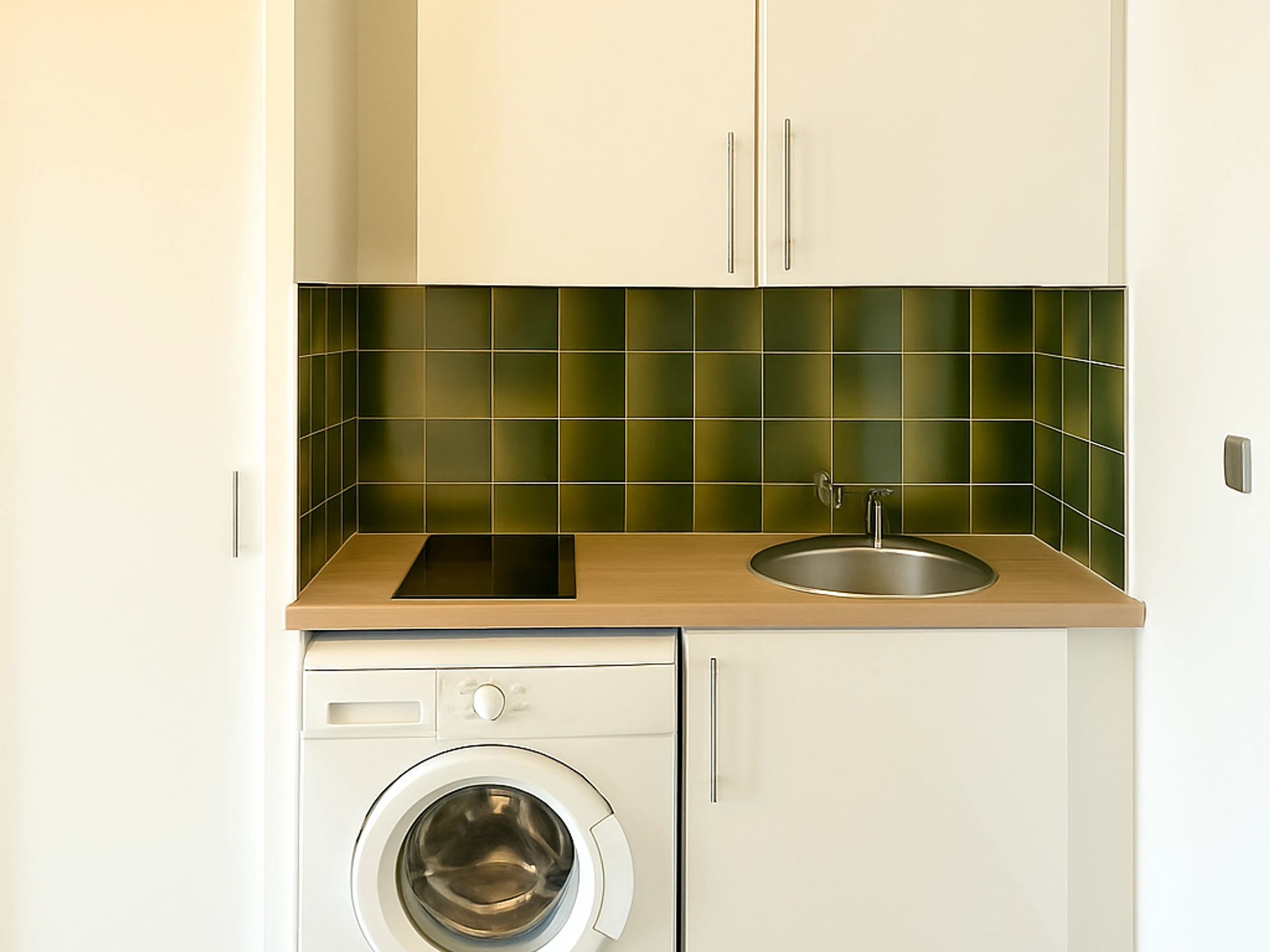 Une cuisine ouverte toute équipée : plaque induction, micro-ondes, cafetière électrique ...