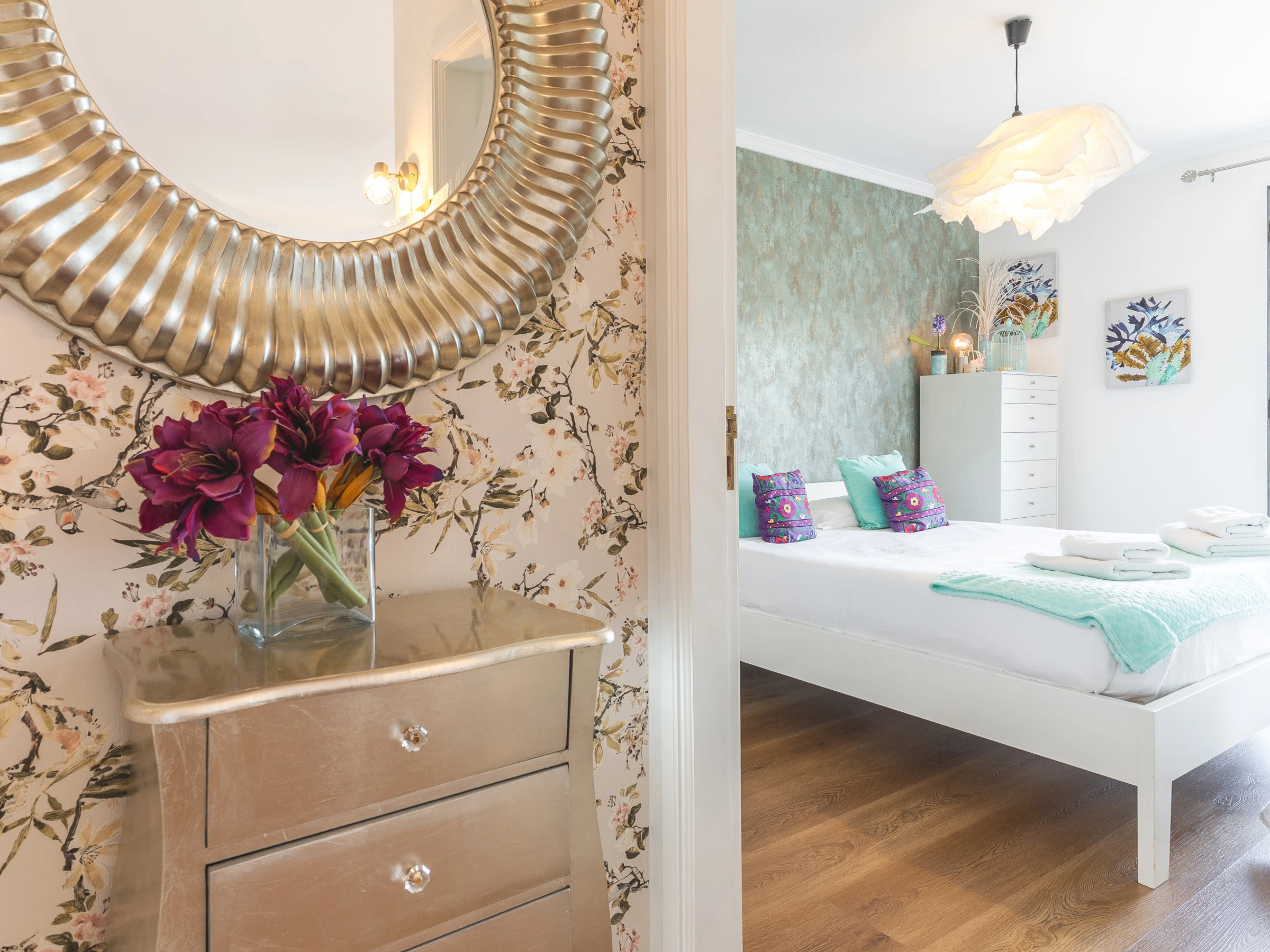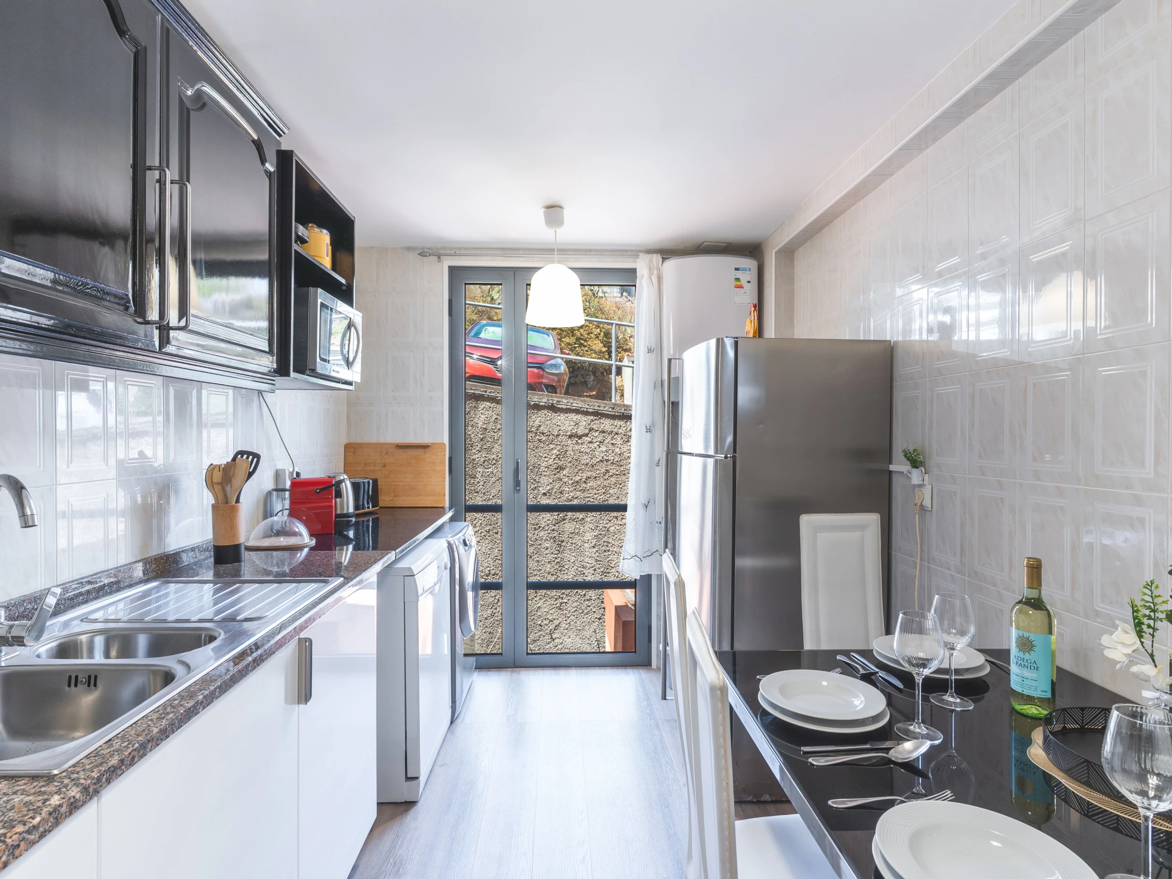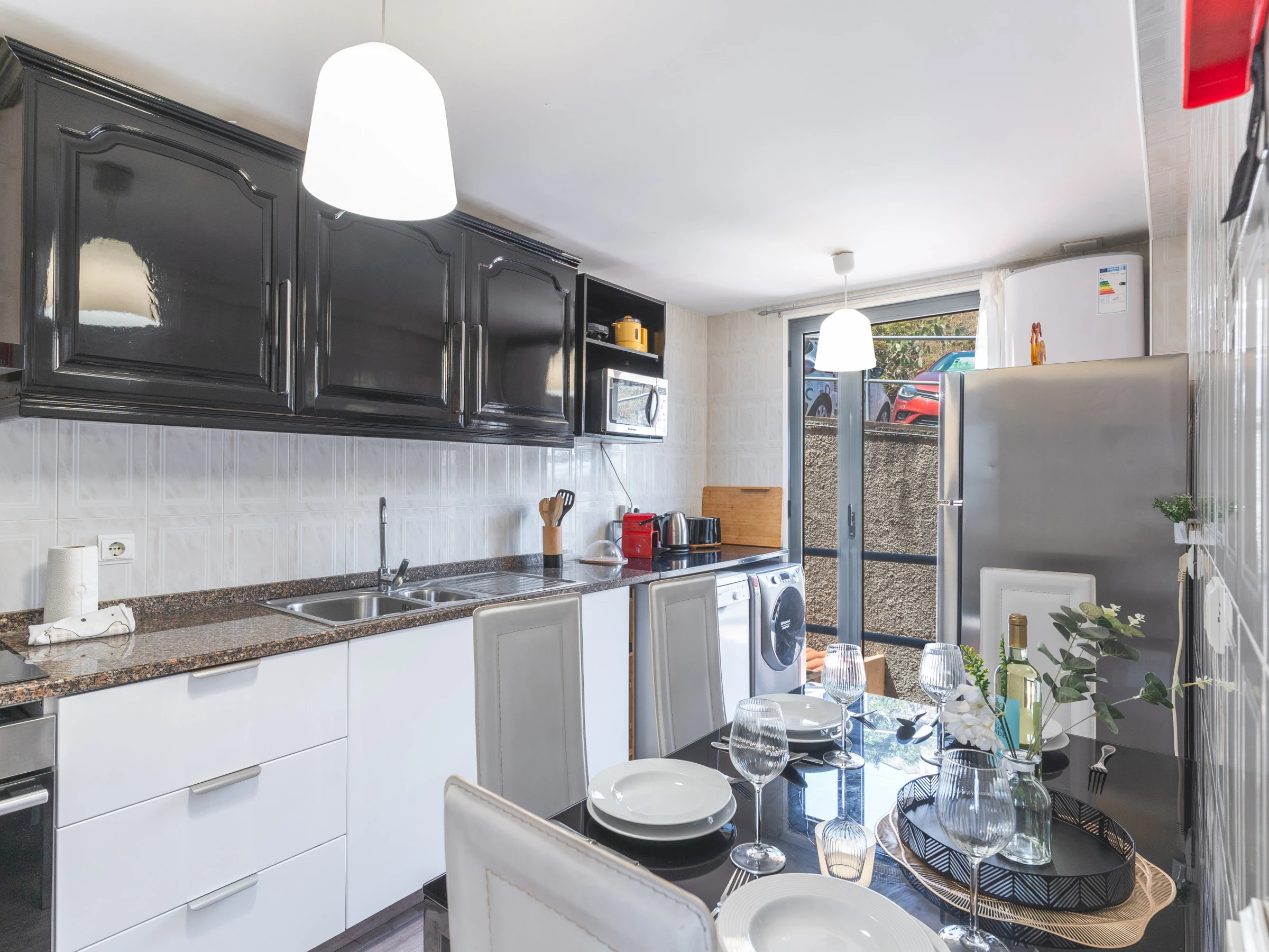 L’appartement comprend une salle de bain avec baignoire et une cuisine entièrement équipée avec réfrigérateur, congélateur, four, micro-ondes, plaque de cuisson, lave-vaisselle, couverts, assiettes et tout le nécessaire pour cuisiner facilement à la maison. Une machine à laver, un sèche-cheveux et une smart TV avec box sont également à disposition.