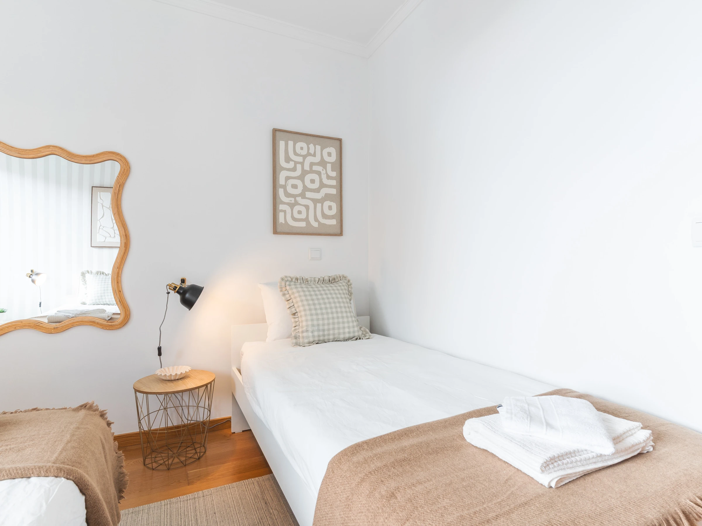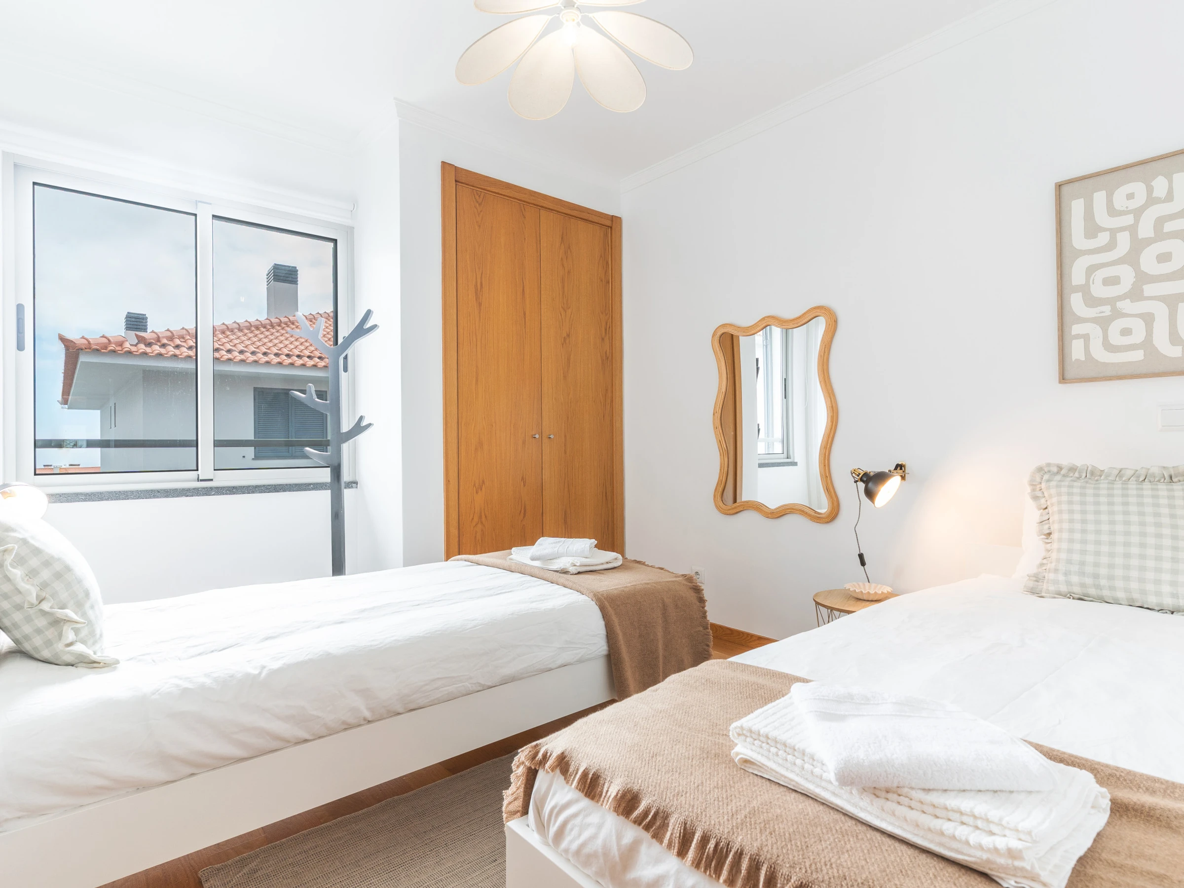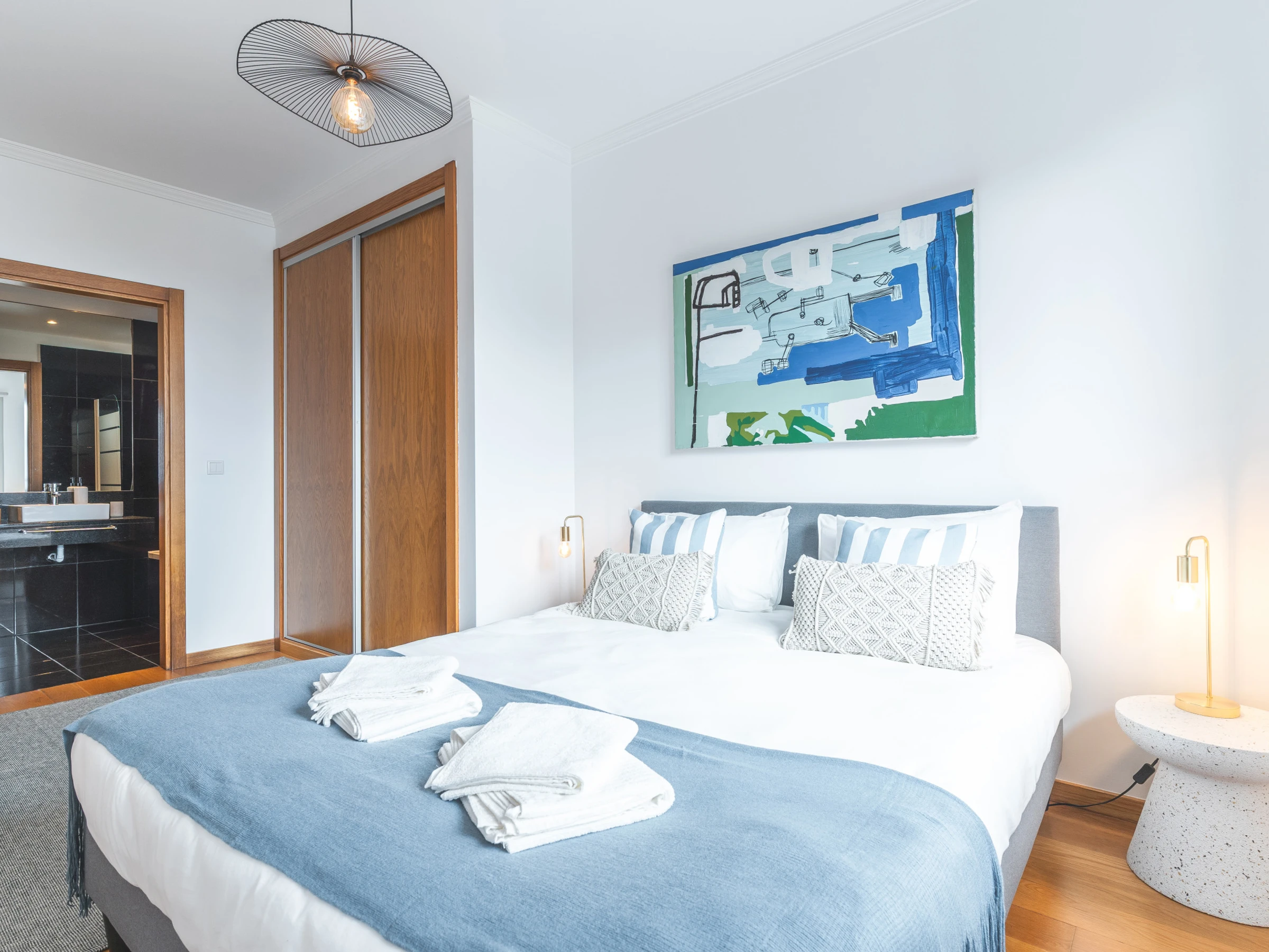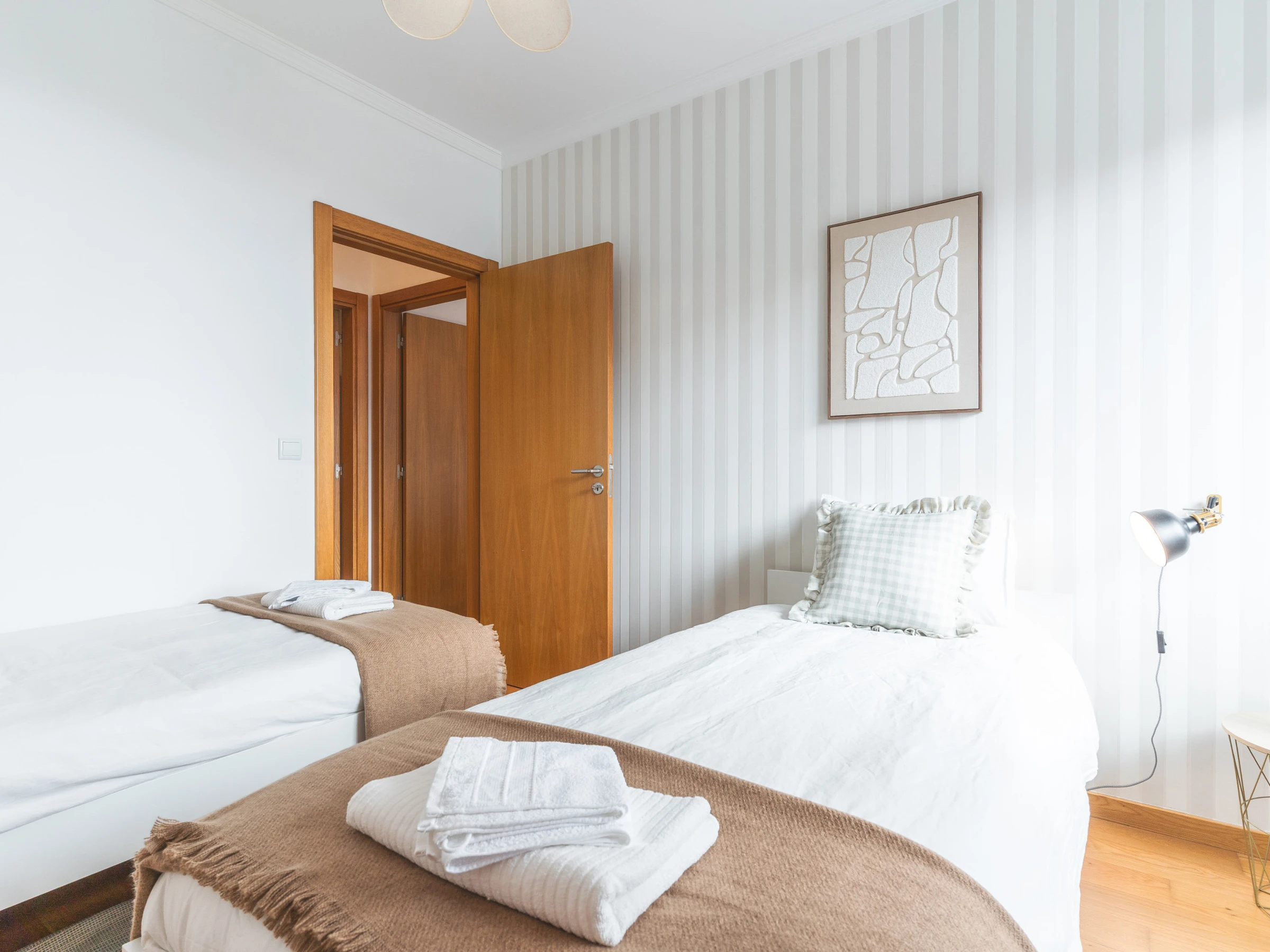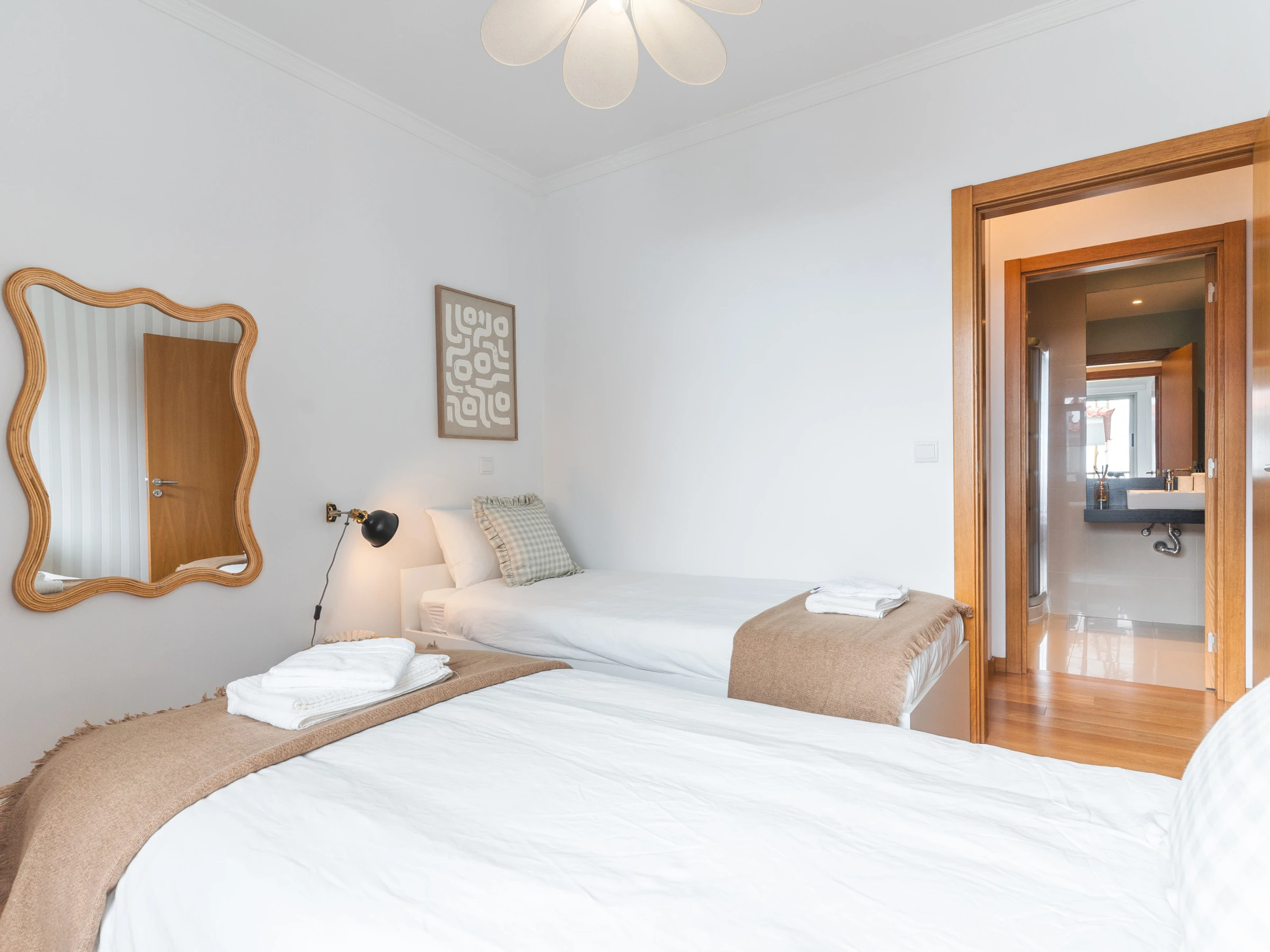 L'appartement dispose d'une chambre avec un lit queen size et d'une autre avec deux lits simples, offrant des dispositions de couchage flexibles. Deux salles de bains offrent un confort supplémentaire : l'une comprend une baignoire et l'autre une douche. Des draps de lit et des serviettes de bain sont fournis pour tous les invités.