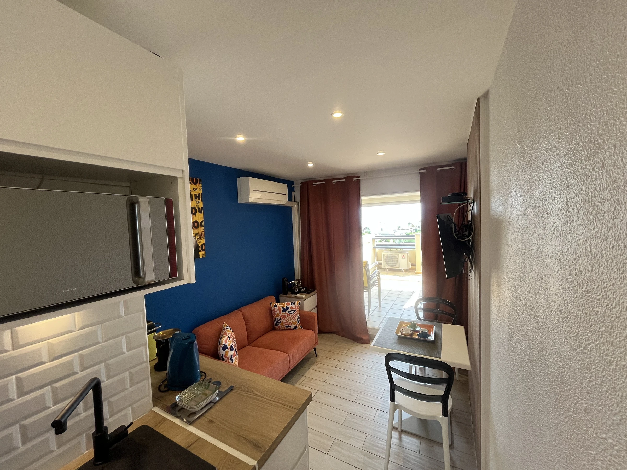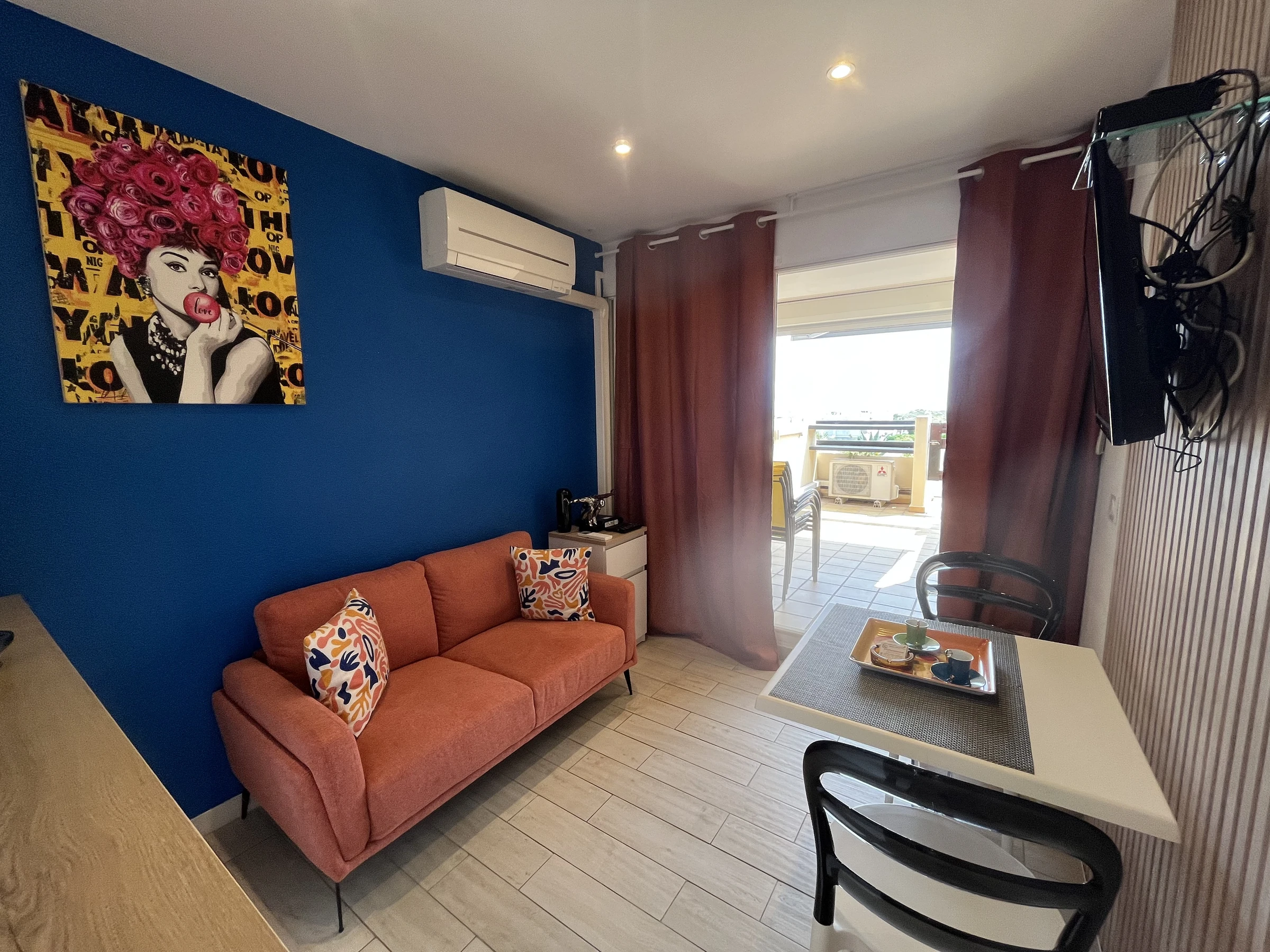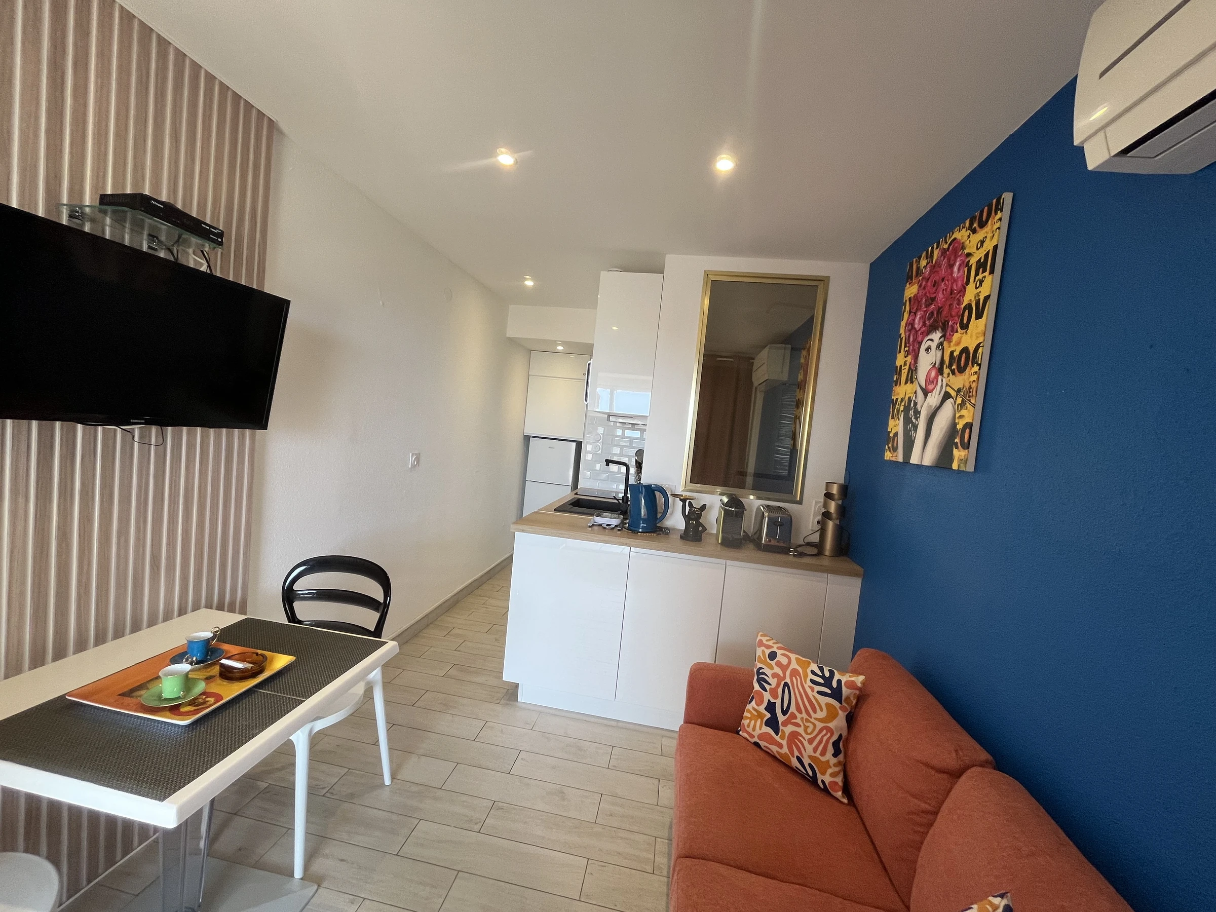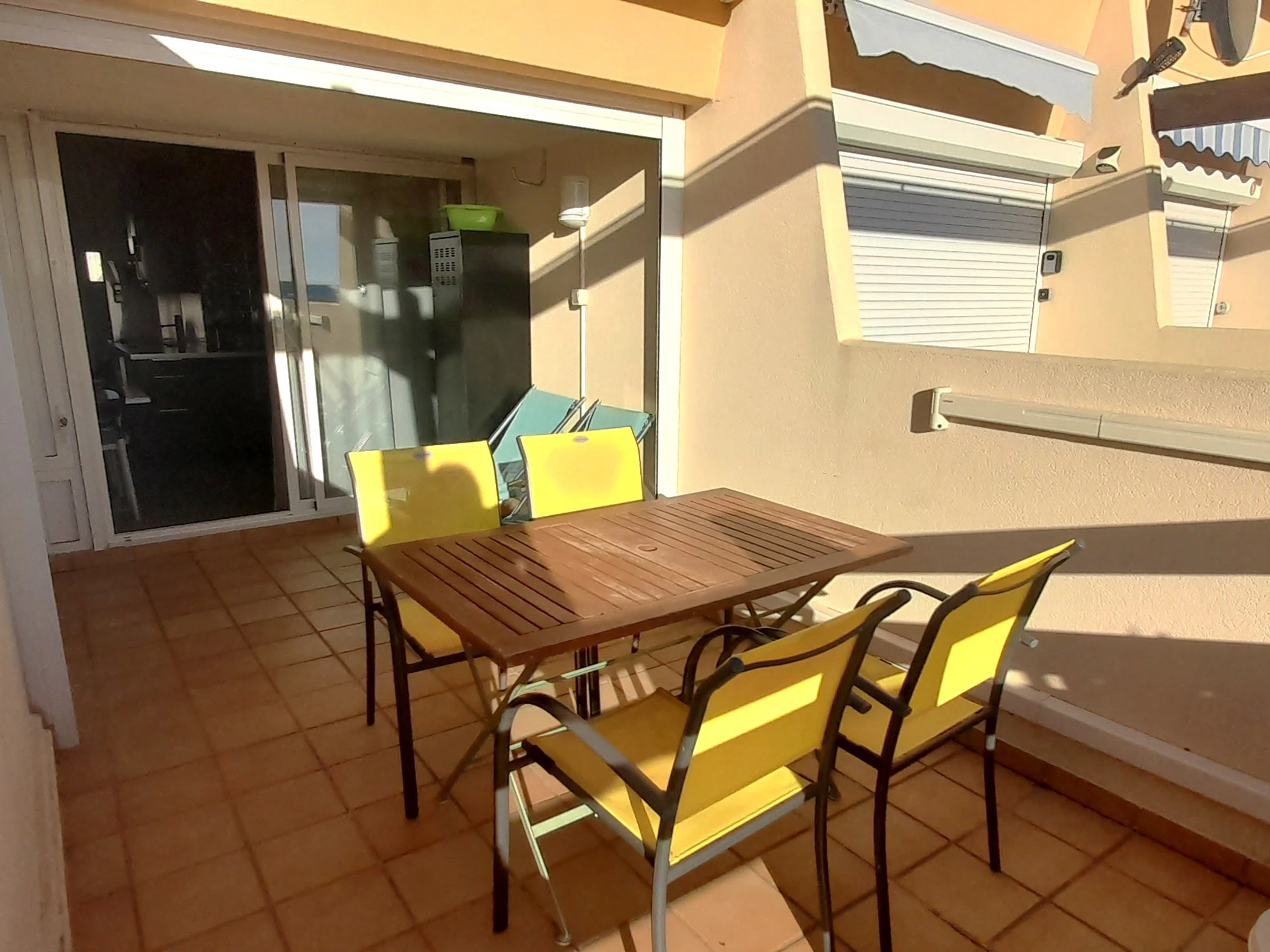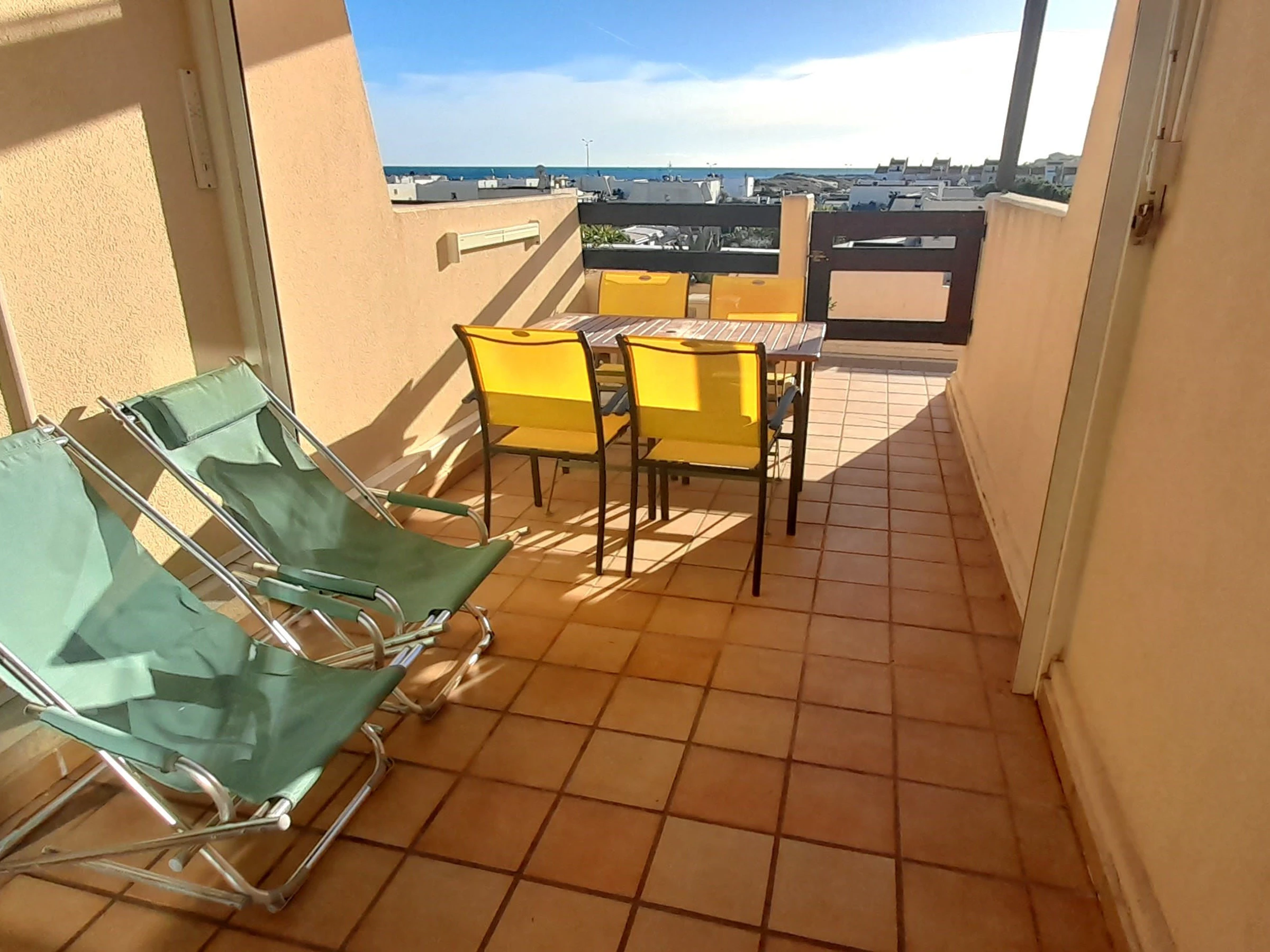 Appartement climatisé et rénové pour 2 personnes à Port Nature colline 3 au 2ème étage sans ascenseur, le long de la coursive. Orientation Sud. Une chambre avec un lit en 140 cm. Coin cuisine avec grand frigidaire, micro ondes, cafetière Nespresso et cafetière a filtre, bouilloire, télévision, coffre fort, aspirateur, petit lave linge et sèche cheveux. Vue mer. Terrasse. Store banne. Wifi. Parking n° 3110.