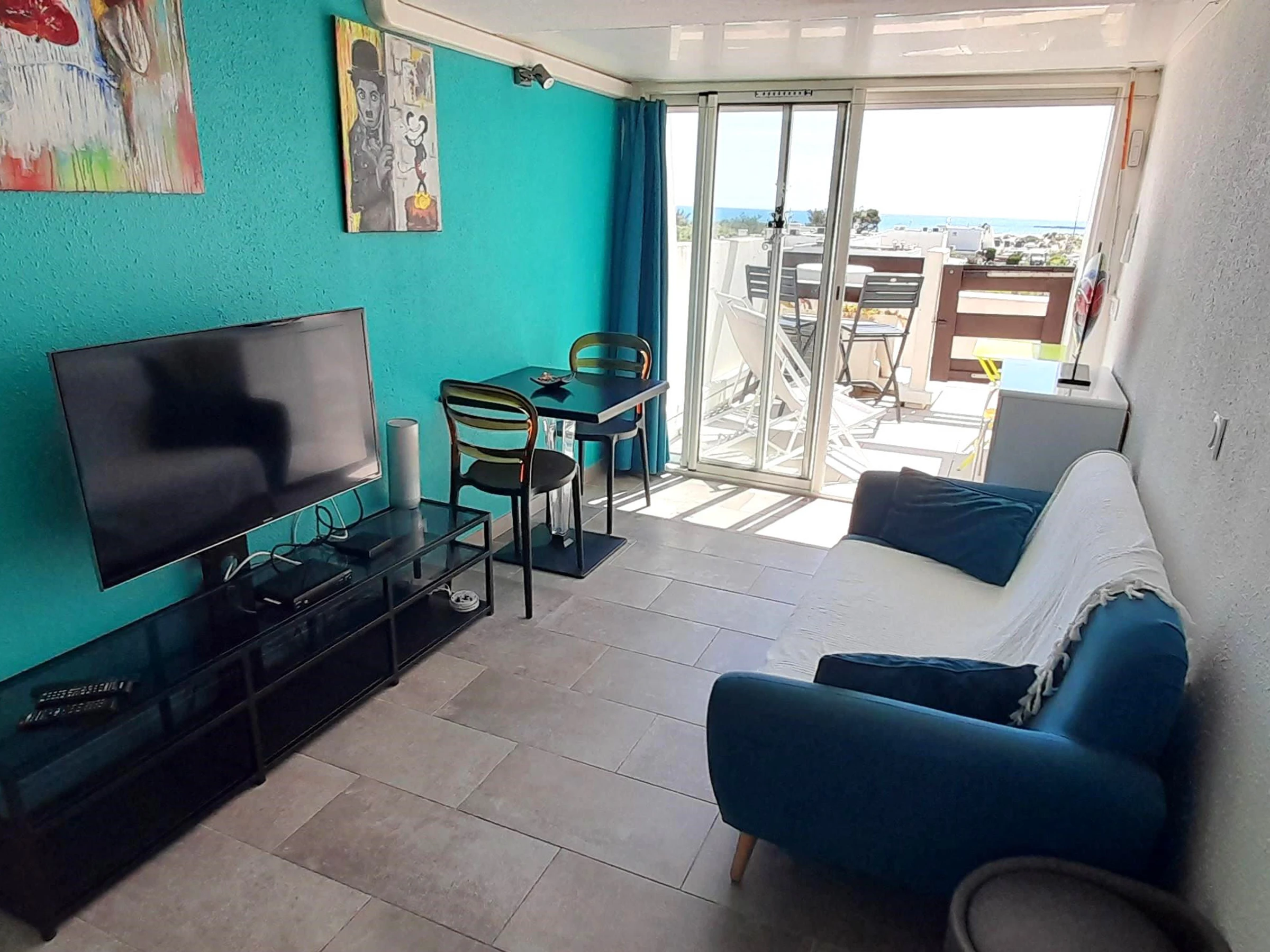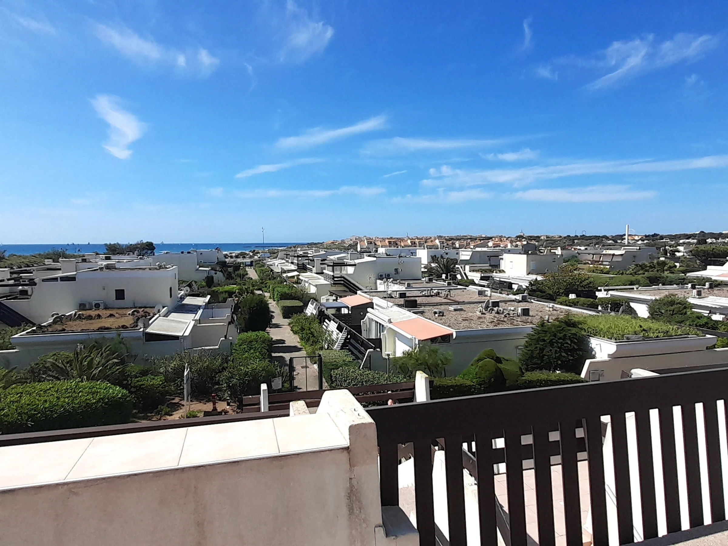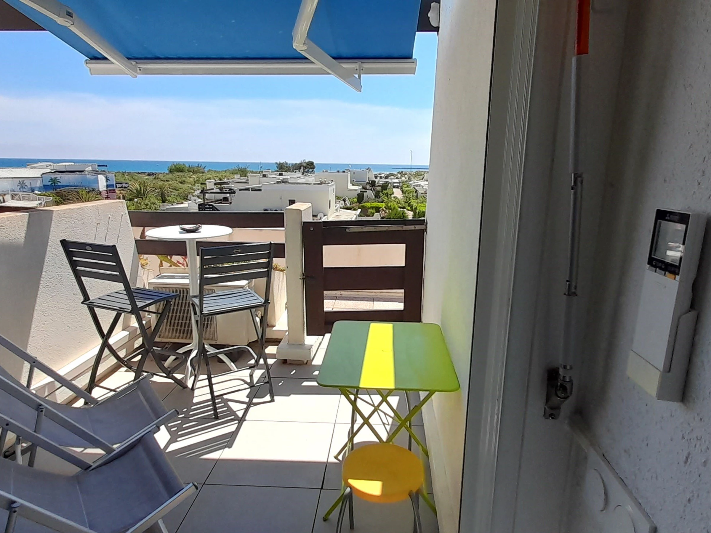 Appartement climatisé pour 2 personnes à Port Nature colline 2, au 2ème étage sans ascenseur, le long de la coursive. Orientation Sud. Une chambre avec un lit en 140 cm. Coin cuisine avec grand frigidaire, micro ondes, cafetière Nespresso et à filtre, bouilloire, grille pain, télévision, coffre fort, aspirateur, petit lave linge et sèche cheveux. Vue mer. Terrasse et store banne. WIFI. Parking n° 385.