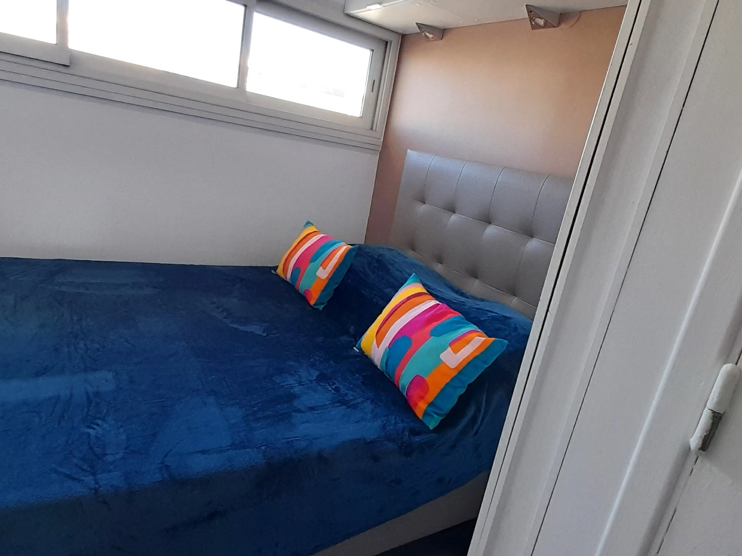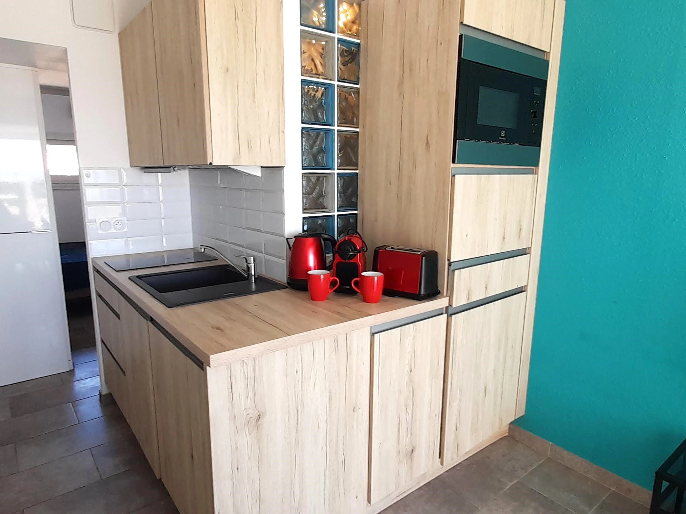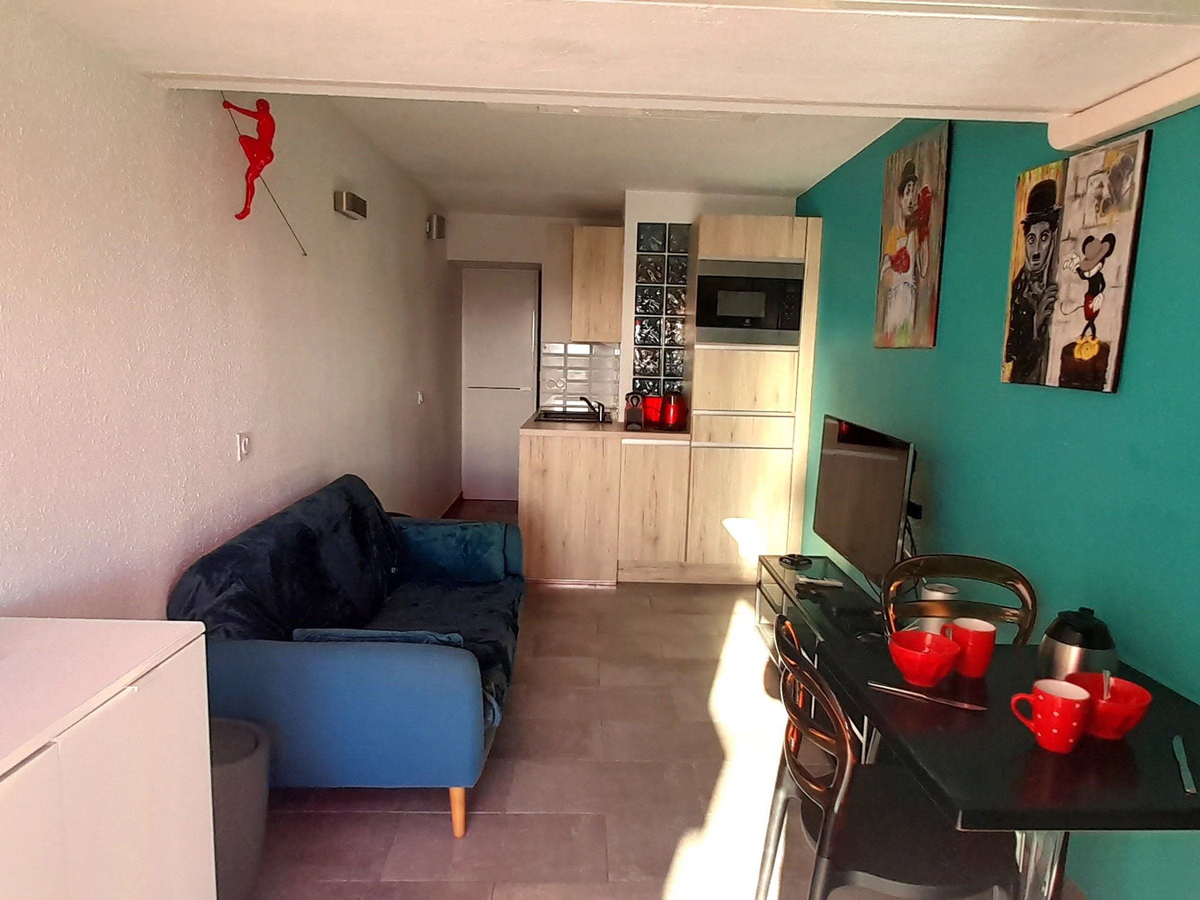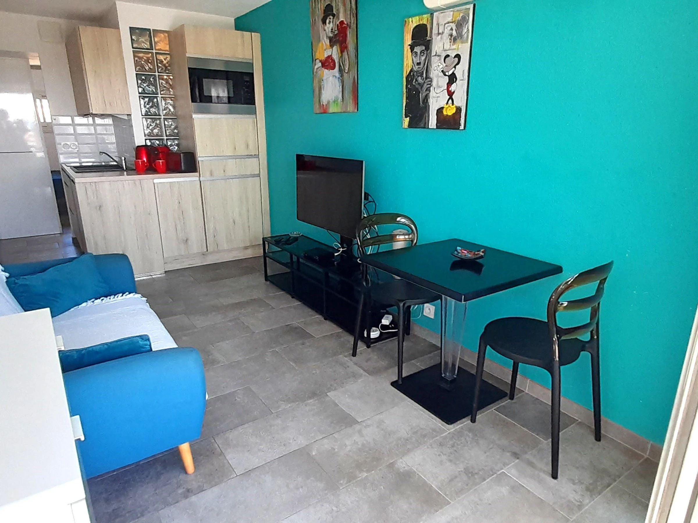Appartement climatisé pour 2 personnes à Port Nature colline 2, au 2ème étage sans ascenseur, le long de la coursive. Orientation Sud. Une chambre avec un lit en 140 cm. Coin cuisine avec grand frigidaire, micro ondes, cafetière Nespresso et à filtre, bouilloire, grille pain, télévision, coffre fort, aspirateur, petit lave linge et sèche cheveux. Vue mer. Terrasse et store banne. WIFI. Parking n° 385.