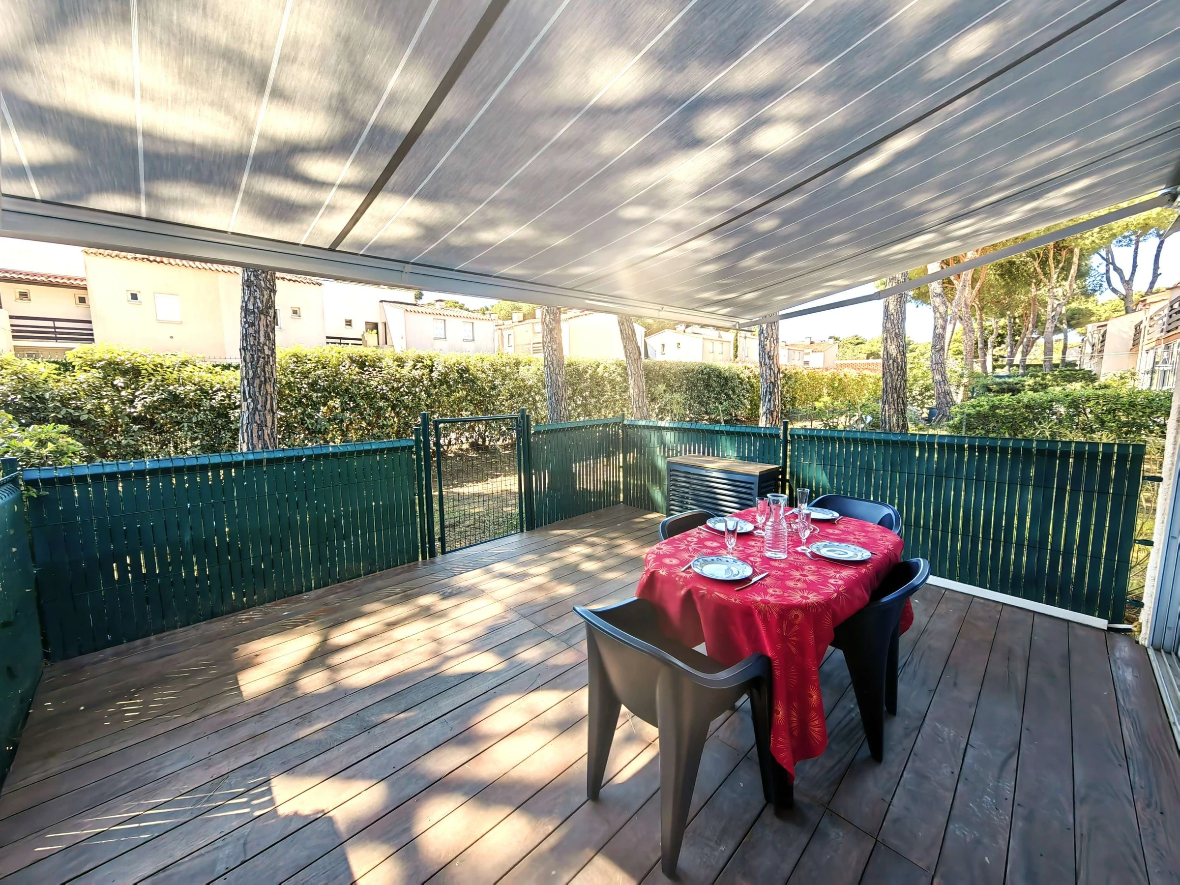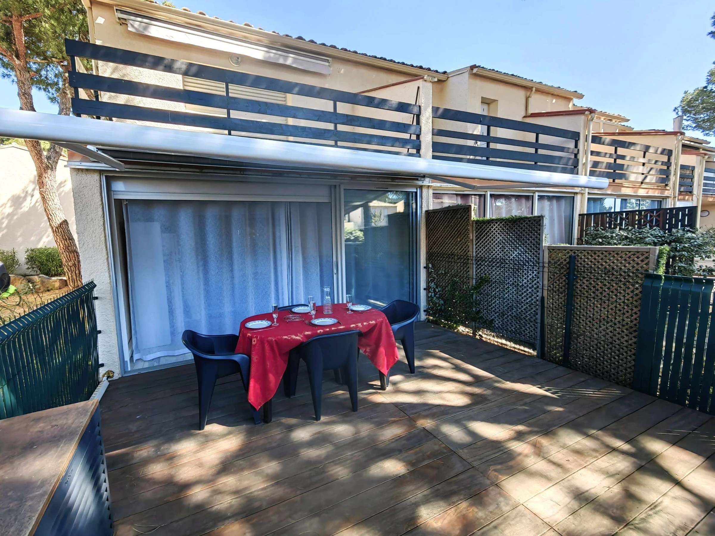 Sur la terrasse, clôturée et entourée d'une haie , avec un store banne électrique, vous trouverez une table avec les chaises et deux transats.