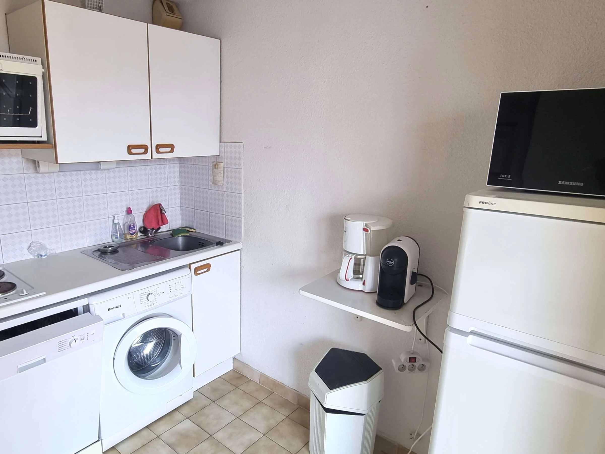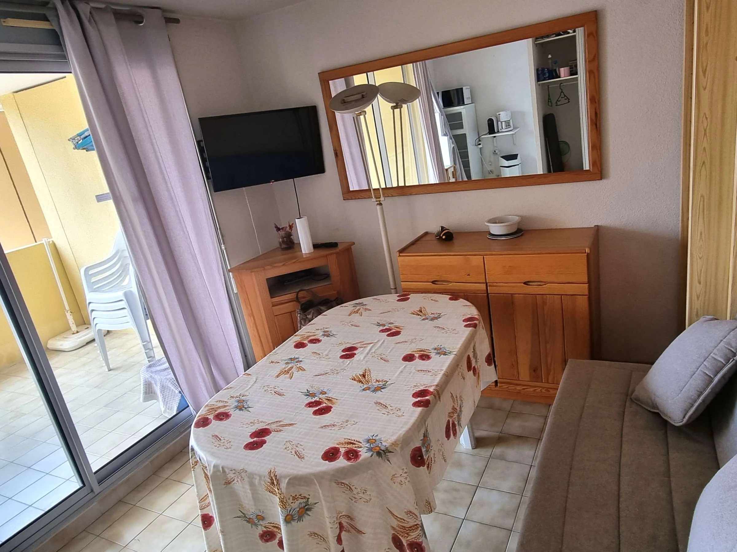 Salon lumineux, canapé convertible et meuble de rangement, accès direct sur la terrasse de 15m2, de même pour la cuisine, cette dernière est petite mais fonctionnelle et bien équipée (micro onde, mini four, plaque électriques 2 feux, lave linge, lave vaisselle, frigo,compartiment freezer, cafetière Nespresso).