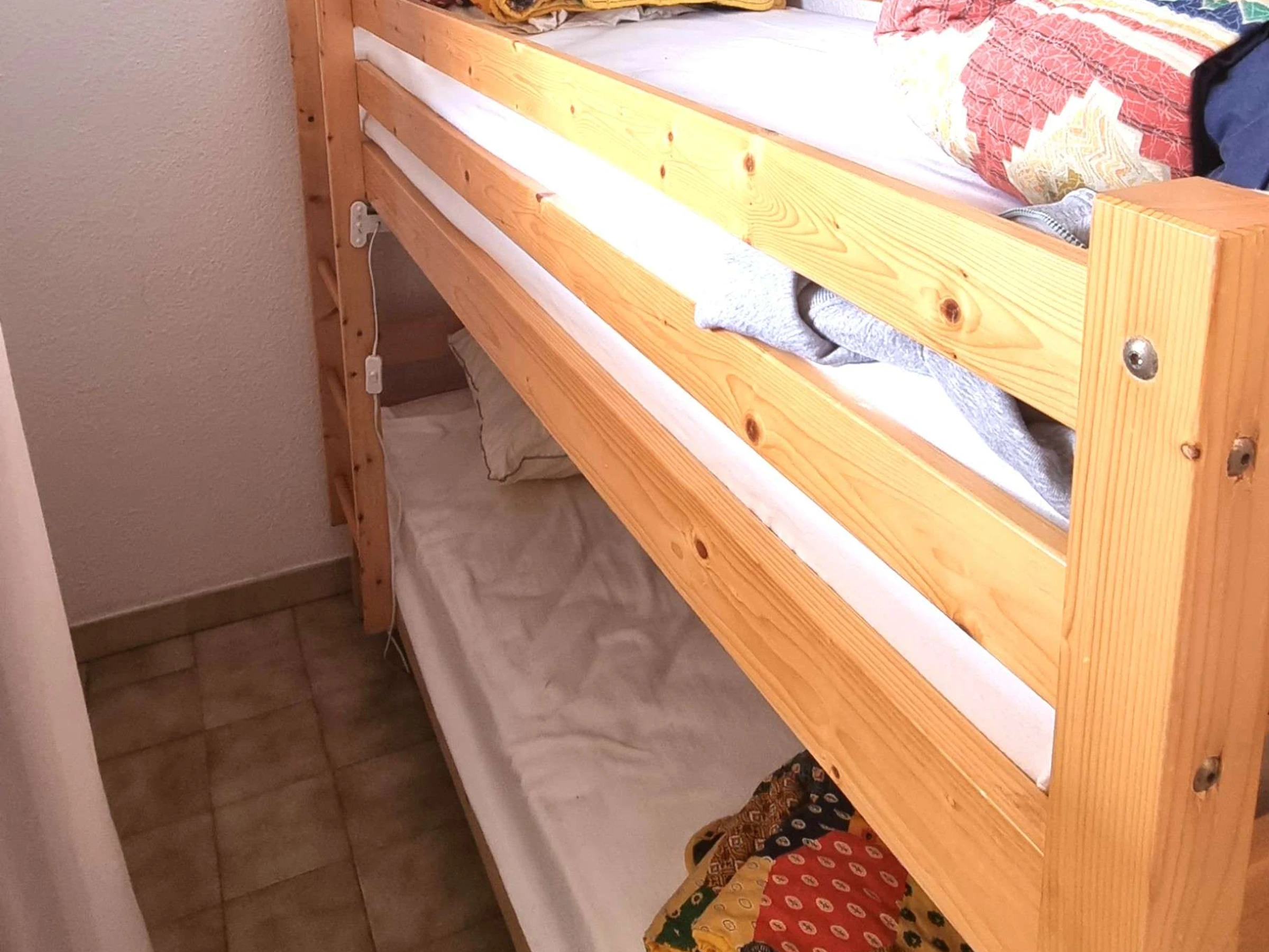 Cet appartement se compose à l'entrée d'une cabine avec fenêtre comportant un lit superposé ( 2 en 90), d'une chambre avec un lit double en 140 plus un meuble de rangement.
