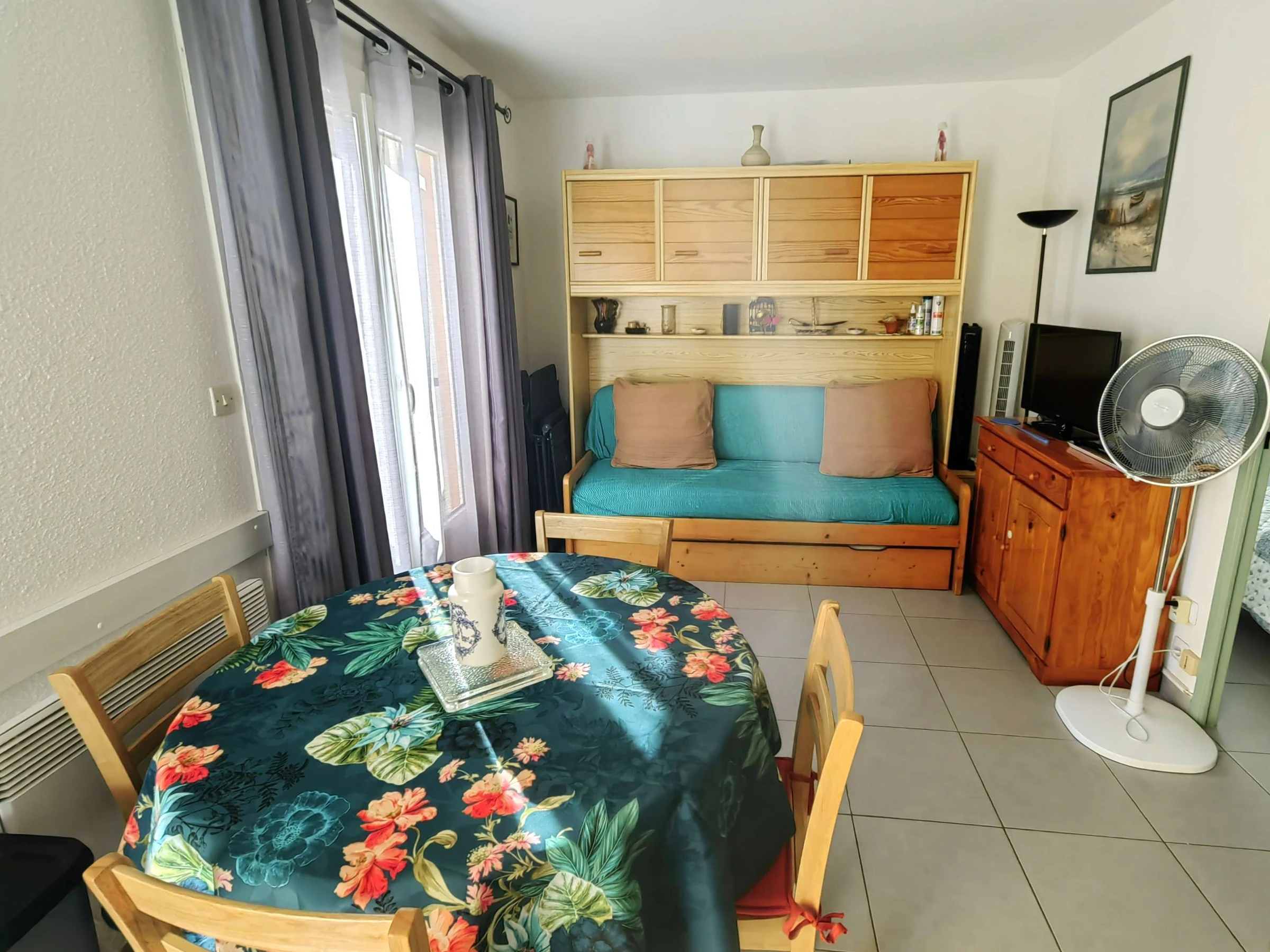 Dans le salon, un canapé convertible, la télé, coin repas (une table et 4 chaises).