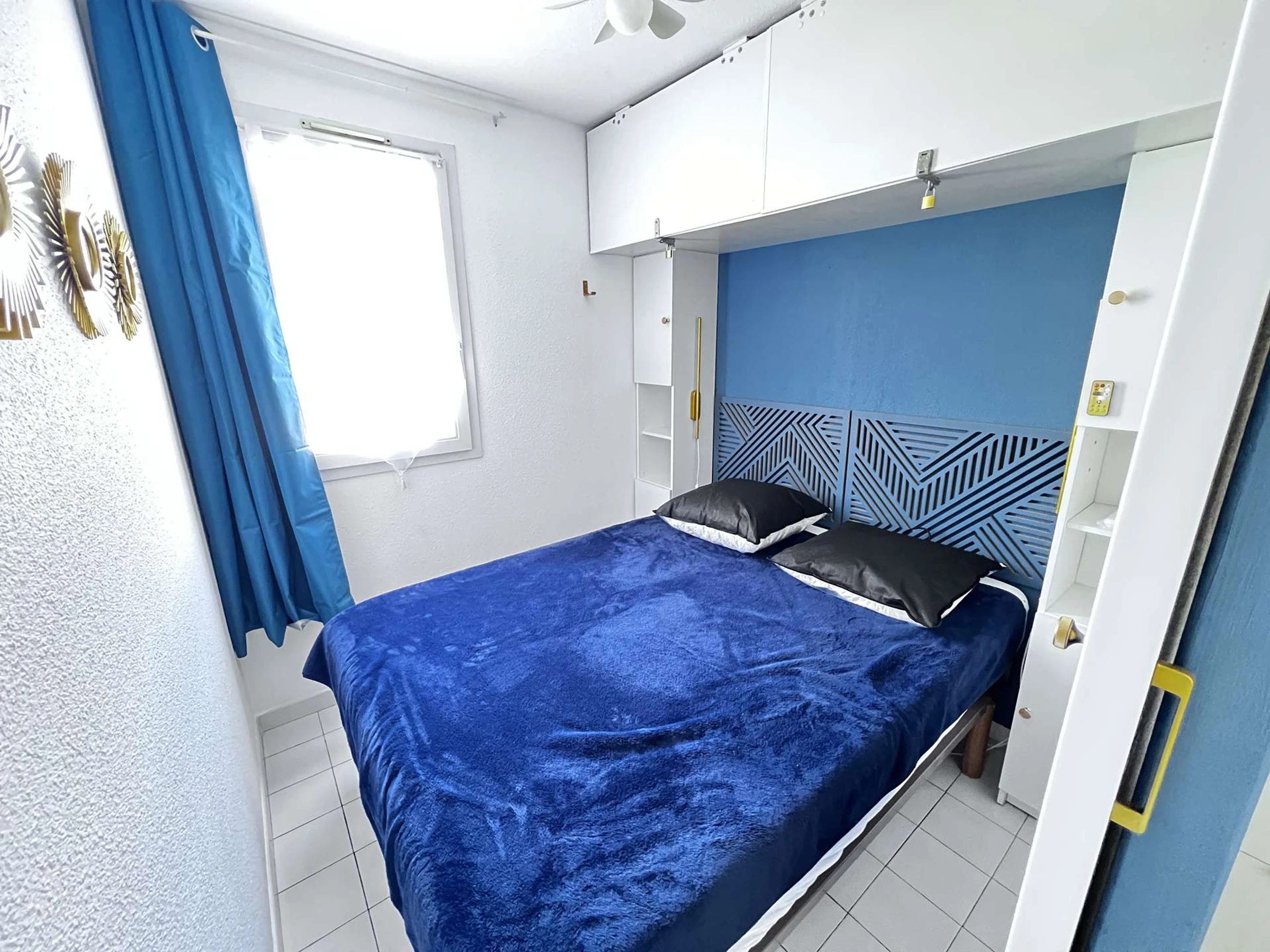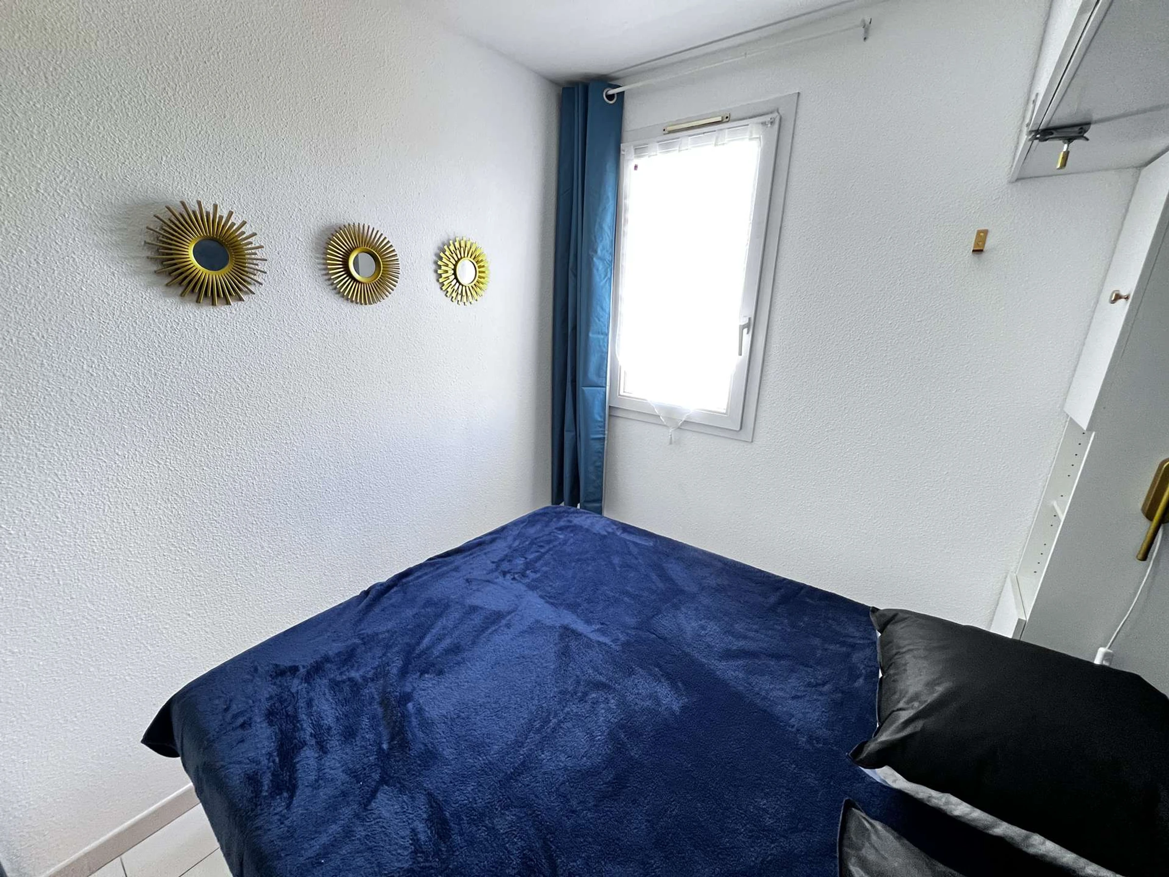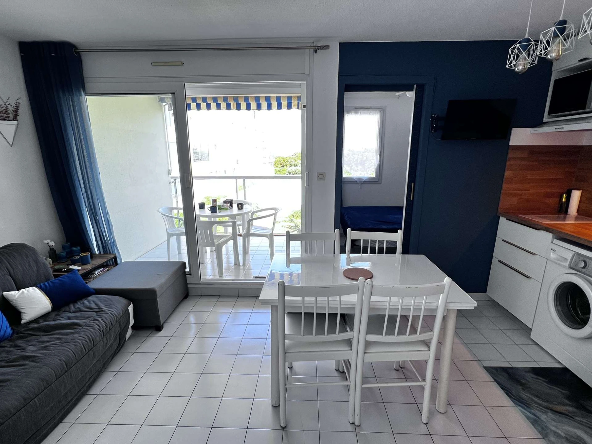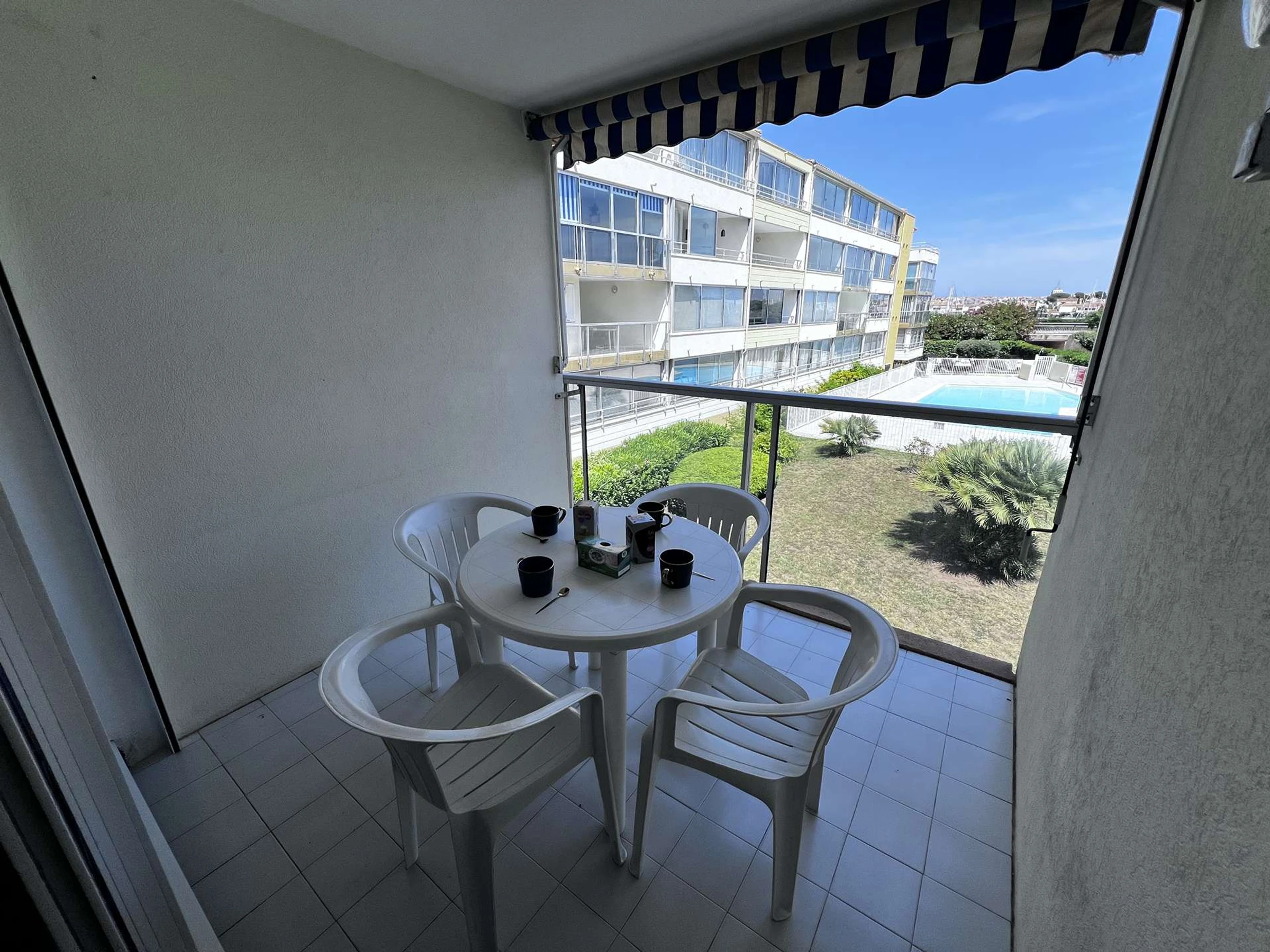 Entrée, séjour avec un canapé, TV, cabine (2 lits superposés en 70 cm 'attention lit supérieur interdit aux moins de 6 ans'), kitchenette équipée (micro-ondes, réfrigérateur-congélateur, plaques induction, vaisselles, etc...), salle de bain avec petite baignoire et lavabo, WC indépendant, chambre (un lit 2 personnes 140 cm), terrasse vue sur jardin et piscine de la résidence