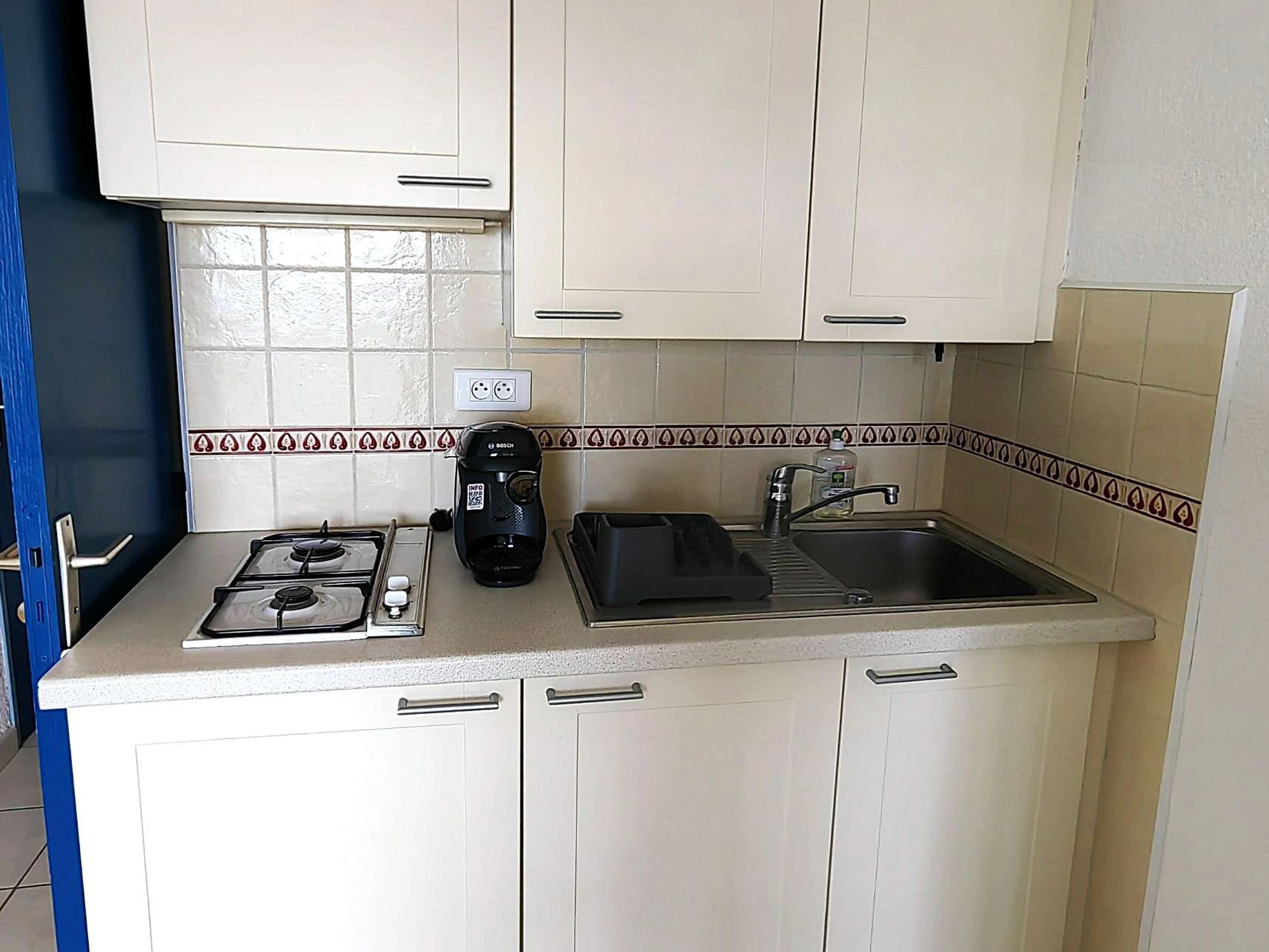 L'appartement dispose d'un salon donnant sur la terrasse, d'une cuisine équipée (micro-onde, 2 feux gaz, réfrigérateur/congelateur, cafetière électrique Tassimo).