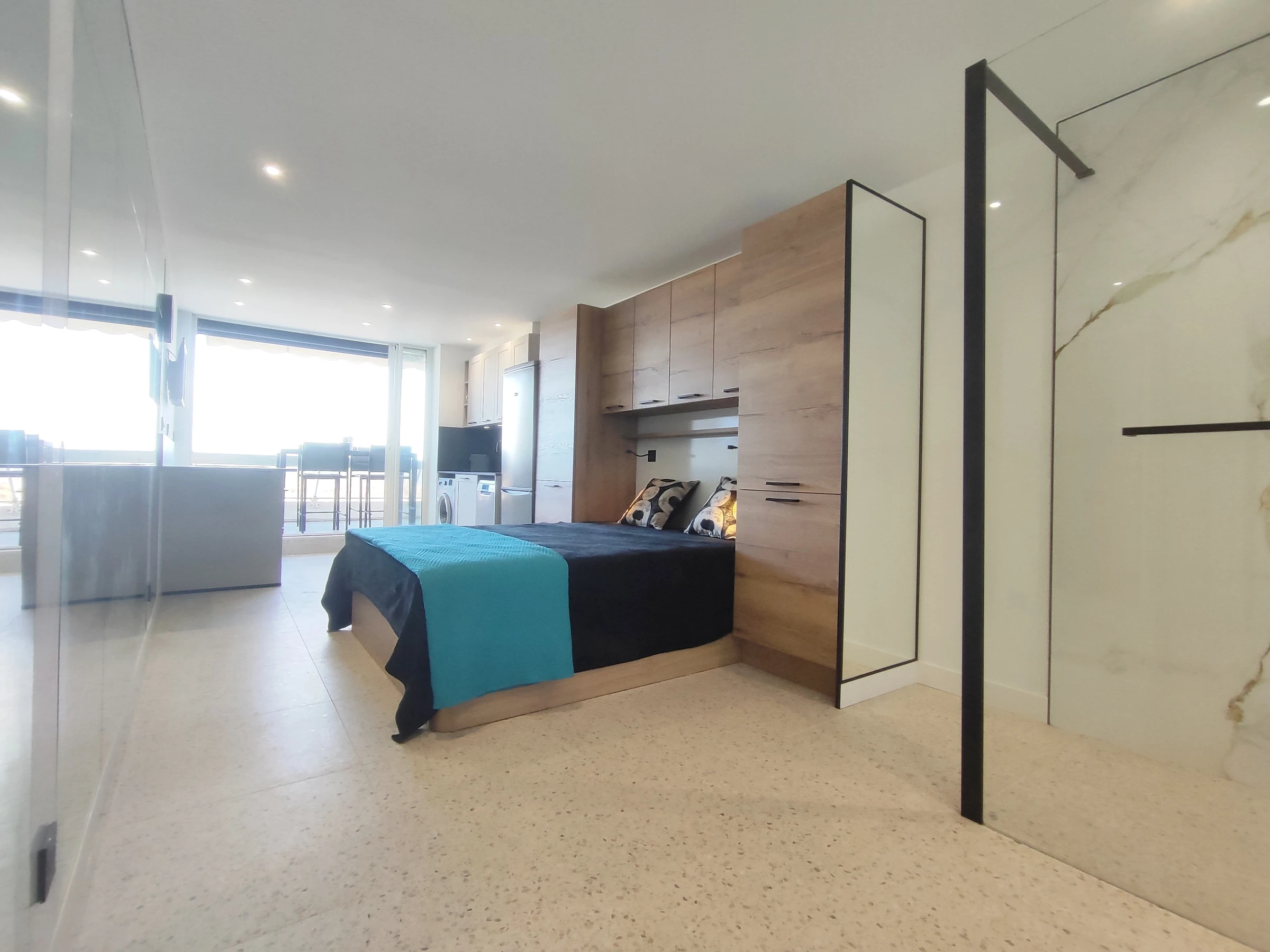 Studio climatisé pour 2 personnes, situé Résidence Heliopolis Bâtiment AB. Au 2ème étage avec ascenseur. Séjour avec lit 2 personnes en 160cm et coin cuisine équipée (lave-vaisselle, lave linge, four/ micro-ondes, cafetière nespresso...). Salle d'eau et wc séparés. Terrasse avec store, vue camping et mer. Parking privé N°5.