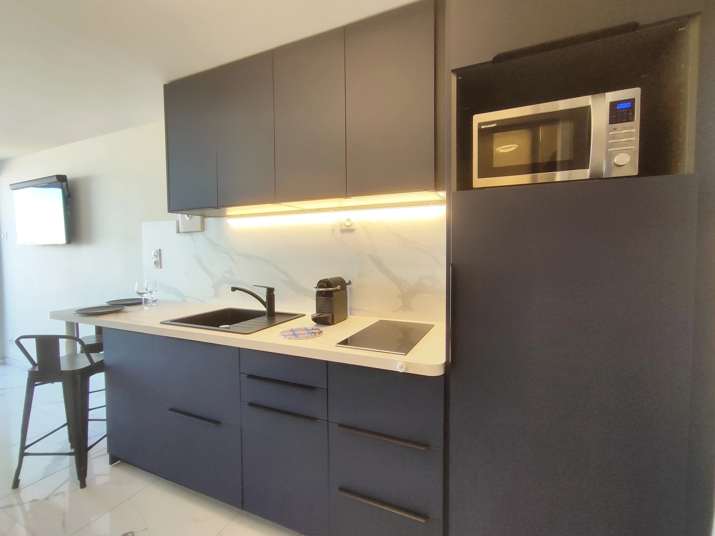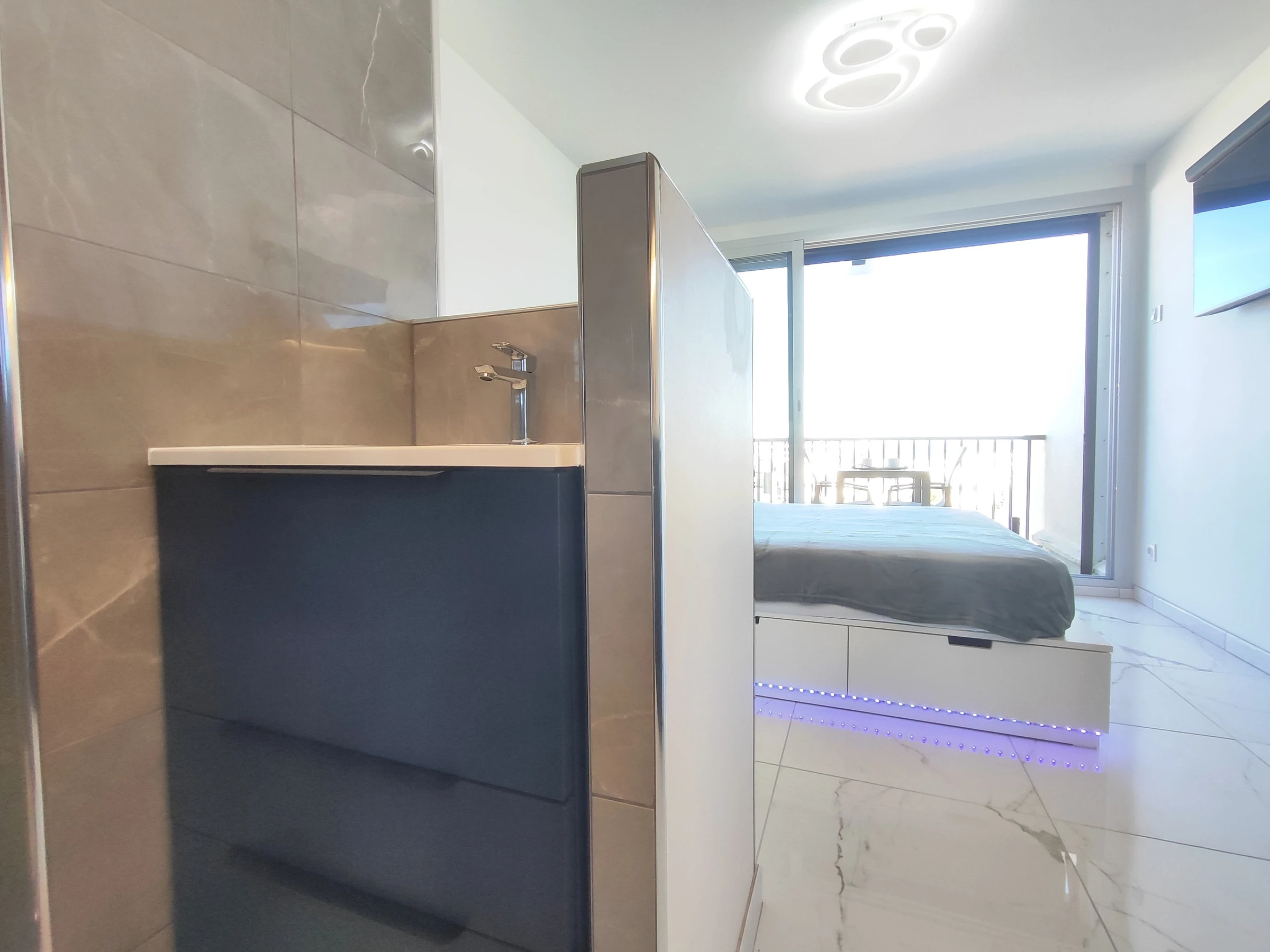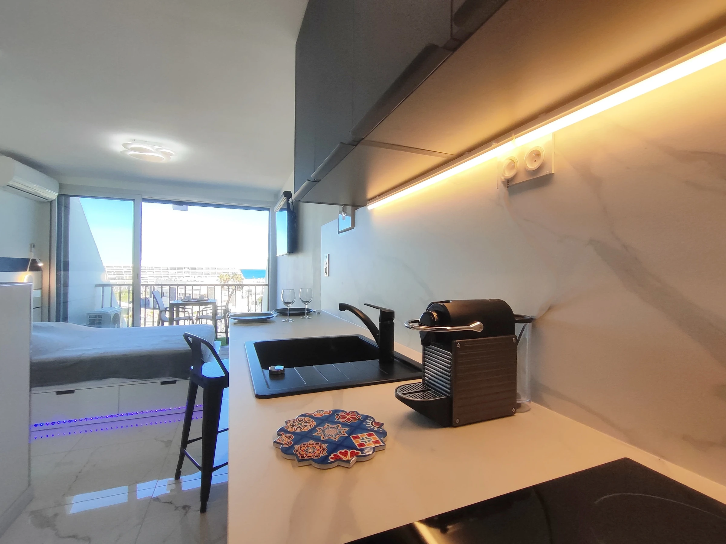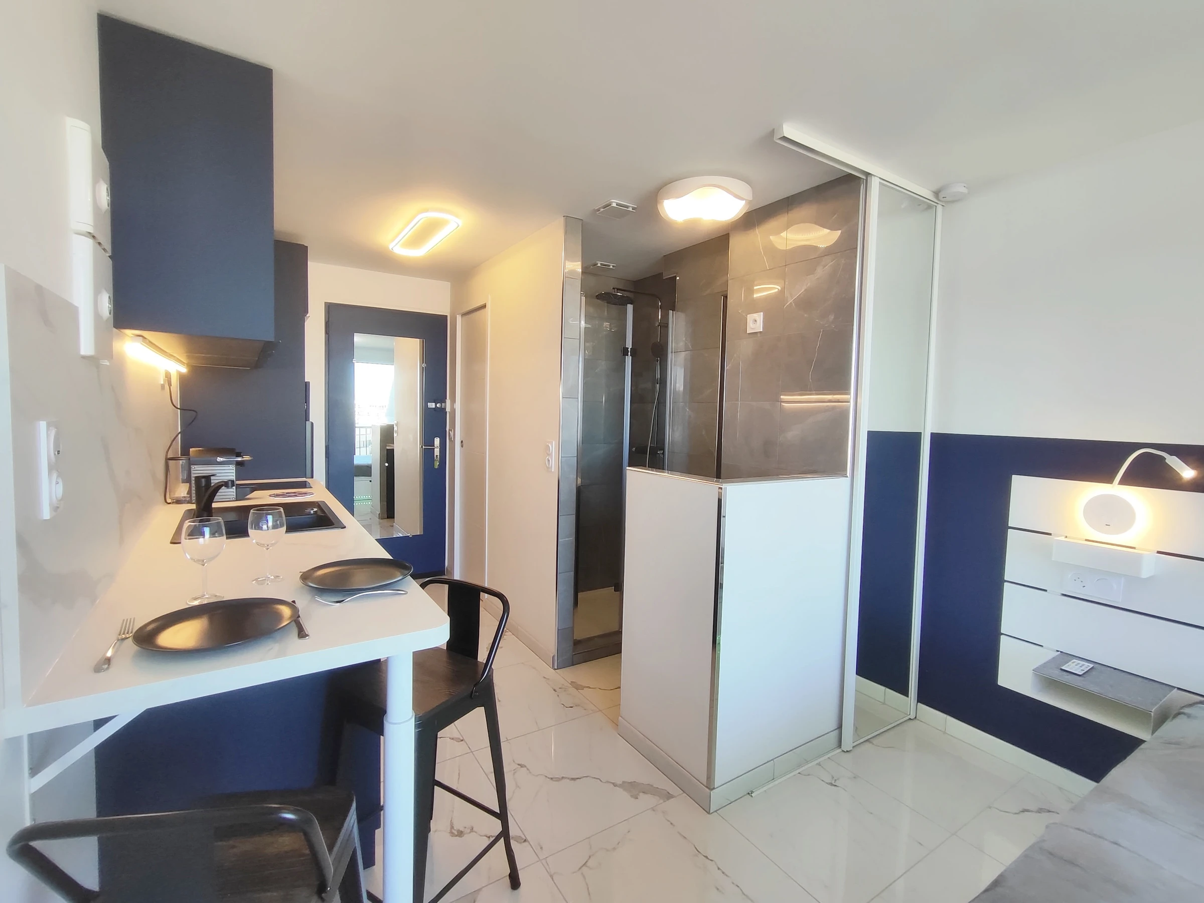 Studio climatisé, rénové, pour 2 personnes, situé à Héliopolis, entrée FGH, au 4ème étage sans ascenseur, orienté Est, vue mer, à 150 m de la plage. Séjour avec un lit en 140 cm avec tiroirs de rangement. Coin cuisine avec frigidaire, micro-ondes, grille pain, bouilloire, cafetière Nespresso, lave-vaisselle, sèche cheveux. Salle d'eau dans le séjour. WC séparés. Balcon. Pas de parking privatif.