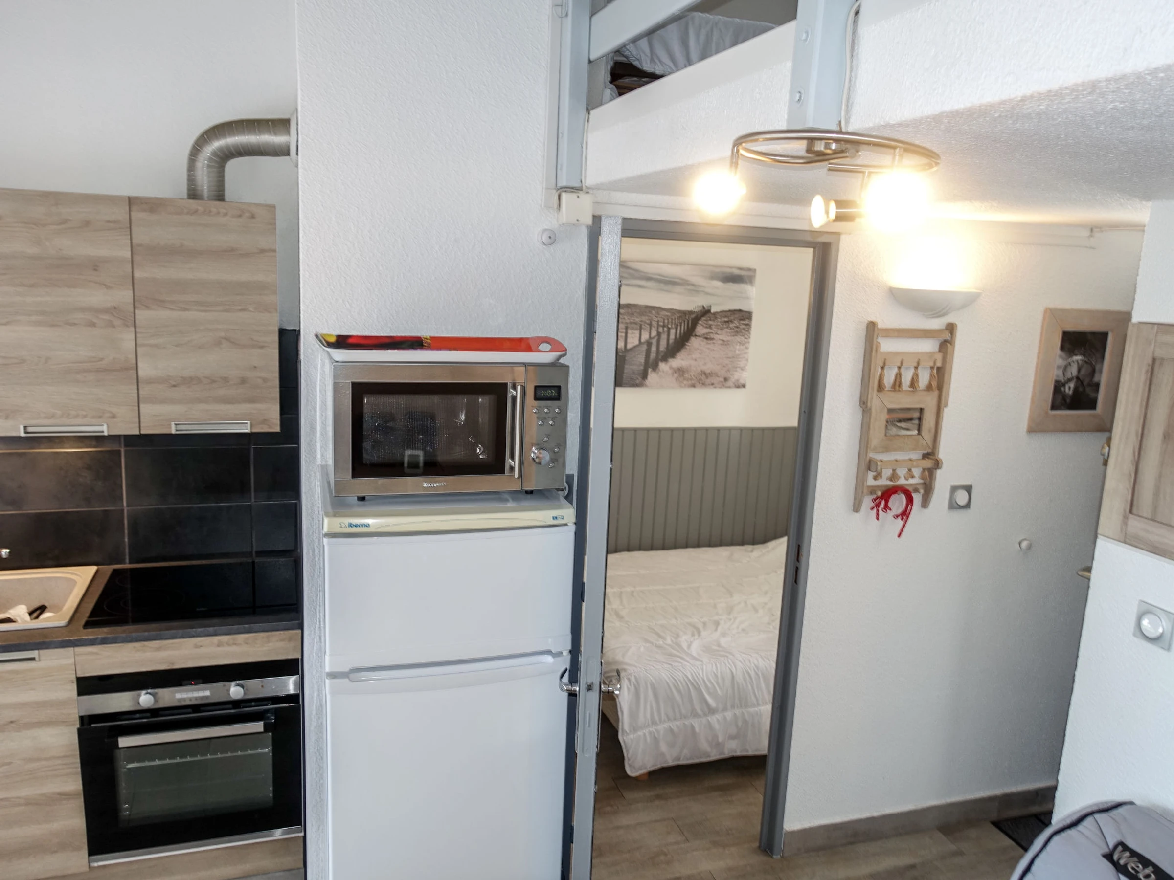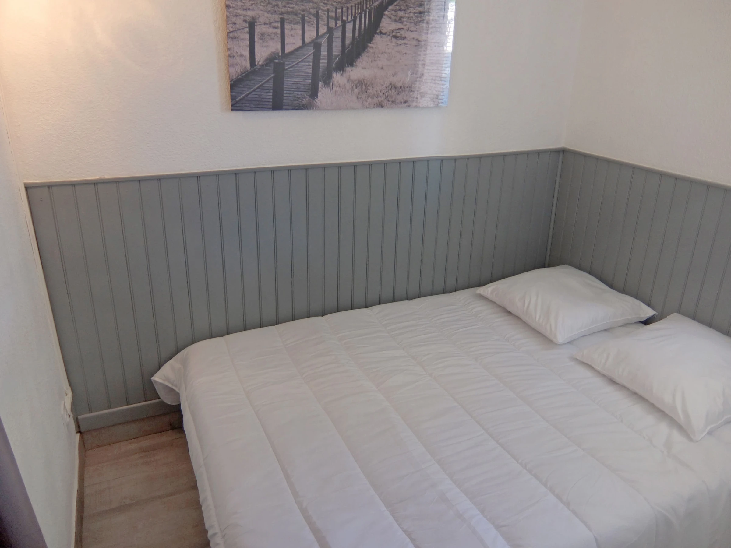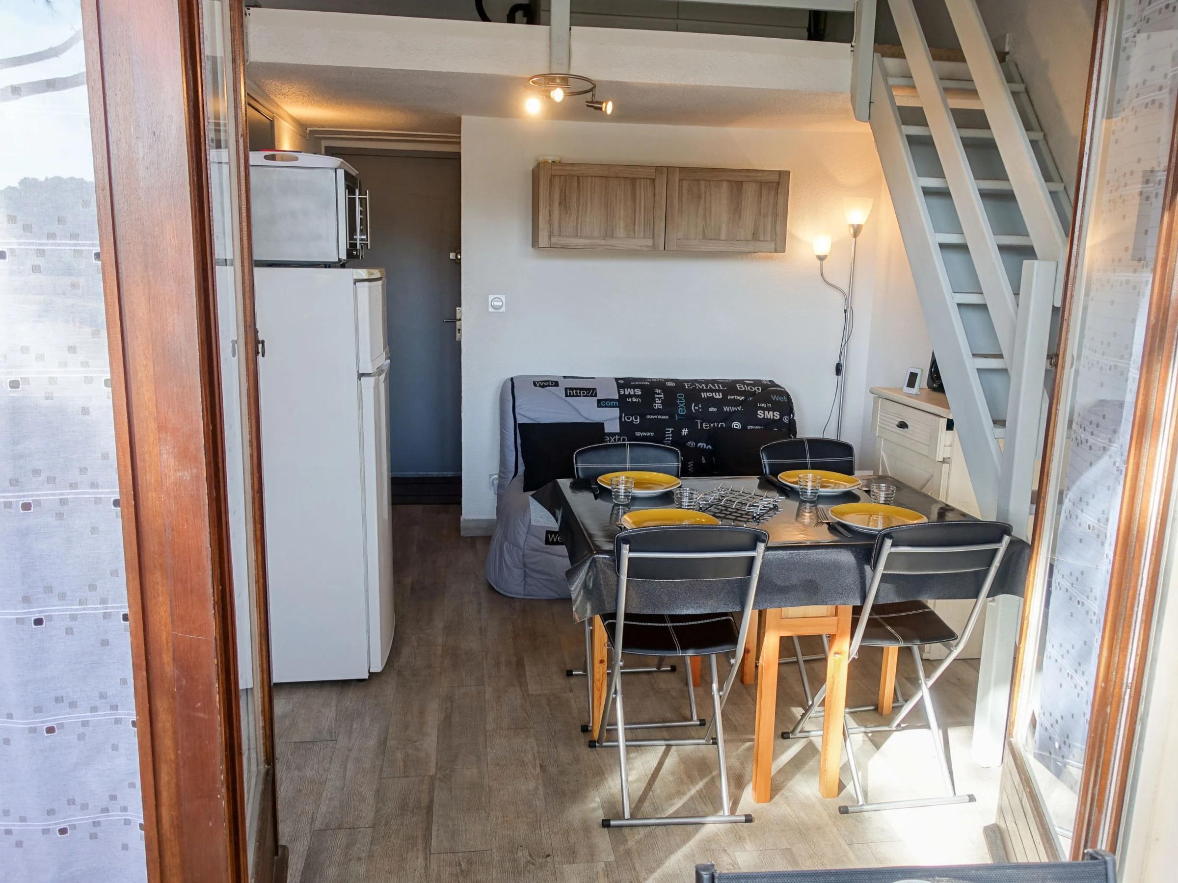Apt 2 pièces 41 m2 sur 2 niveaux au 1er étage. Logement idéal pour 2 adultes + 2 enfants. Partiellement rénové en 2017, aménagement fonctionnel: séjour/salle à manger 12 m2 avec TV (écran plat), air-conditionné et chauffage à air chaud. Sortie sur la terrasse. 1 chambre avec 1 grand-lit (140 cm, longueur 190 cm). Cuisine ouverte (four, 4 plaques vitrocéramiques, four micro-ondes, congélateur, cafetière électrique). Douche/WC. Chauffage électrique. À l'étage supérieur: galerie ouverte avec 2 lits (90 cm, longueur 190 cm). Terrasse 7 m2. Meubles de terrasse. A disposition: lave-linge. Internet (Connexion WIFI, gratuit). Place de parking No 223. Veuillez noter: adapté(e) aux familles. Détecteur de fumée.