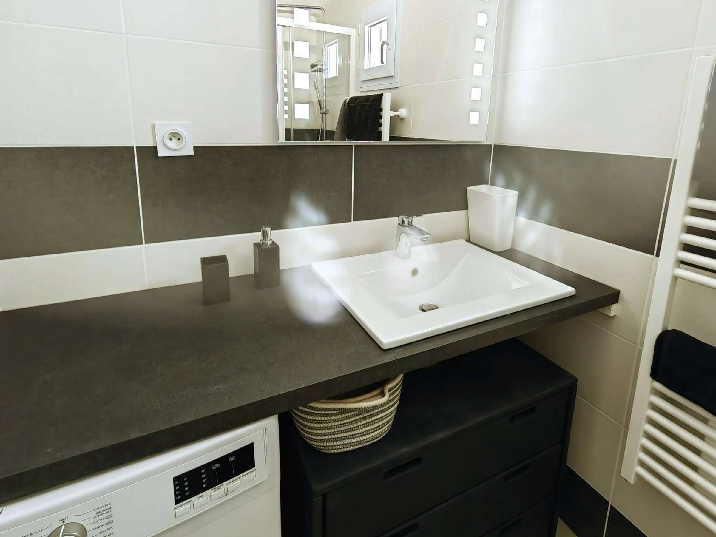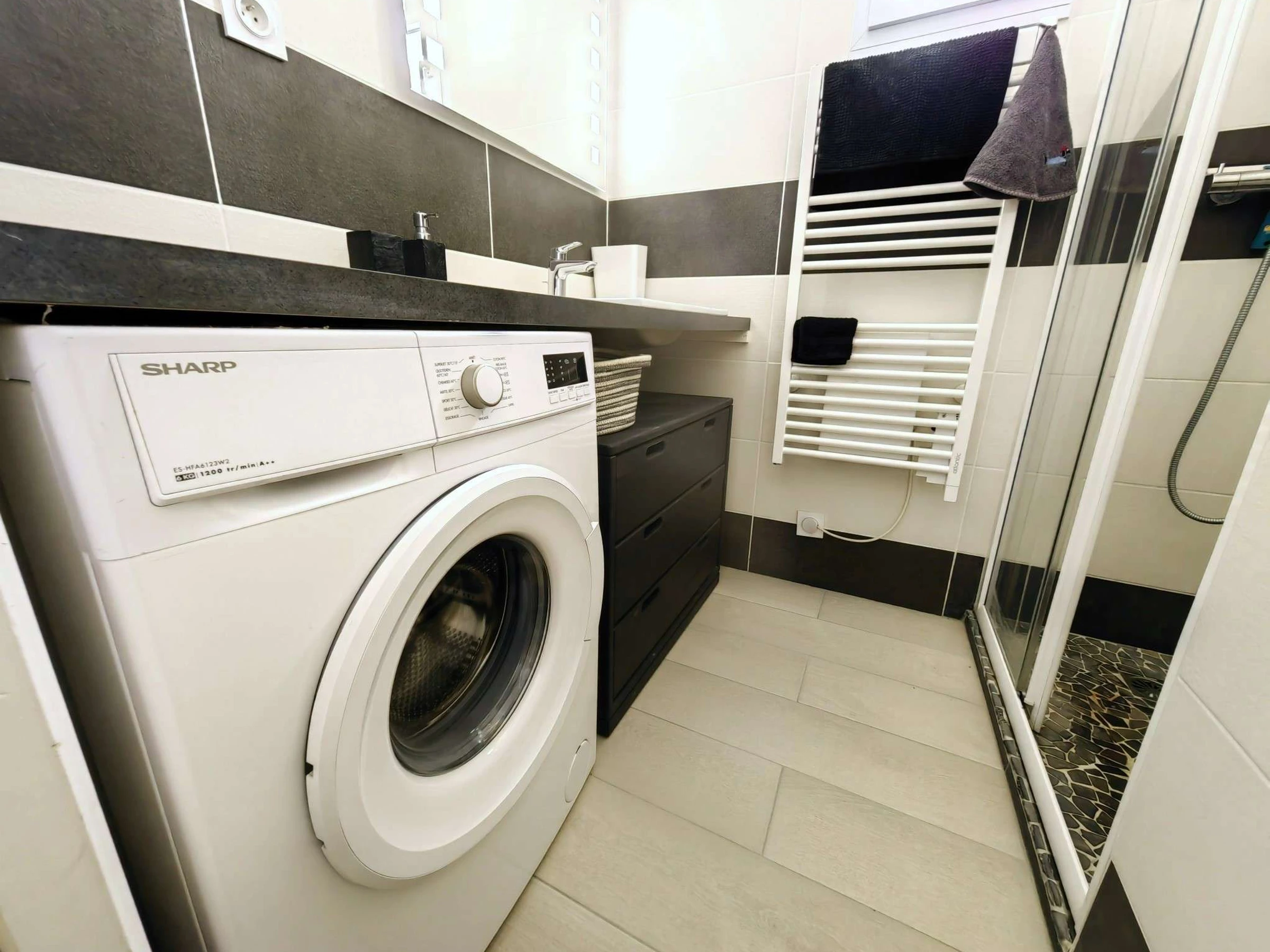 La salle de bain avec sa douche à l'italienne et lave-linge au rez de chausse également.