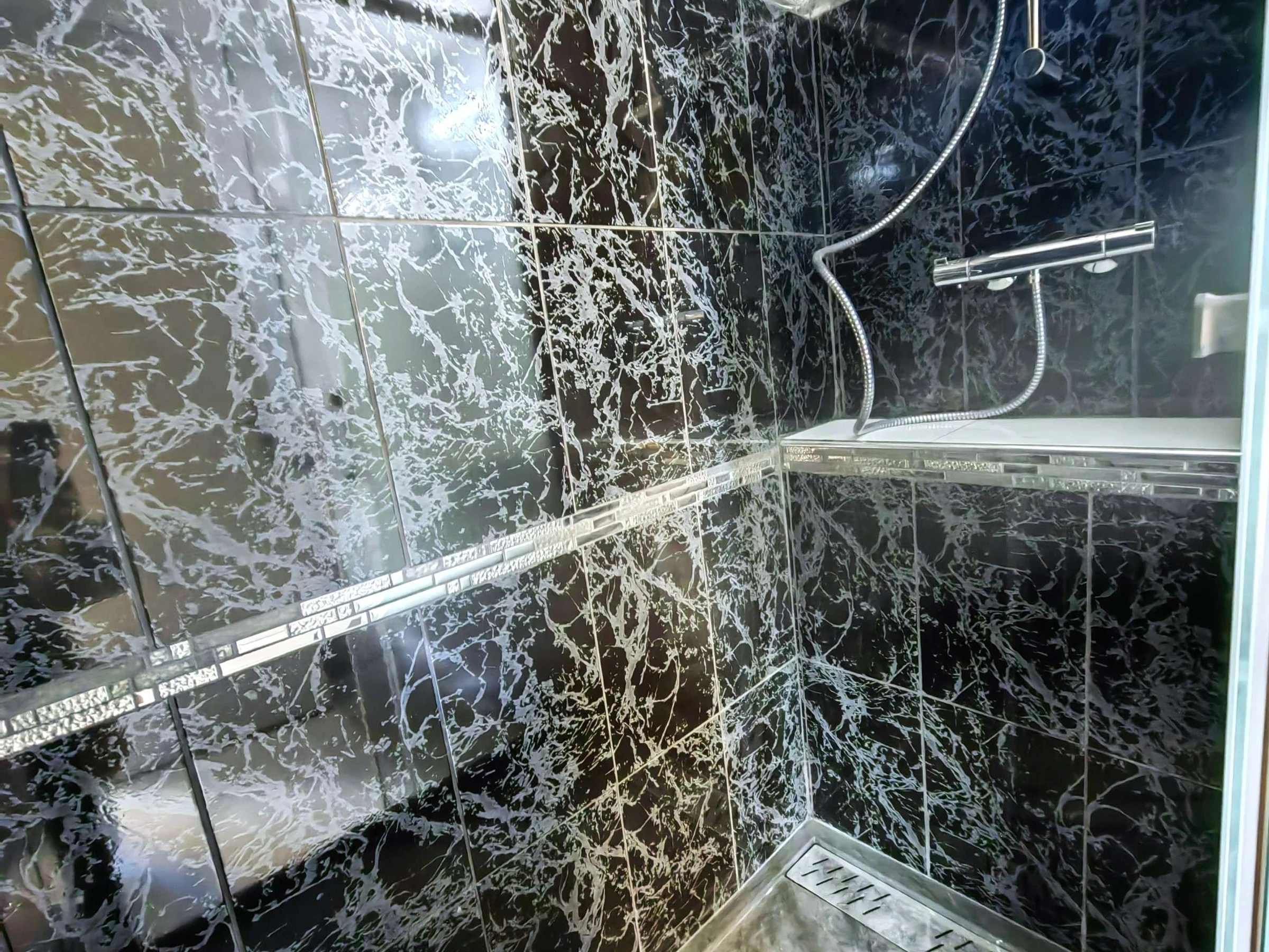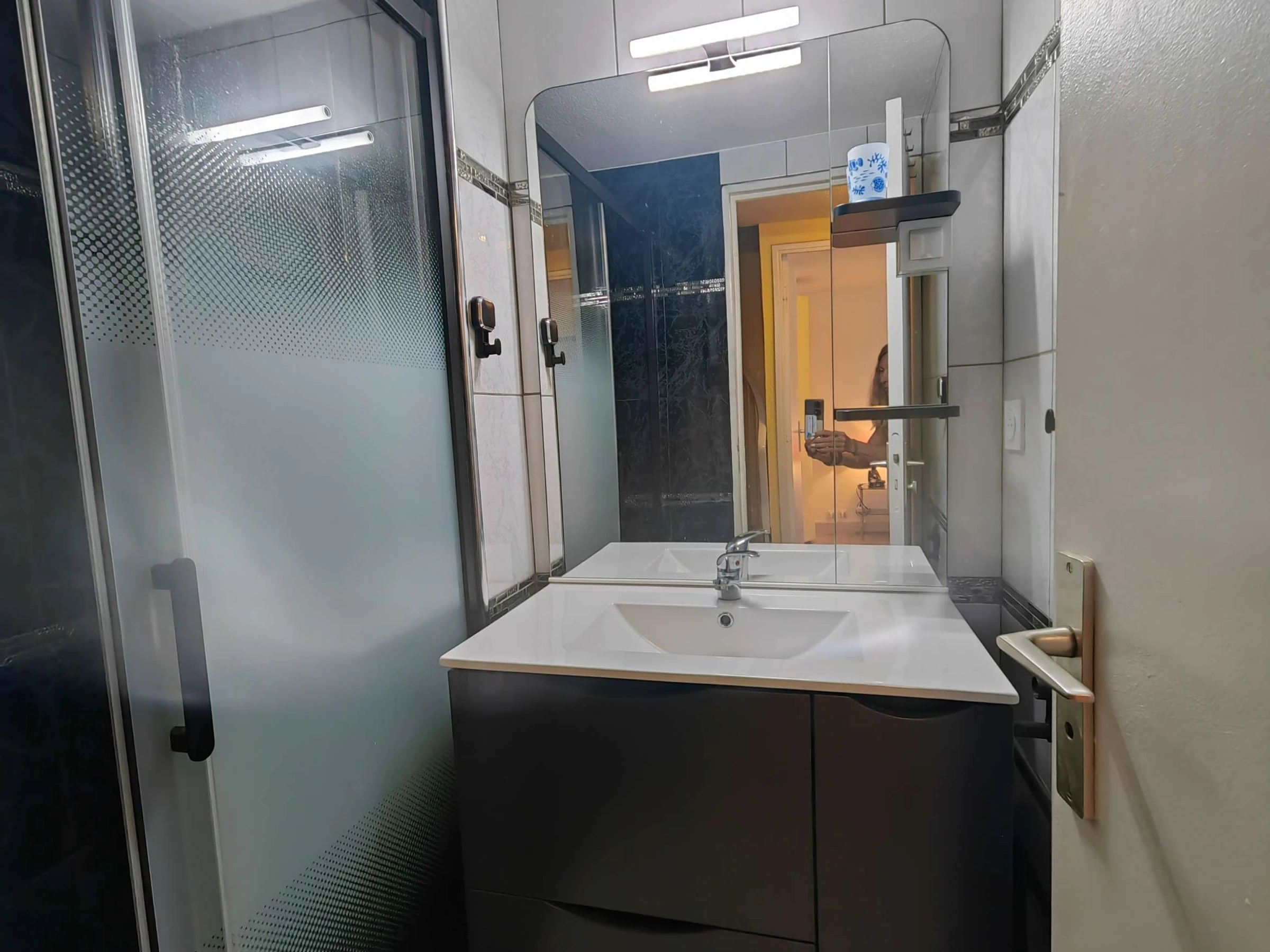 Salle de bain moderne avec un douche, rénovée en 2025. WC séparé.