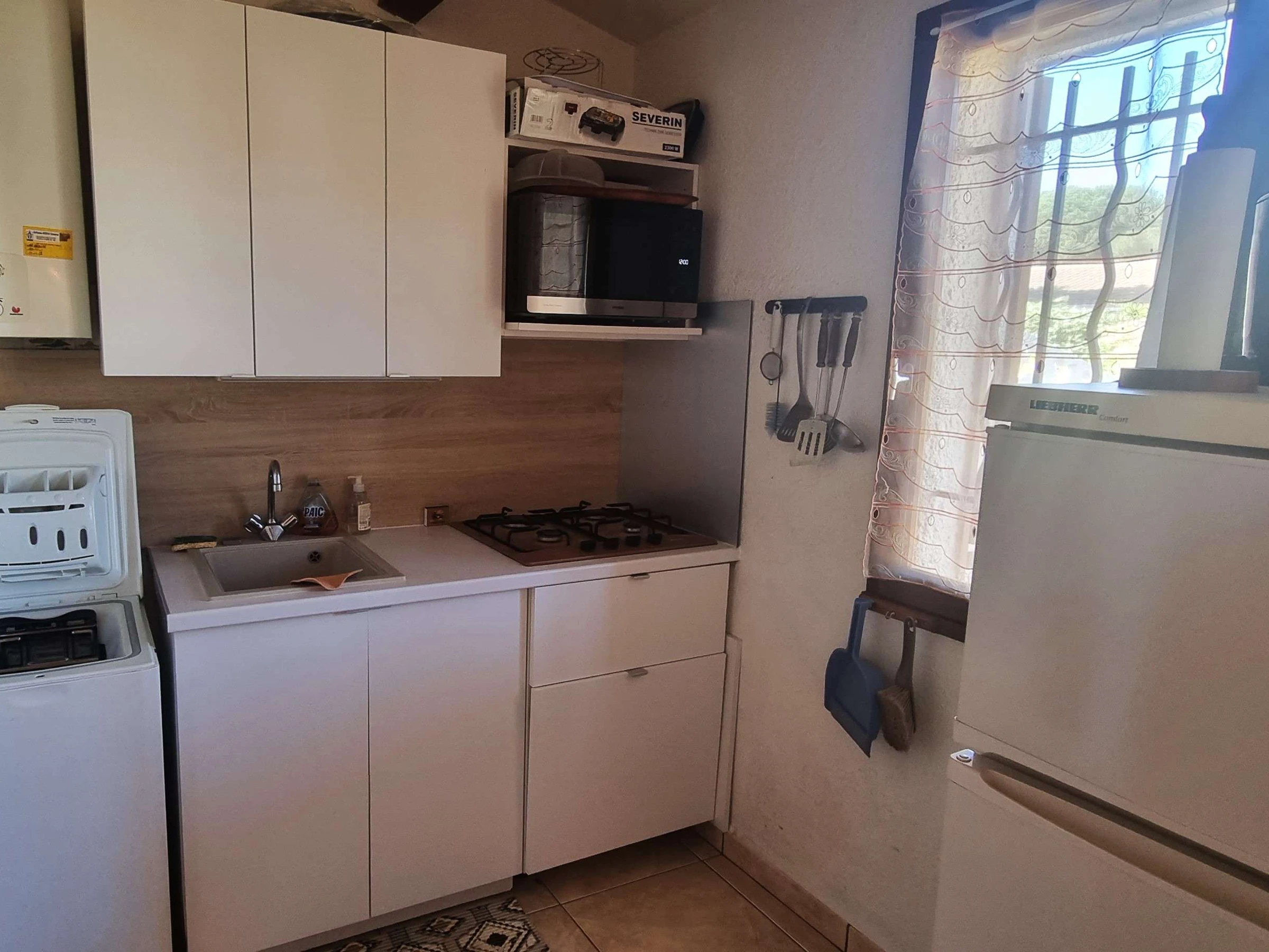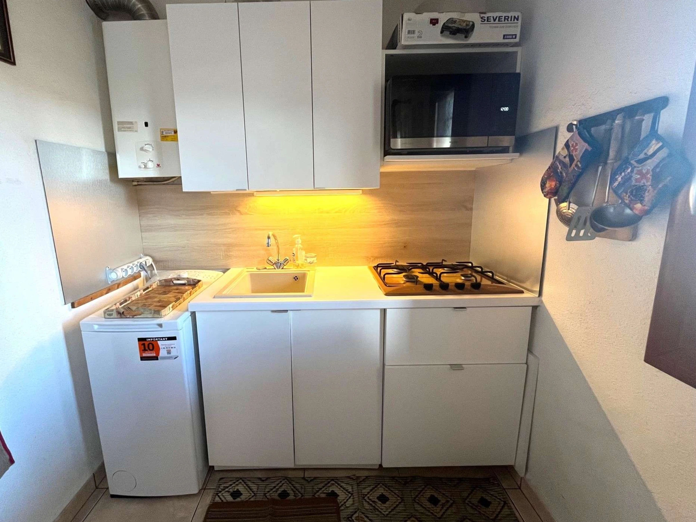 Cuisine équipée (gaz 4 feux, four - micro-onde, lave-vaisselle, réfrigérateur - congélateur, lave-linge).