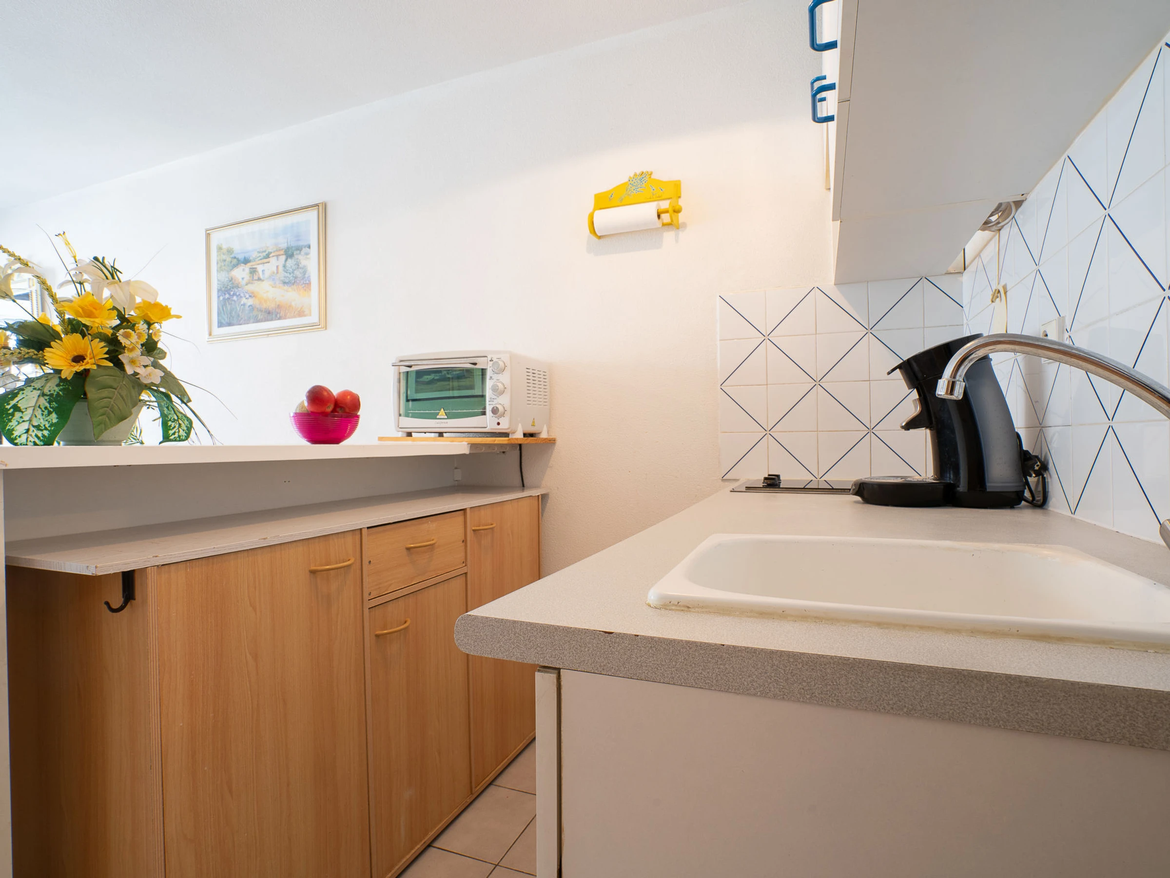 Apt 2 pièces 30 m2 au 1er étage. Partiellement rénové en 2019: séjour/salle à manger avec 1 divan-lit double (130 cm, longueur 200 cm), TV. Sortie sur la loggia. 1 chambre avec 1 grand-lit (140 cm, longueur 190 cm). Coin cuisine (2 plaques de cuisson, mini-four, lave-vaisselle, micro-ondes, congélateur). Douche, WC séparé. Loggia. Vue latérale sur la mer. A disposition: lave-linge. Internet (Connexion WIFI, en sus). Veuillez noter: pas de parking. Maximum 1 animal/ chien autorisé. Détecteur de fumée. Commerces, Bars-restaurants au pied de l'immeuble.