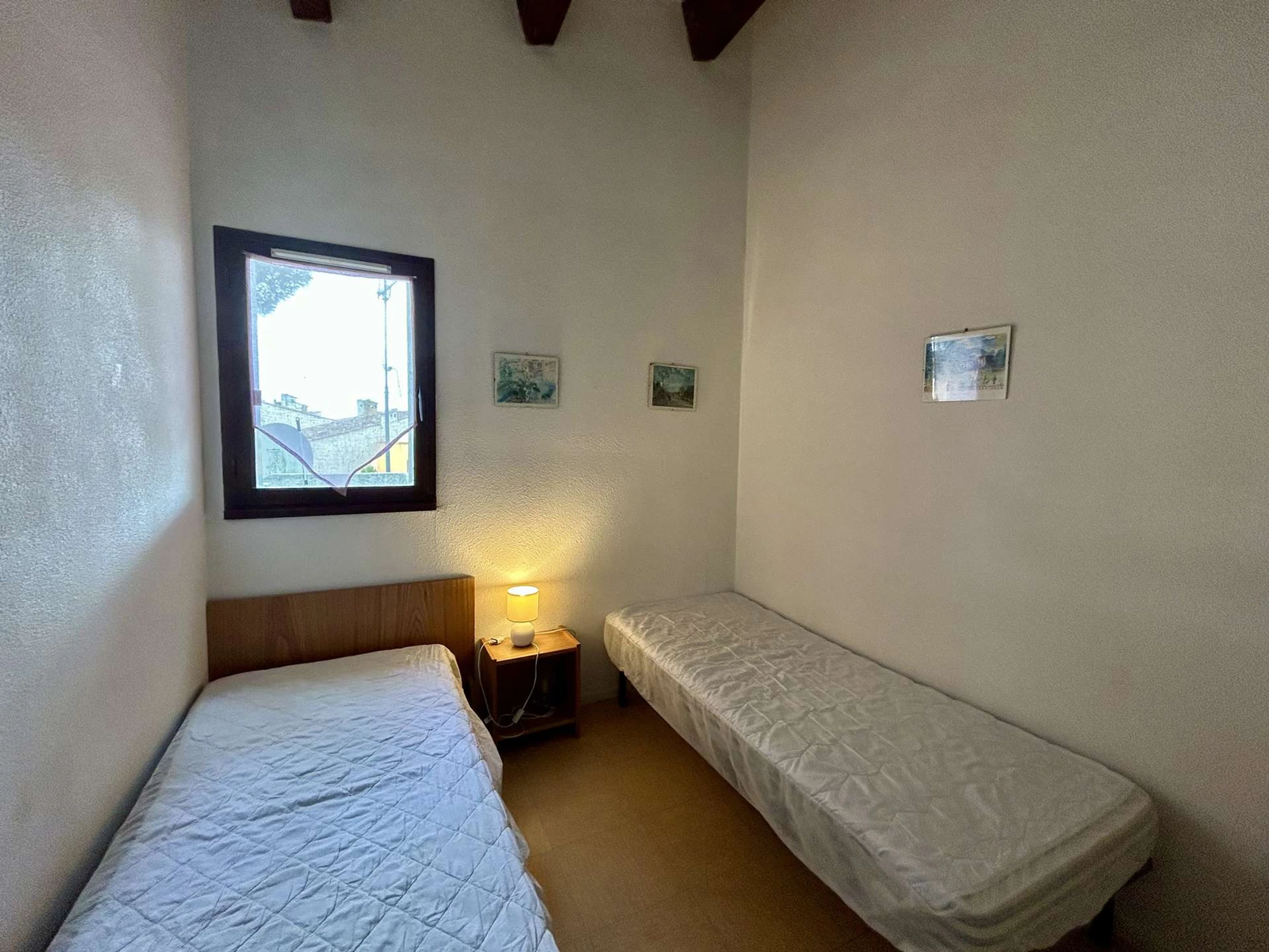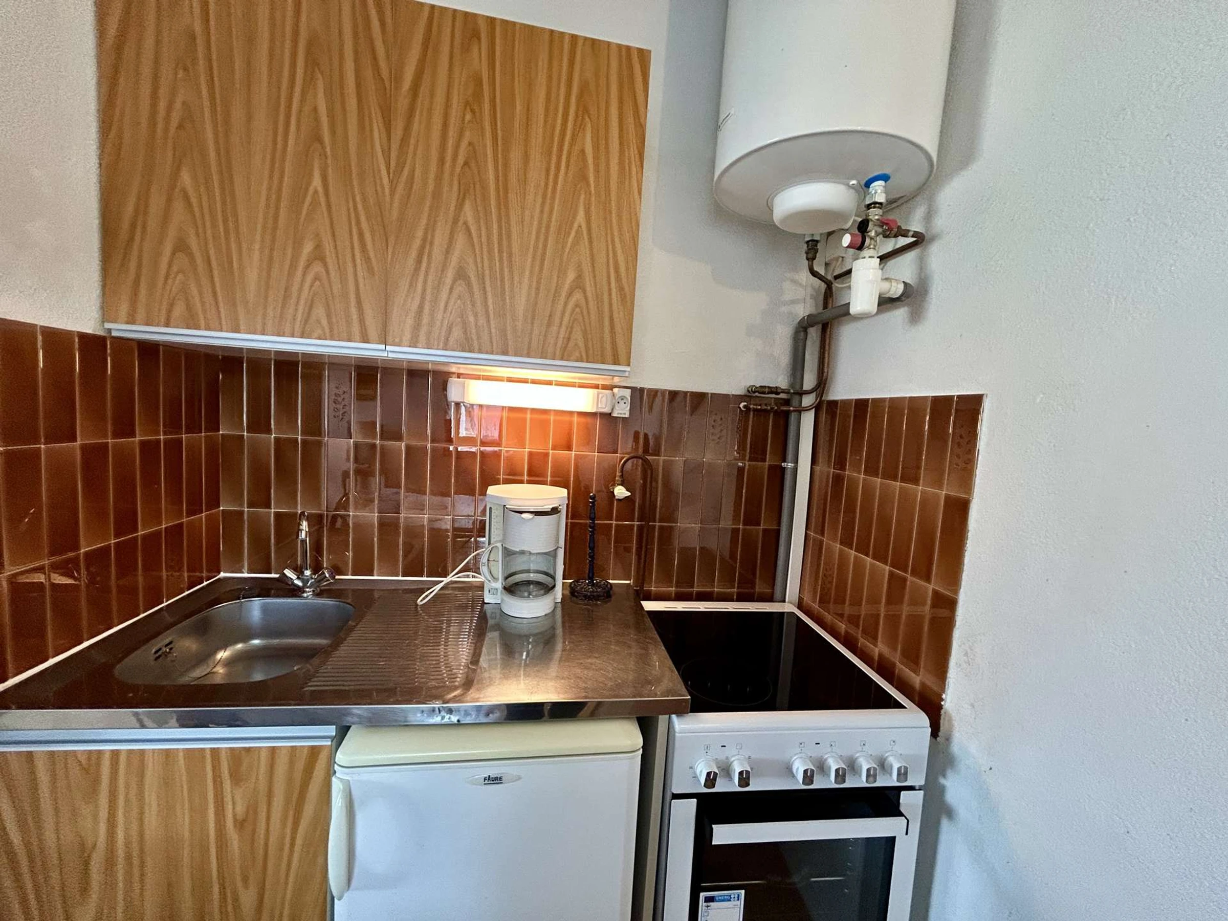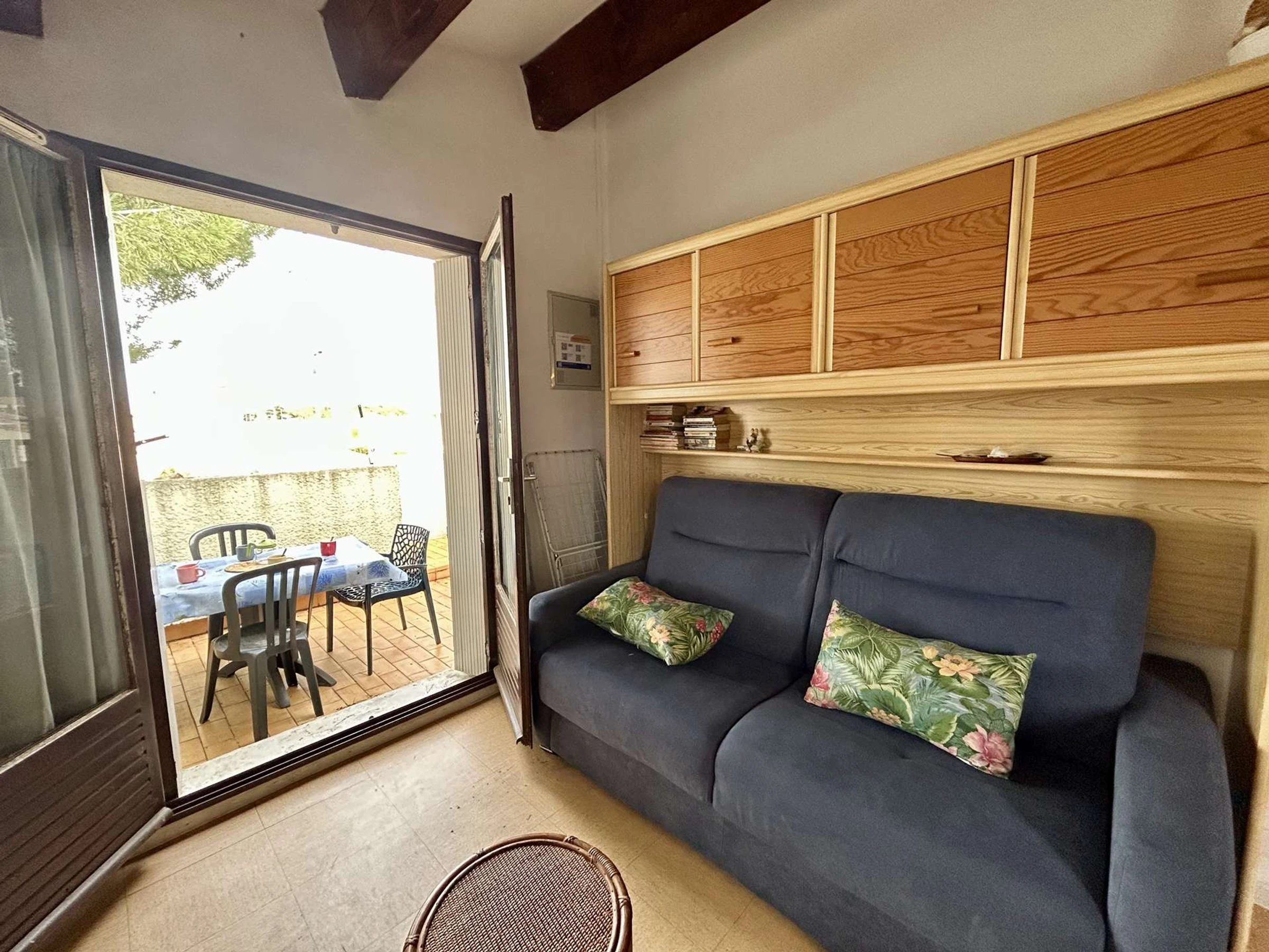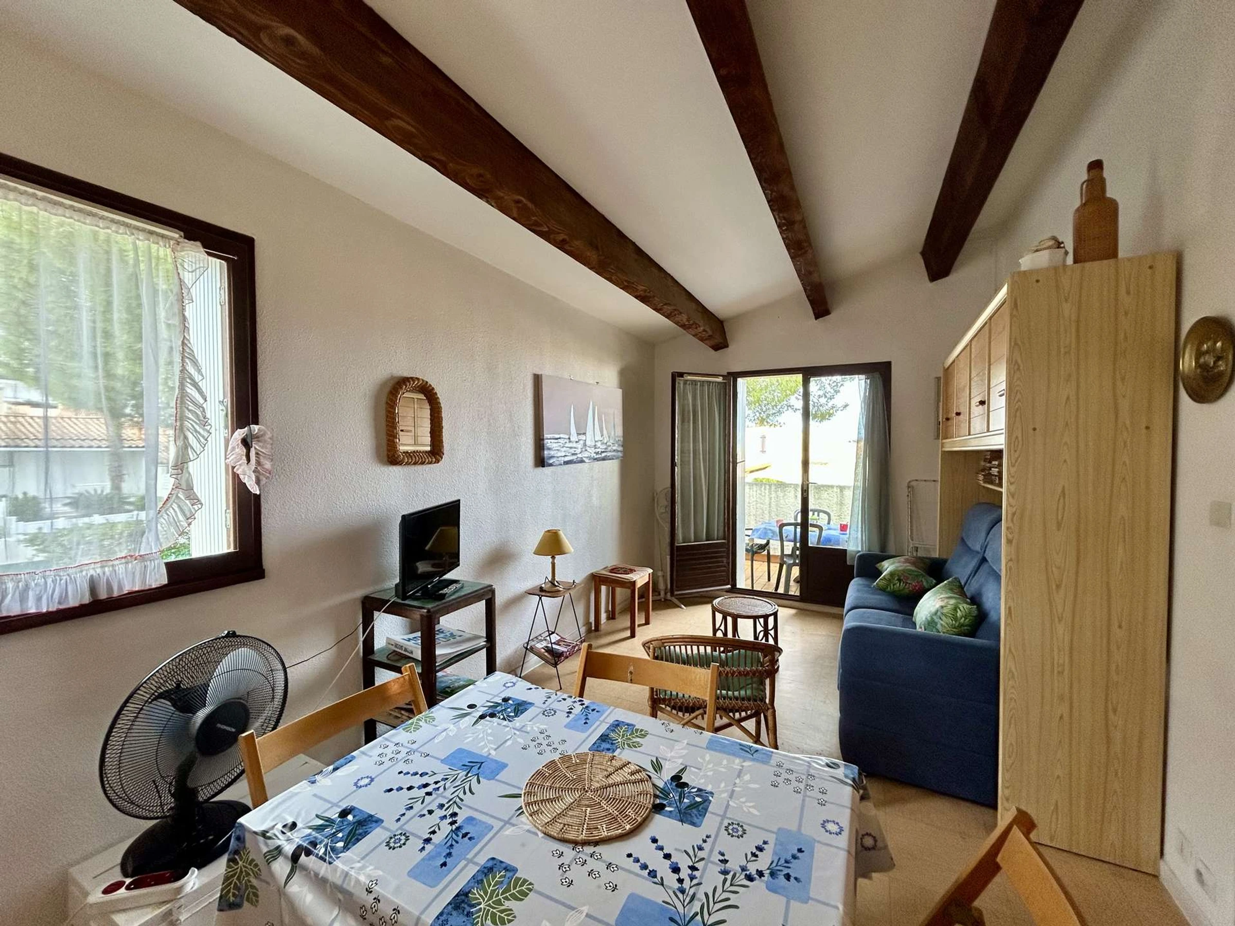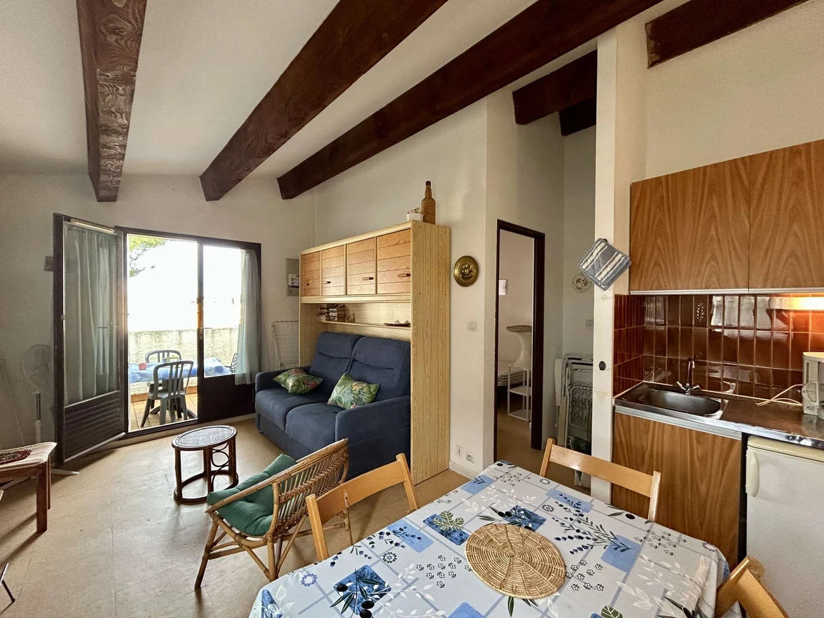 Cet appartement de vacances, situé au 1er étage, comprend un séjour avec un canapé clic clac convertible 2 places et télévision, une chambre avec 2 lits de 1 place, un coin cuisine équipé, une salle d'eau et un WC .