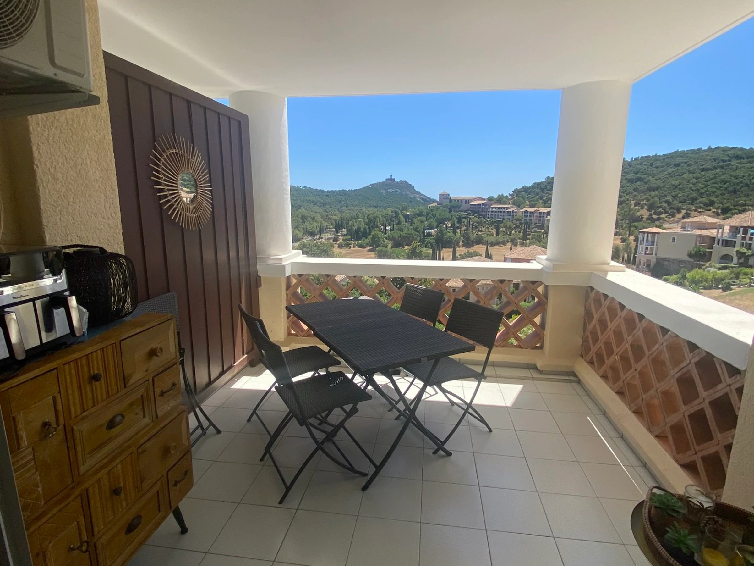 Pièce à vivre avec télévision et baie vitrée donnant sur une charmante terrasse couverte vue mer et golf.