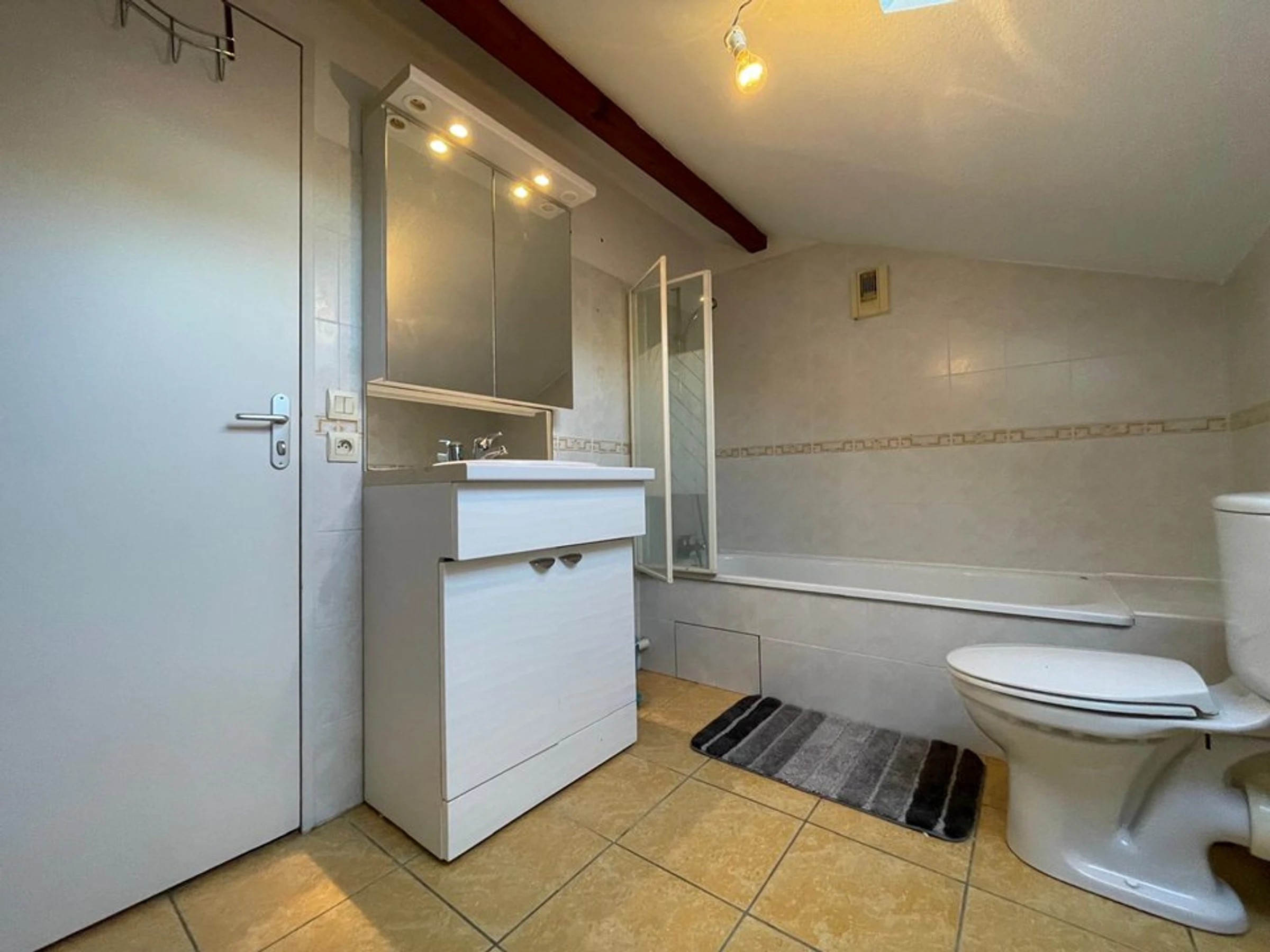 - une salle de bain avec baignoire et WC