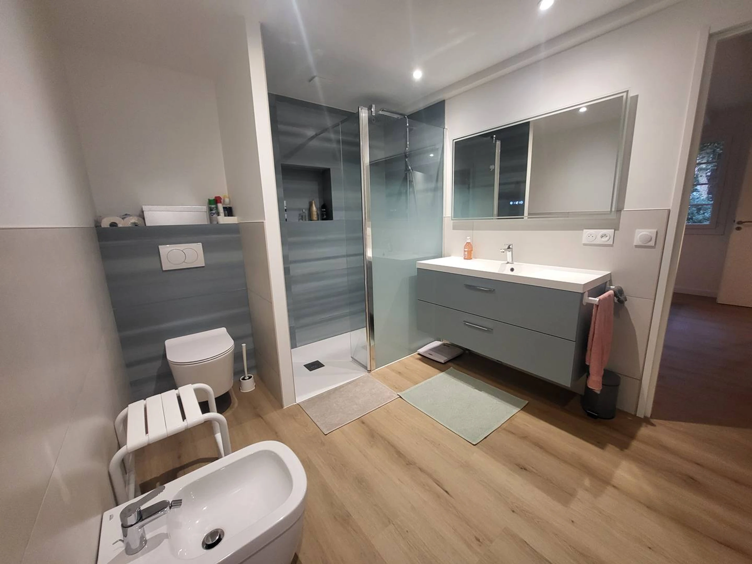 seconde salle de douche moderne, avec une grande douche à l’italienne, une vasque et un WC.
