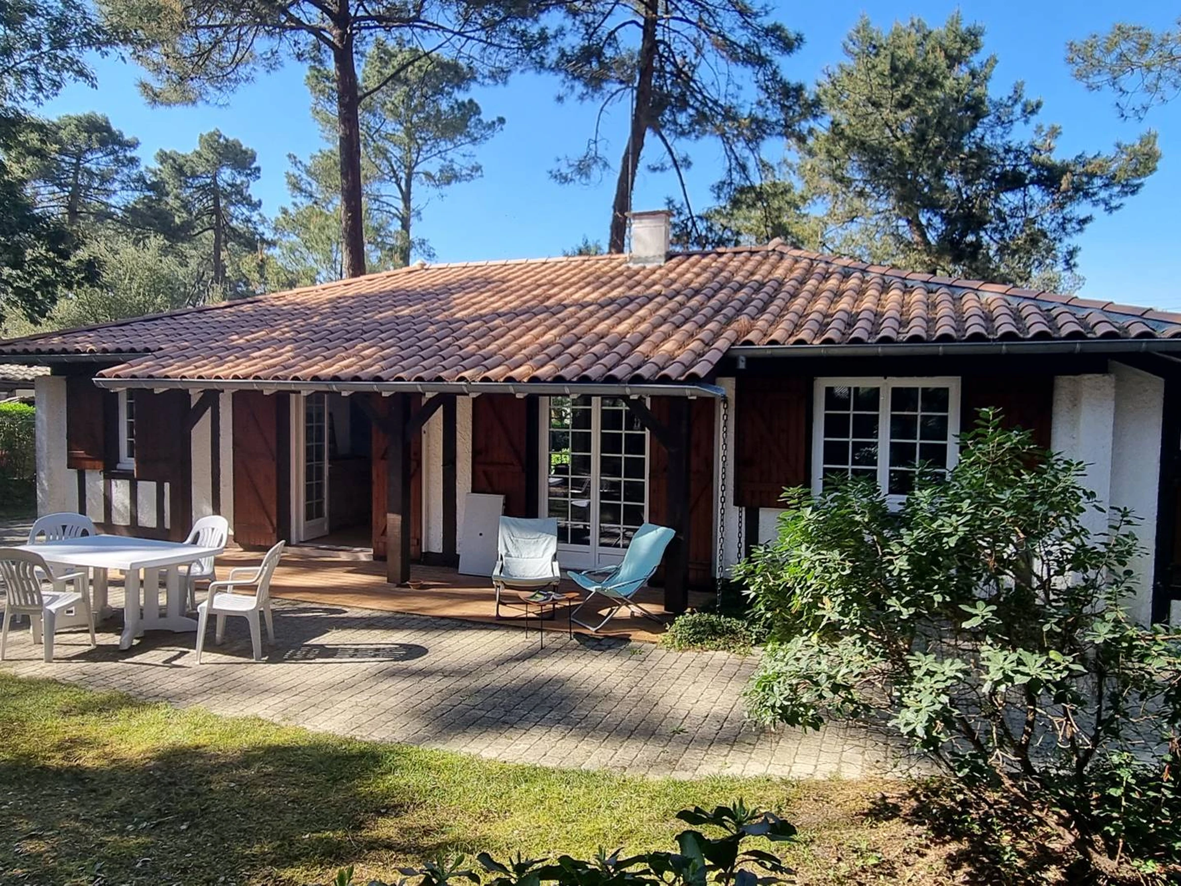 CAPBRETON. Villa ALAMEAT Dès l’entrée, vous serez séduits par sa belle pièce de vie lumineuse, où séjour, salon et salle à manger se mêlent dans une ambiance chaleureuse et moderne. Une verrière sépare élégamment le salon, équipé d’une télévision, qui s’ouvre sur une terrasse orientée Sud. La cuisine, aménagée et entièrement équipée (four, lave-vaisselle, réfrigérateur avec congélateur), donne sur la terrasse arrière, où un coin repas avec table, chaises, parasol et plancha à gaz vous attend pour de délicieux moments en extérieur.
