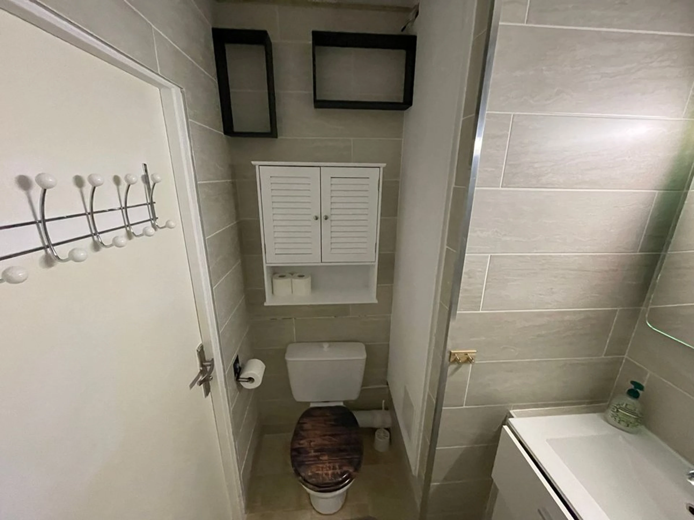 Une salle d'eau comprenant une douche à l'italienne, une vasque avec rangement et un toilette intégré.