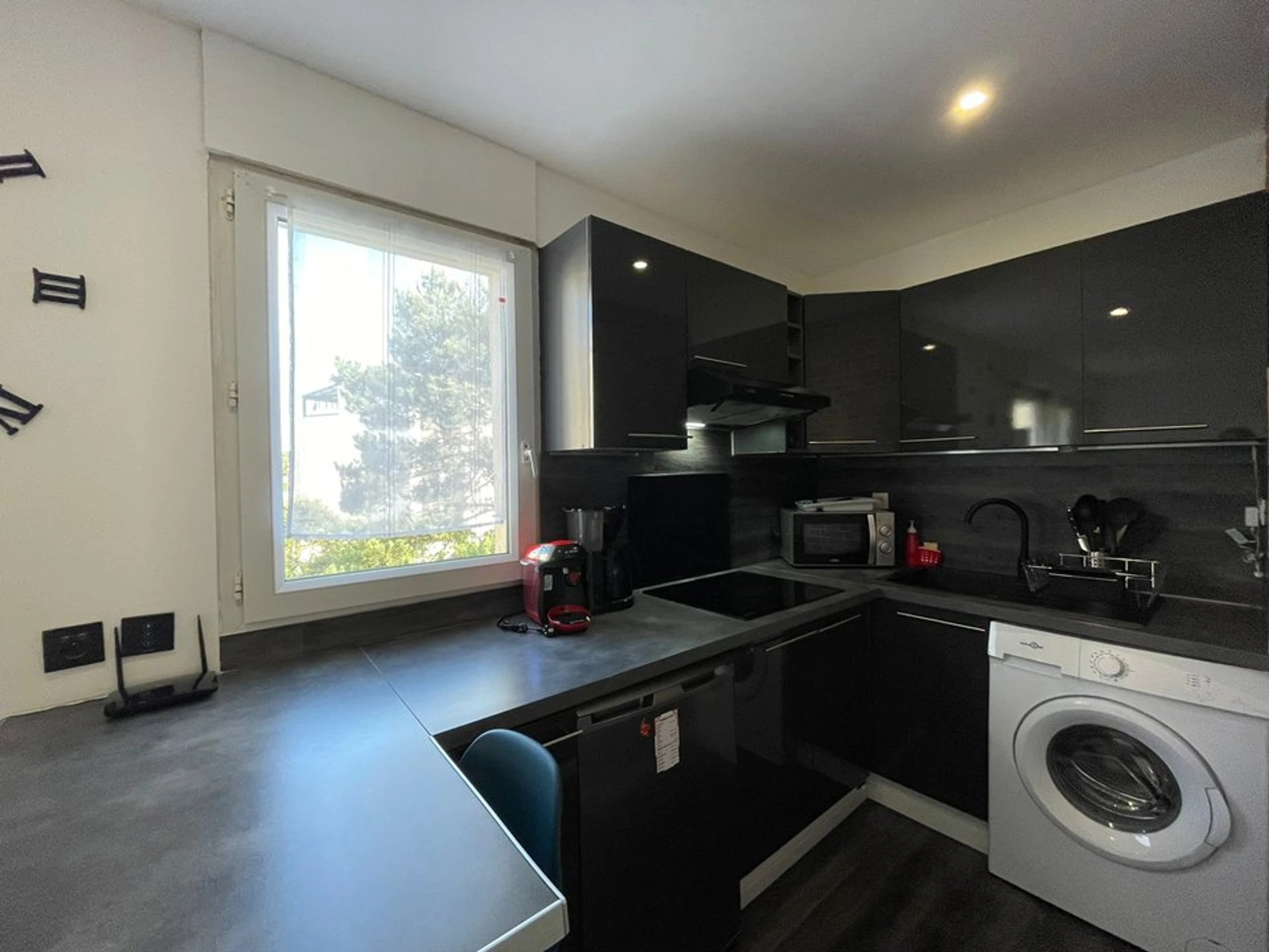 Une cuisine ouverte et équipée : un frigo top, un micro-ondes, une cafetière Bosh, un Air Fryer et une machine à laver et un coin repas.