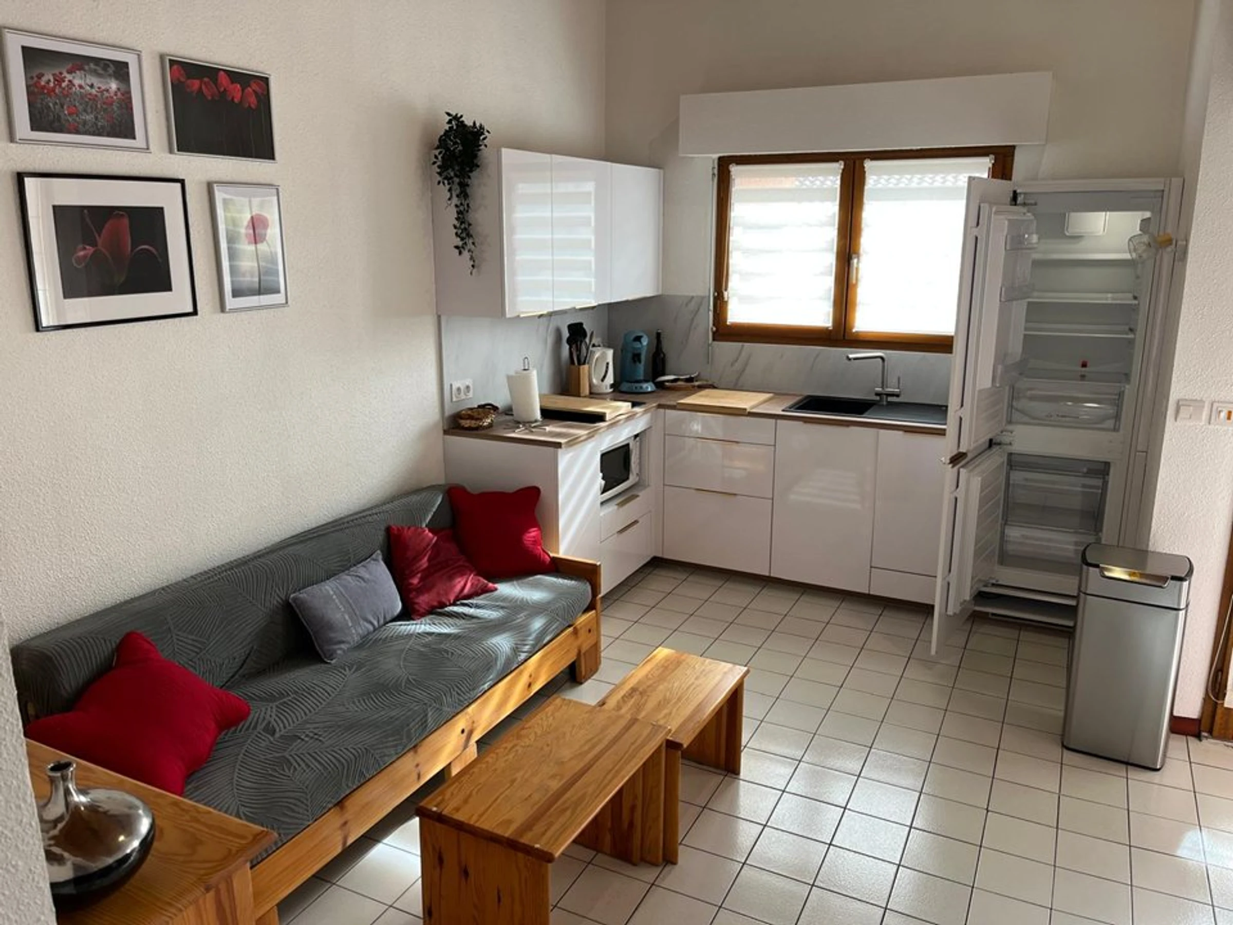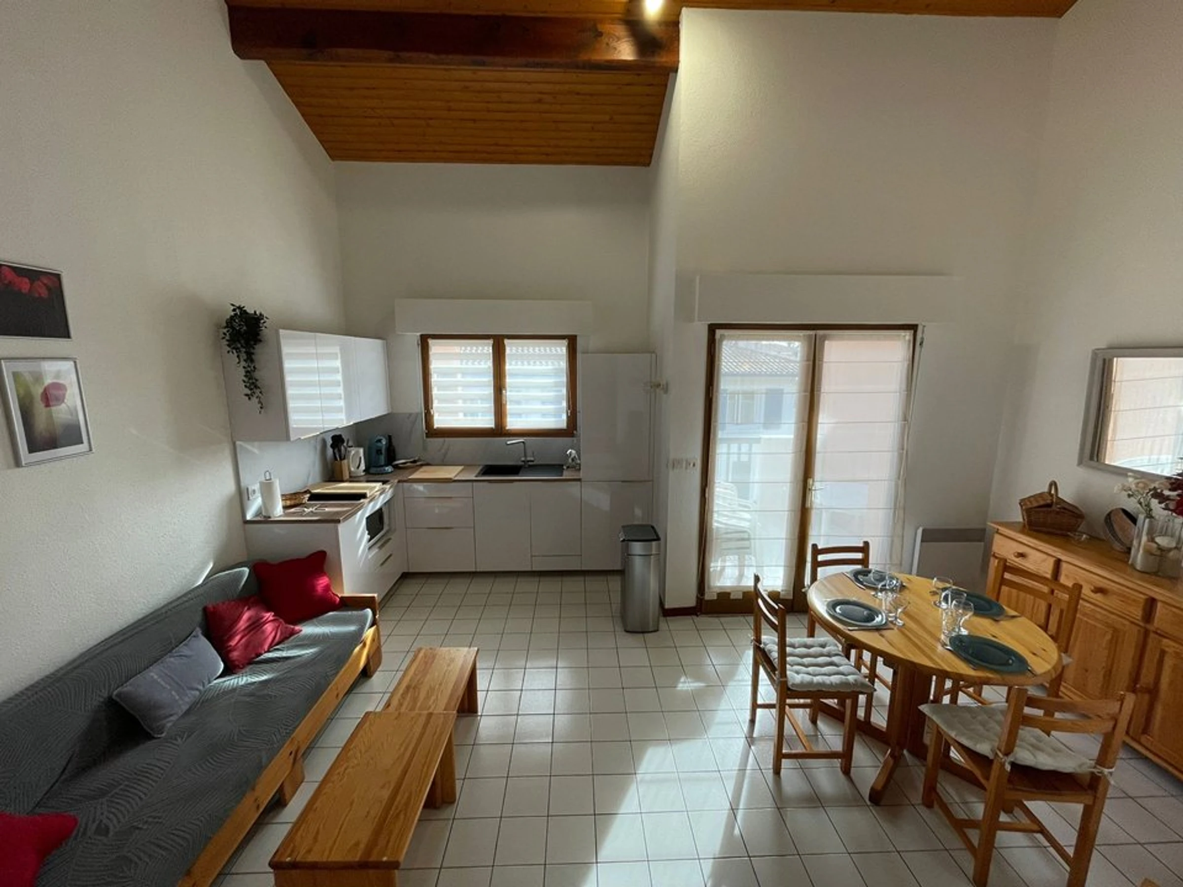 - Une cuisine ouverte et équipée d'un frigo/congélateur, lave-vaisselle, lave-linge, micro-ondes