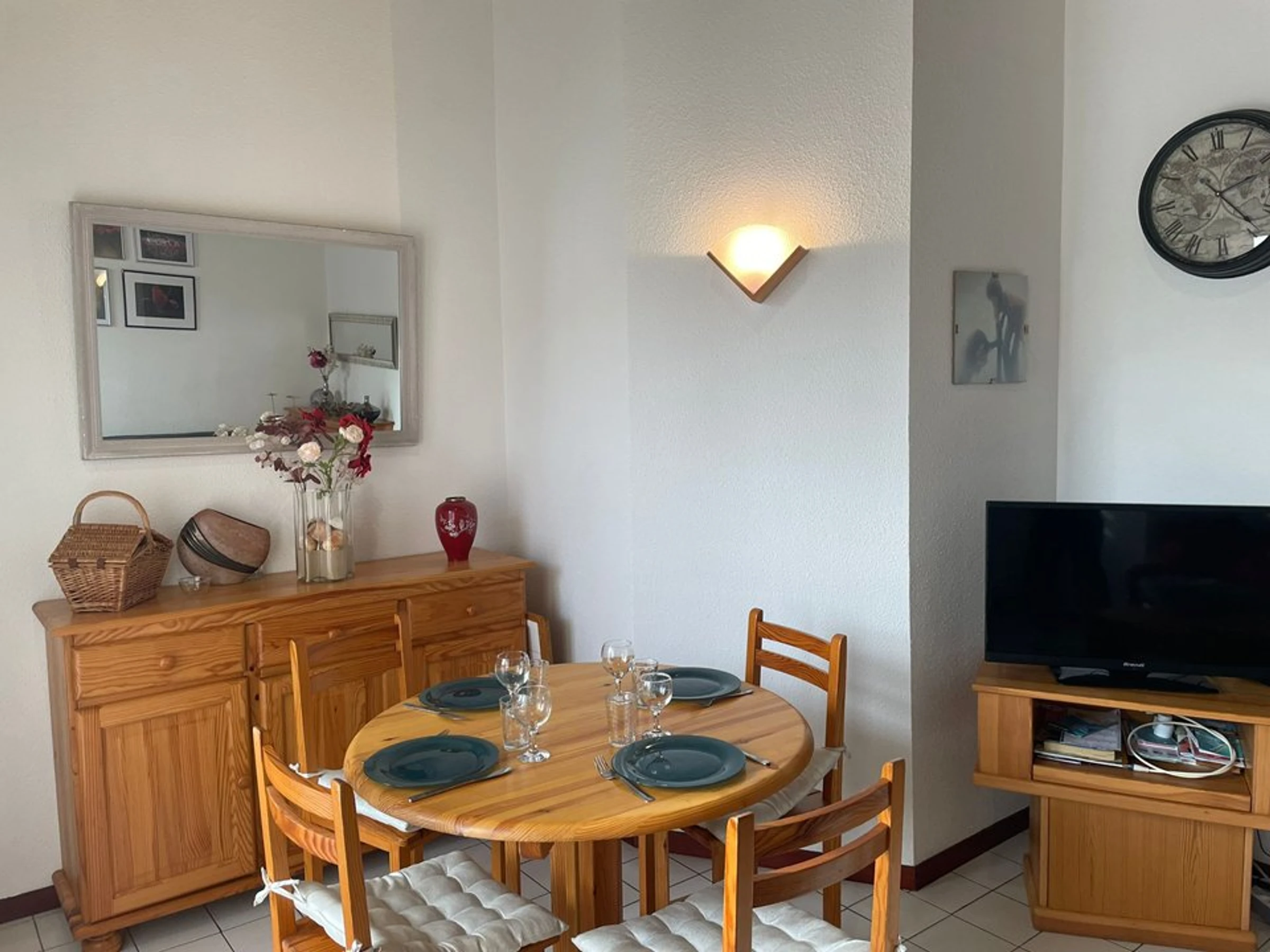 - Un salon/séjour avec une table à manger pour 4 personnes, canapé et télévision