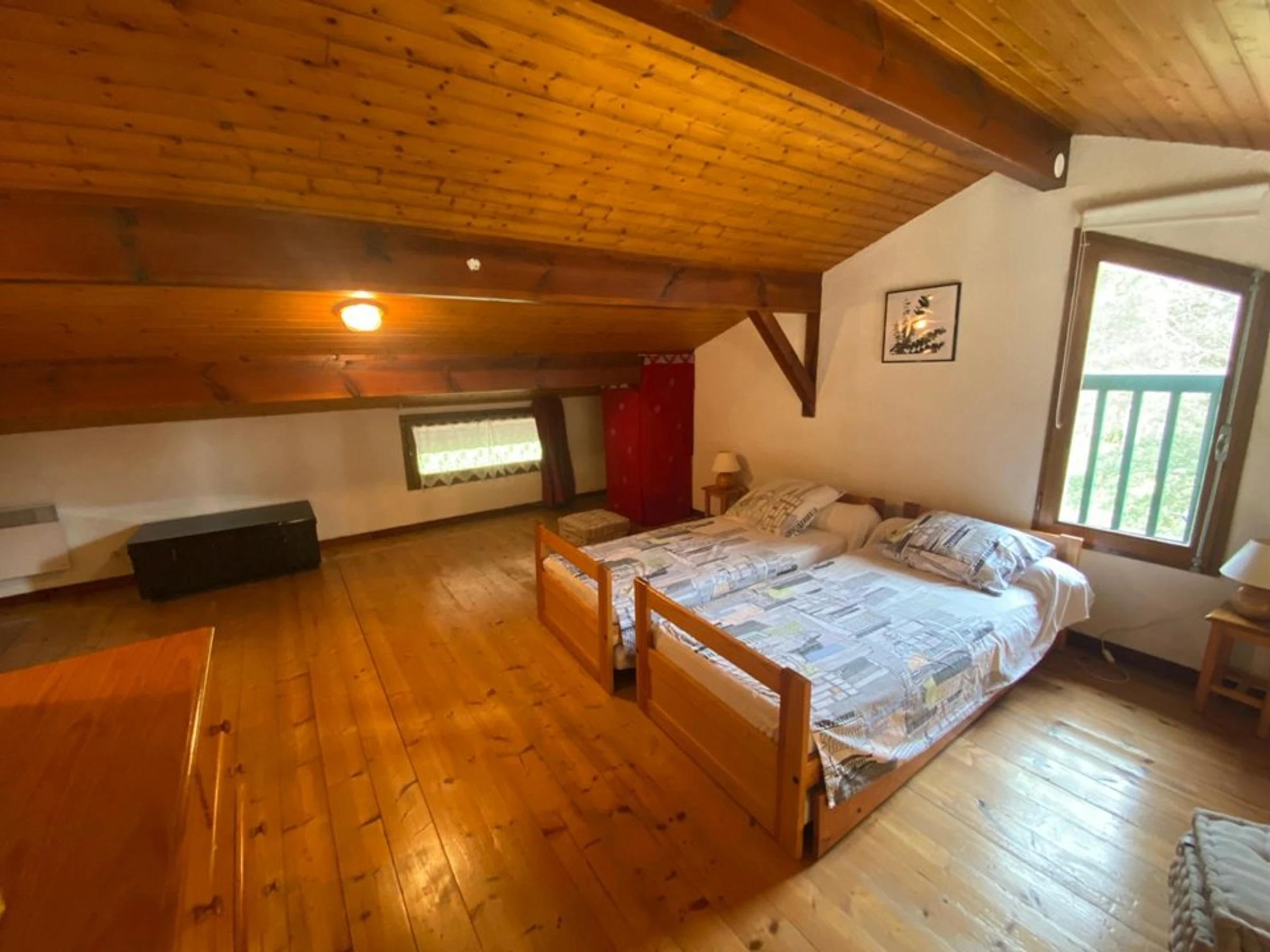- Une mezzanine comprenant deux lits simples, ouverte sur séjour pouvant être fermée grâce à des rideaux.