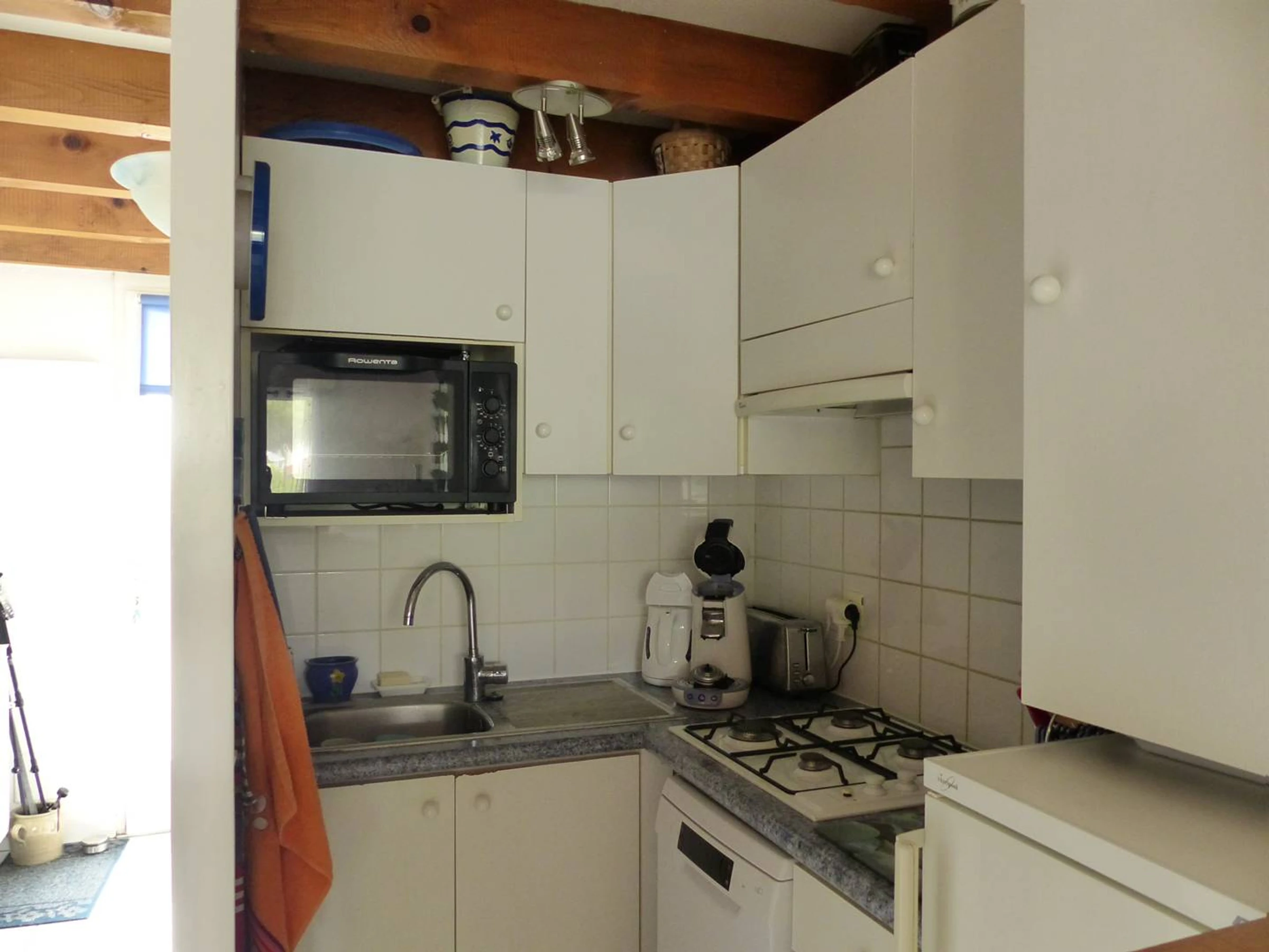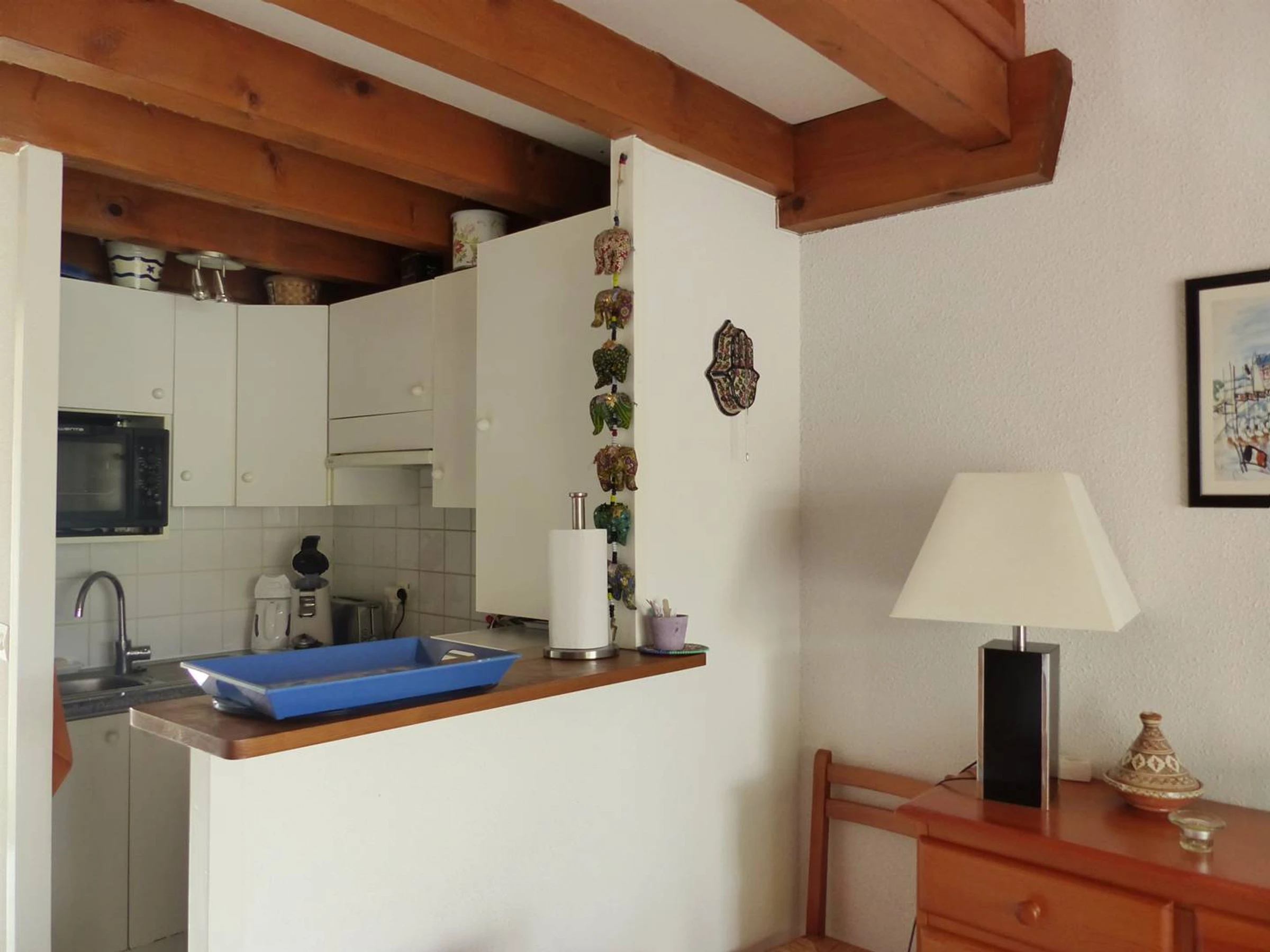 Le coin cuisine est séparé du séjour par un meuble bar: réfrigérateur,plaque 4 feux gaz, mini four et lave-vaisselle.