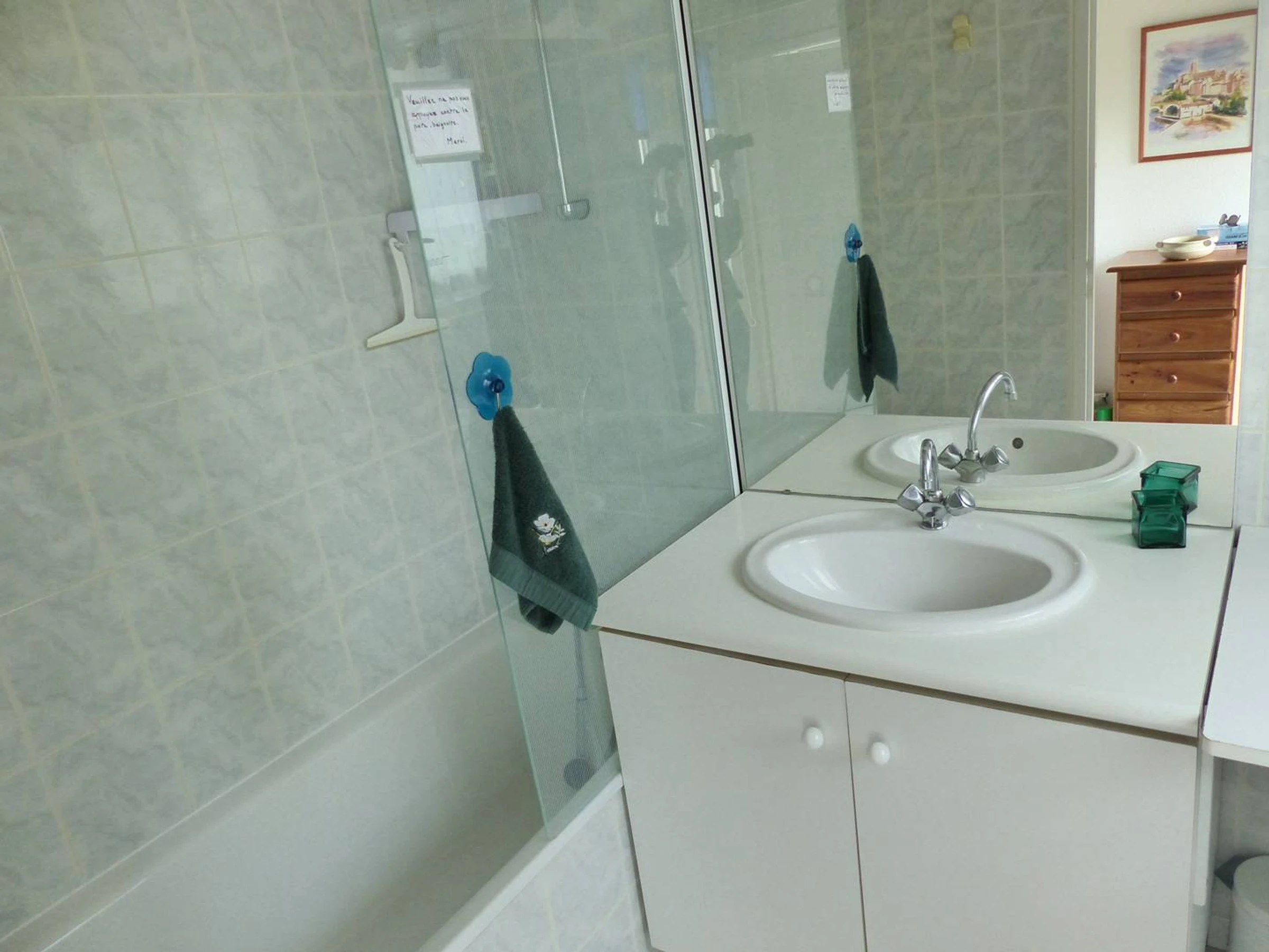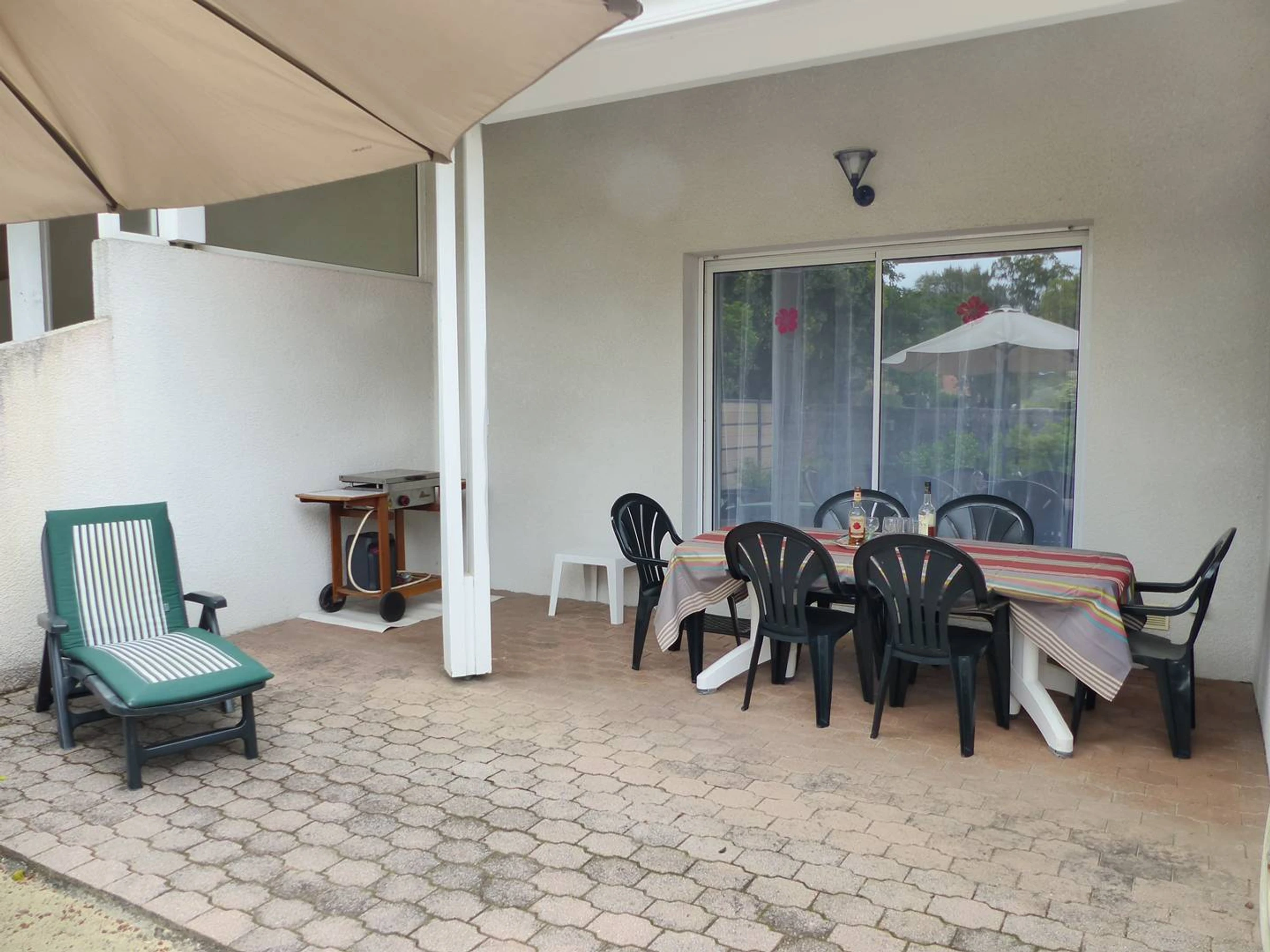 Cette villa patio d'environ 50m2 comprend une entrée et couloir donnant sur le séjour (TV, réfrigérateur, table top, petit congélateur et micro-ondes) ouvrant sur une terrasse couverte exposée Nord Est (d'environ 12m2) et le jardinet: table de jardin, chaises et plancha pour déjeuner à l extérieur.