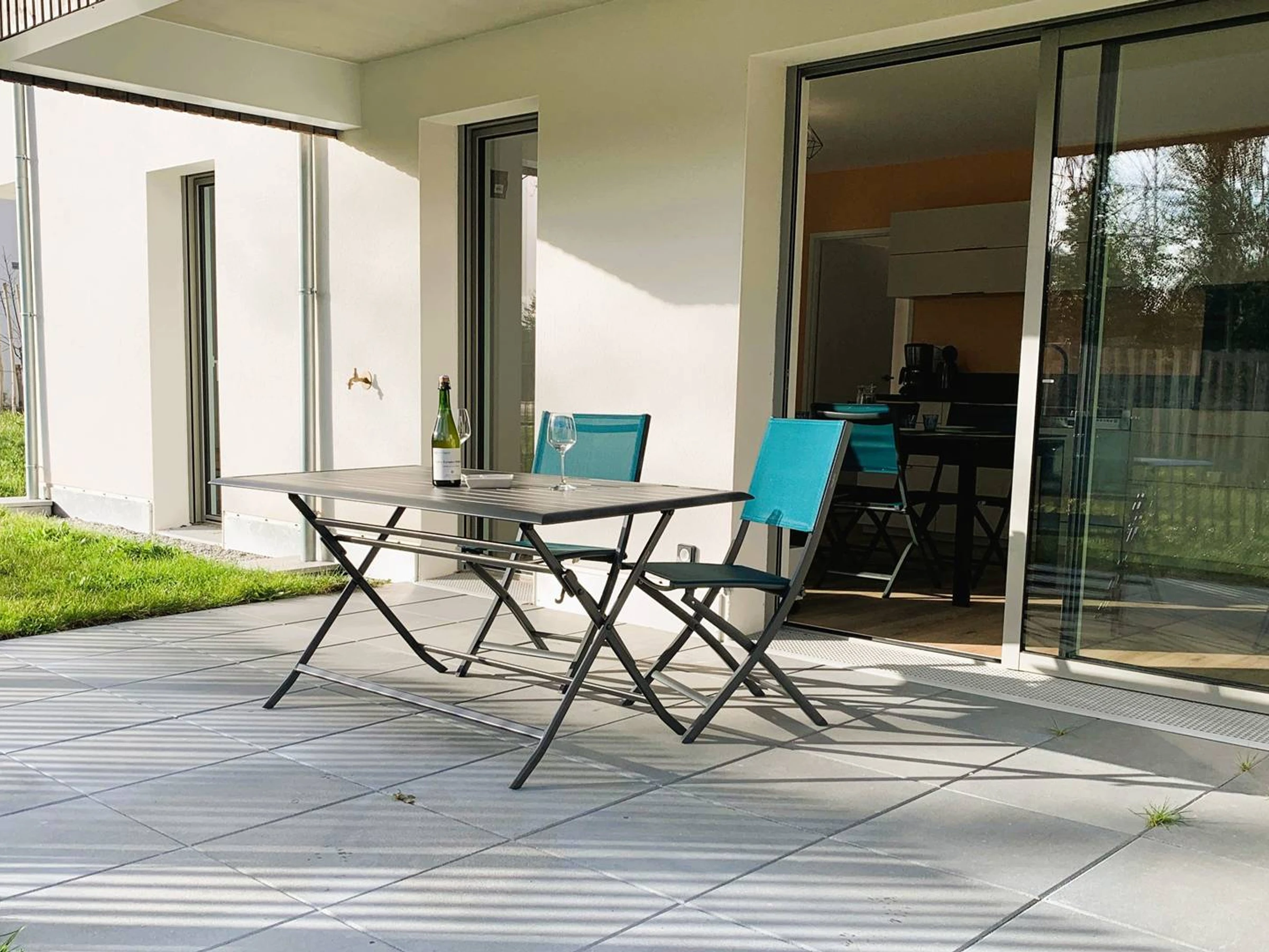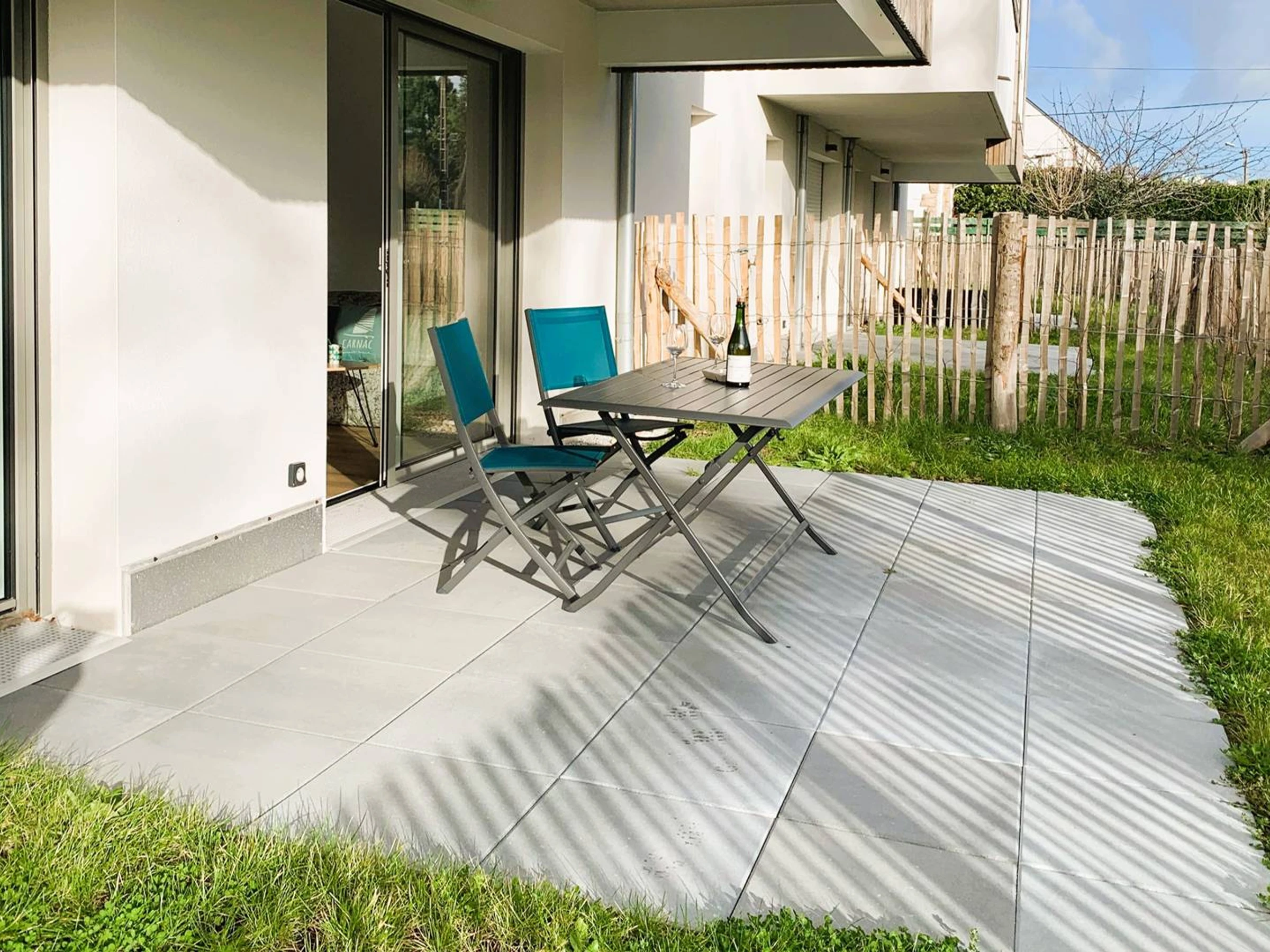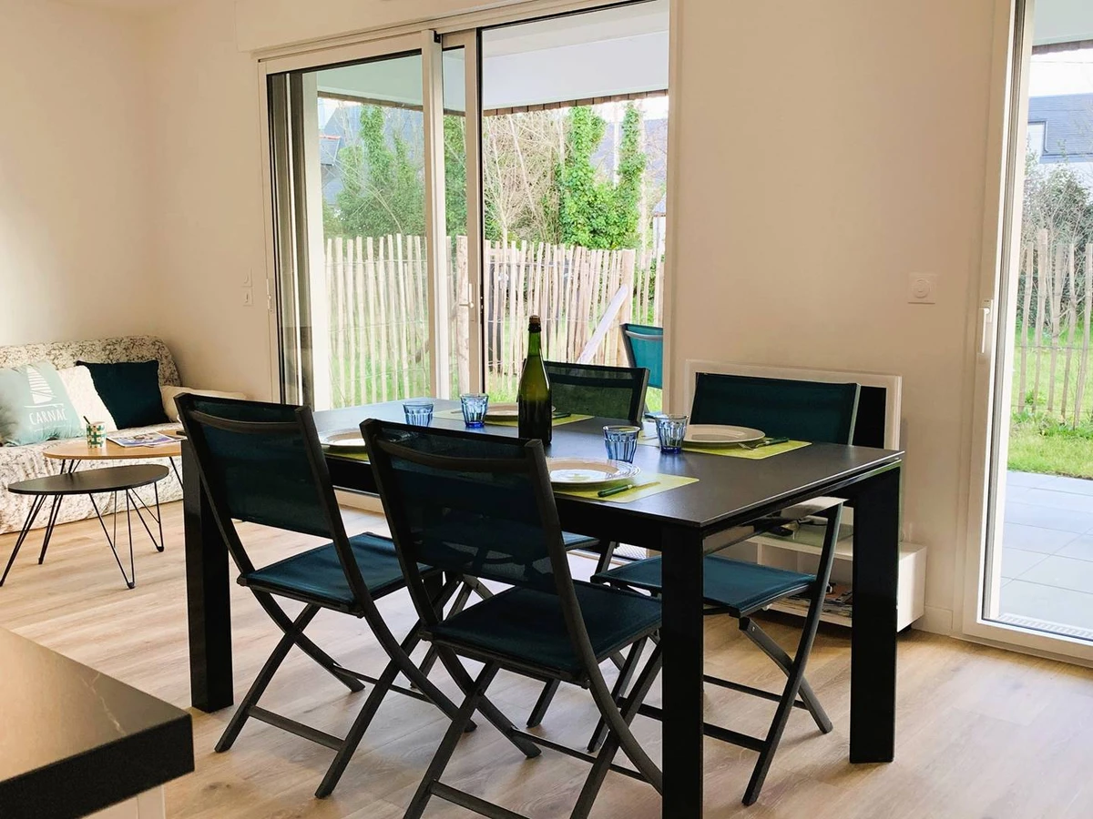 Idéalement situé à mi-chemin entre la plage et le bourg de Carnac, bel appartement 3 pièces pour 4 personnes (env. 58m²), avec grande terrasse et jardin privatif, situé dans la résidence moderne PASSAGE CESARINE (bâtiment A, RDC, porte 4) :