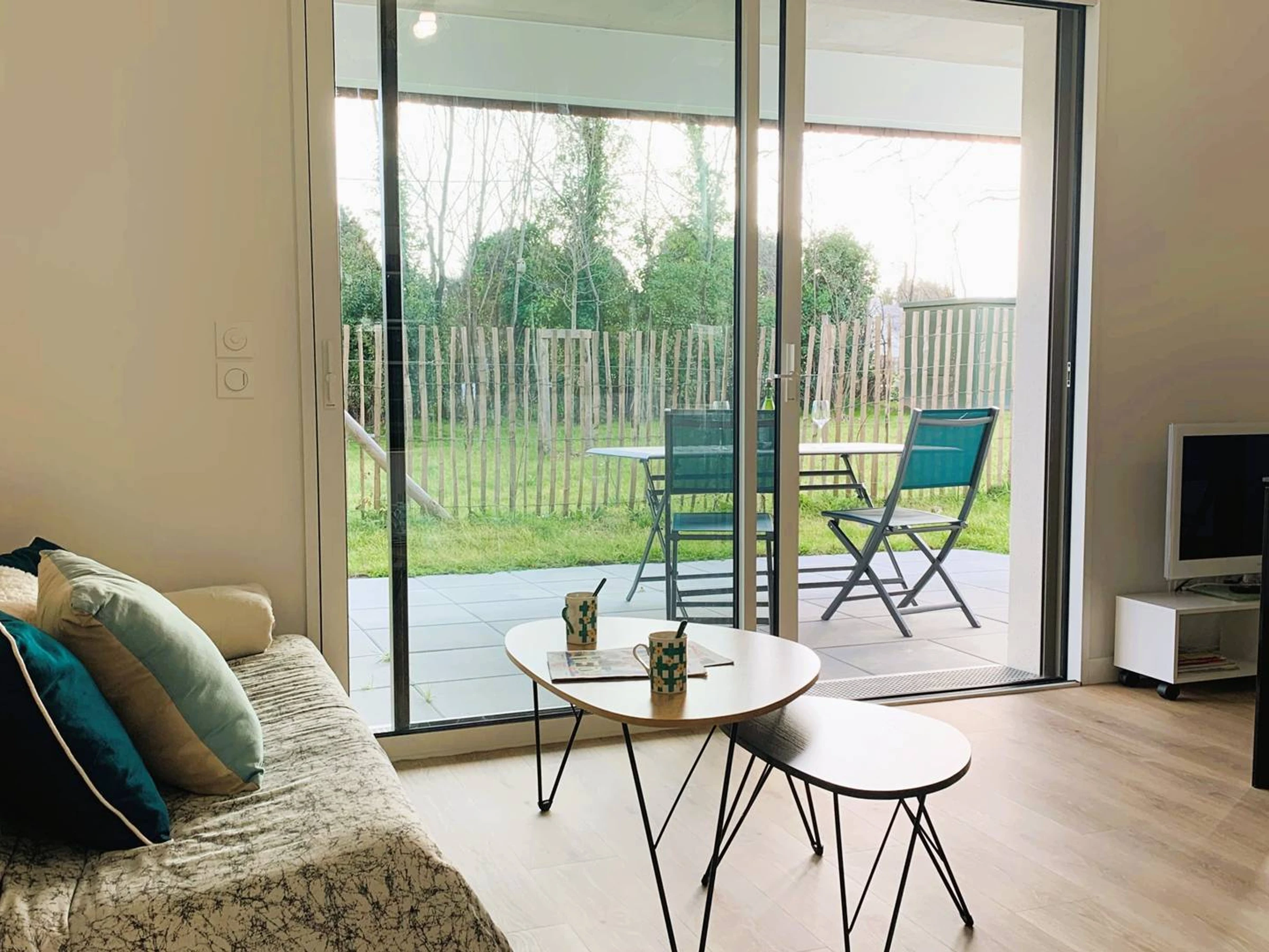 - Séjour avec partie salon (canapé, TV) et partie repas (table et chaises) ouvrant sur la terrasse partiellement couverte exposée Sud (table de jardin, transats) et prolongée par le jardinet privatif clos