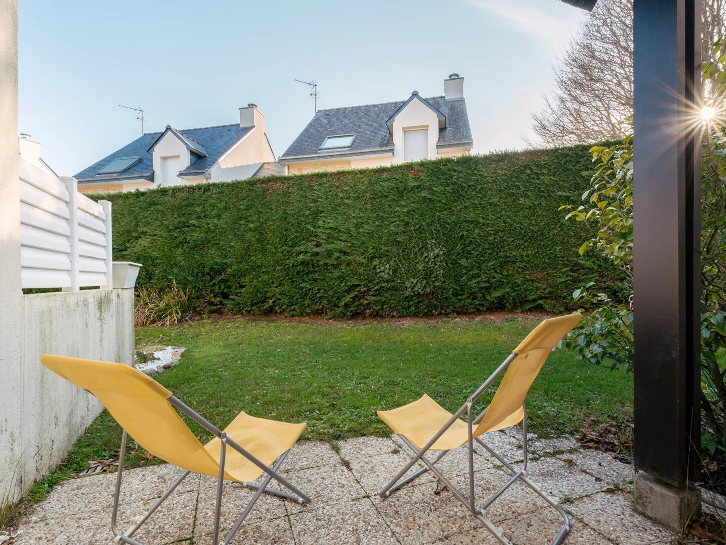 - Séjour avec partie salon (TV, canapé clic-clac : couchage 2 personnes, couverture) et partie repas (table et chaises) donnant sur terrasse orientée Sud-Ouest (meubles de jardin) prolongée par le jardin de la résidence
