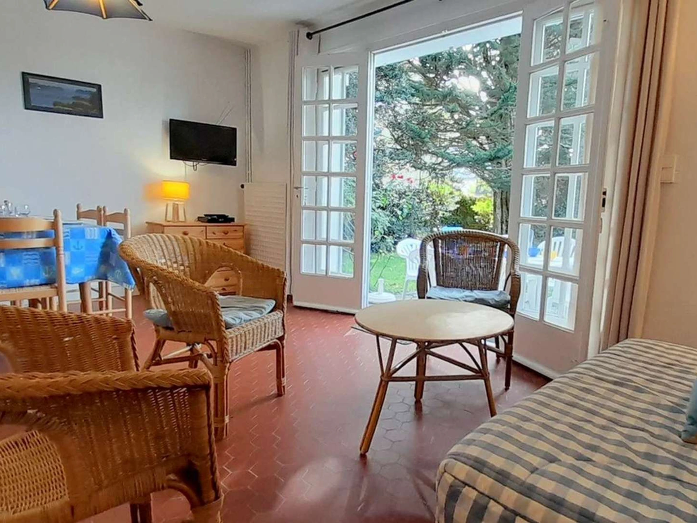 - Séjour avec partie salon (TV, canapé BZ : couchage 2 personnes, couverture) et partie repas (table et chaises) donnant sur terrasse exposée Ouest (meubles de jardin)