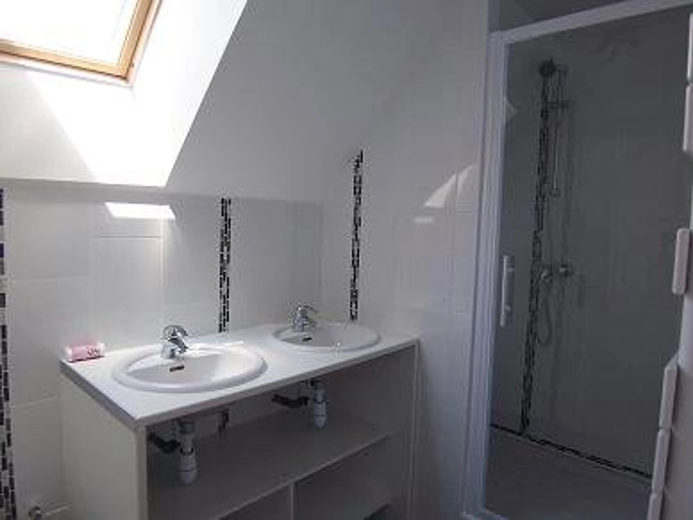 A l'étage : chambre 4 avec un lit double (1x140, couettes), salle d'eau avec WC.
