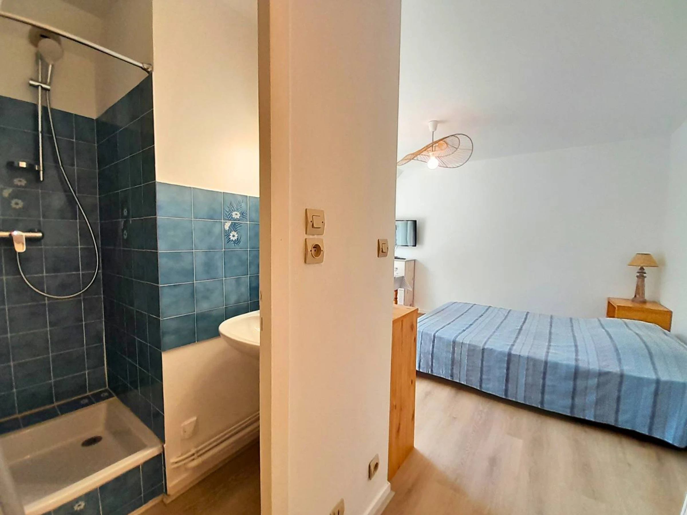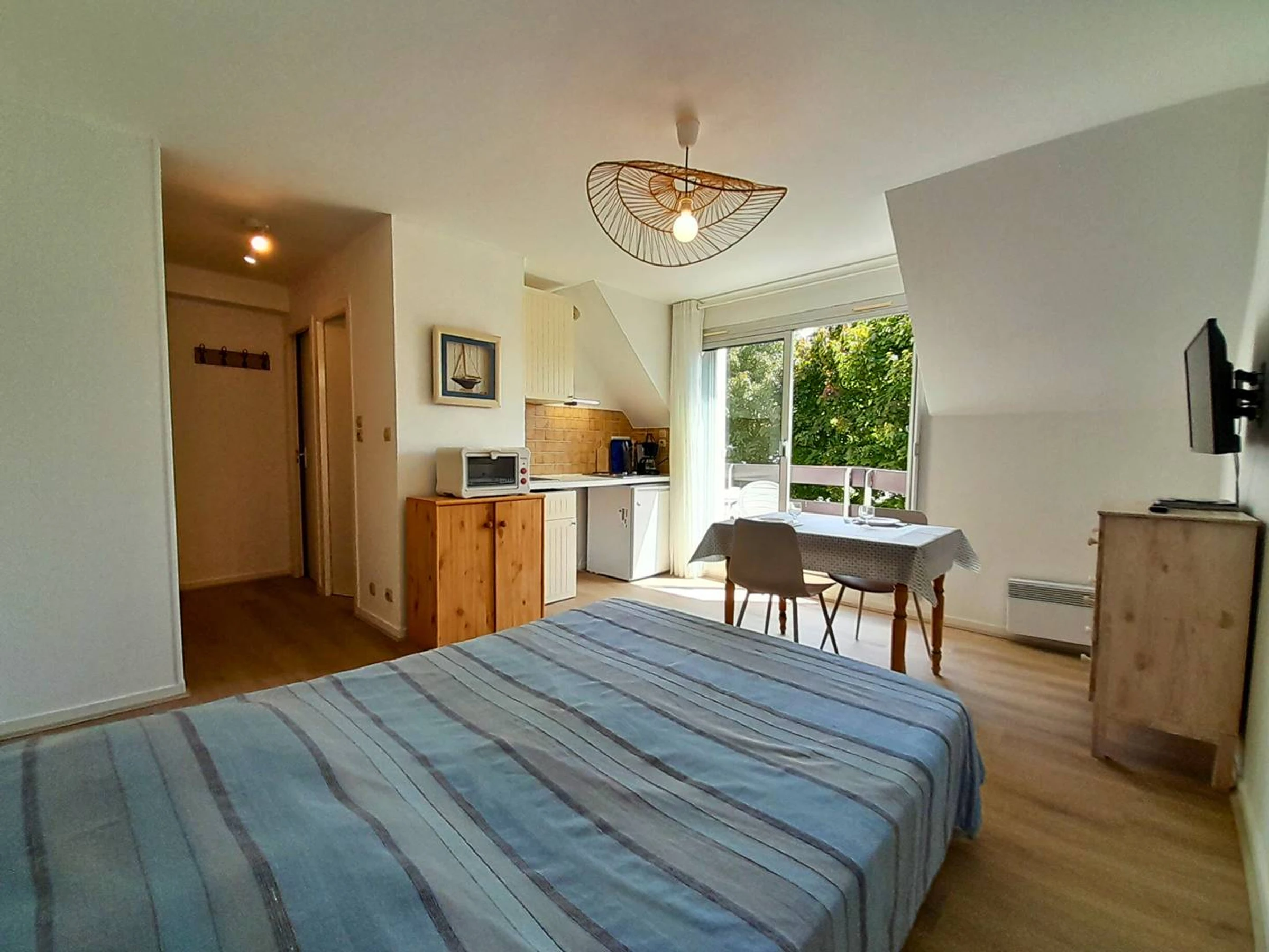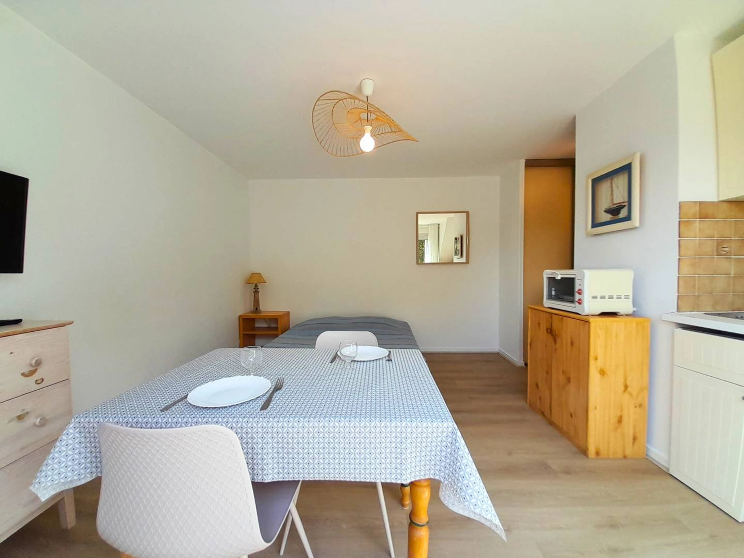 - Séjour avec partie nuit (1 lit double, 140, couverture) et partie repas (table et chaises, TV) donnant sur petit balcon exposé Sud (mobilier de jardin)