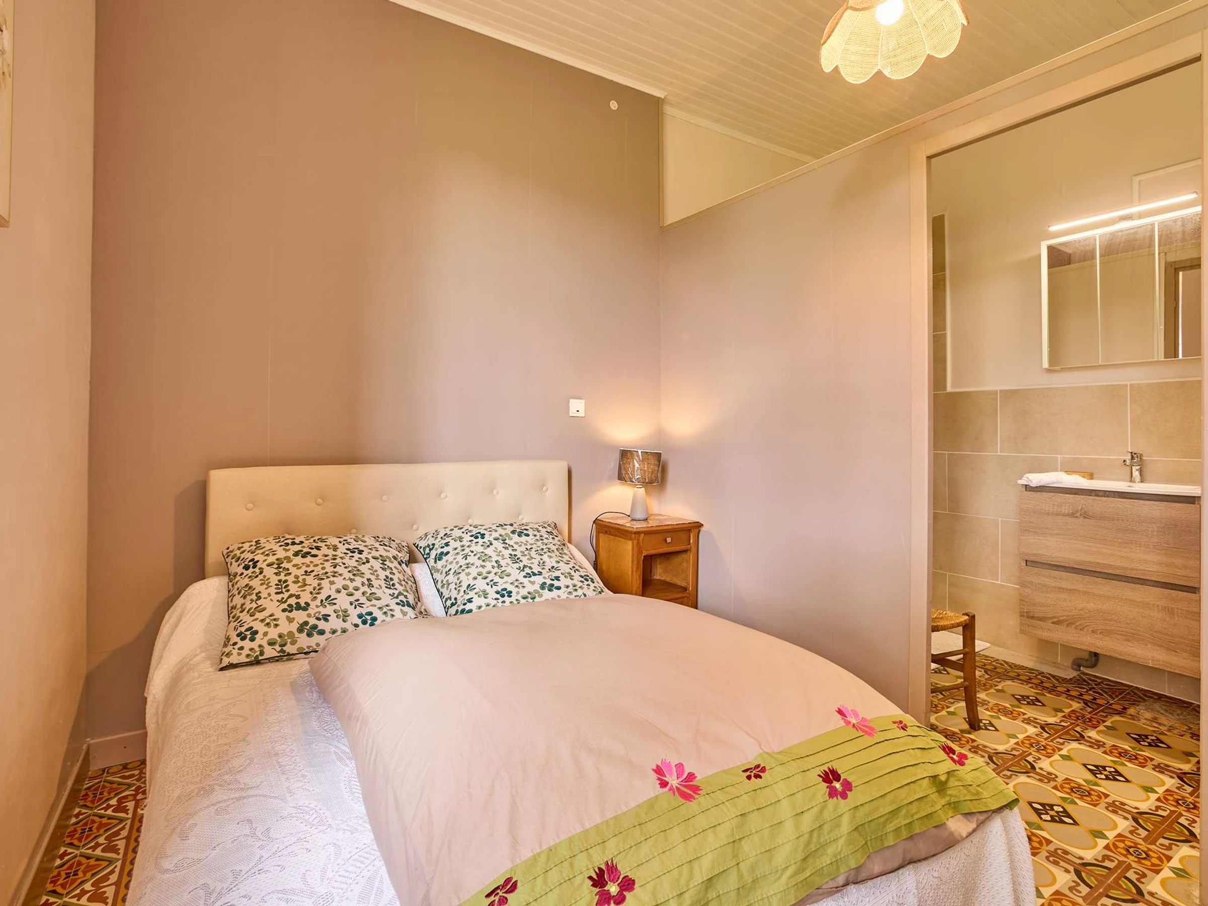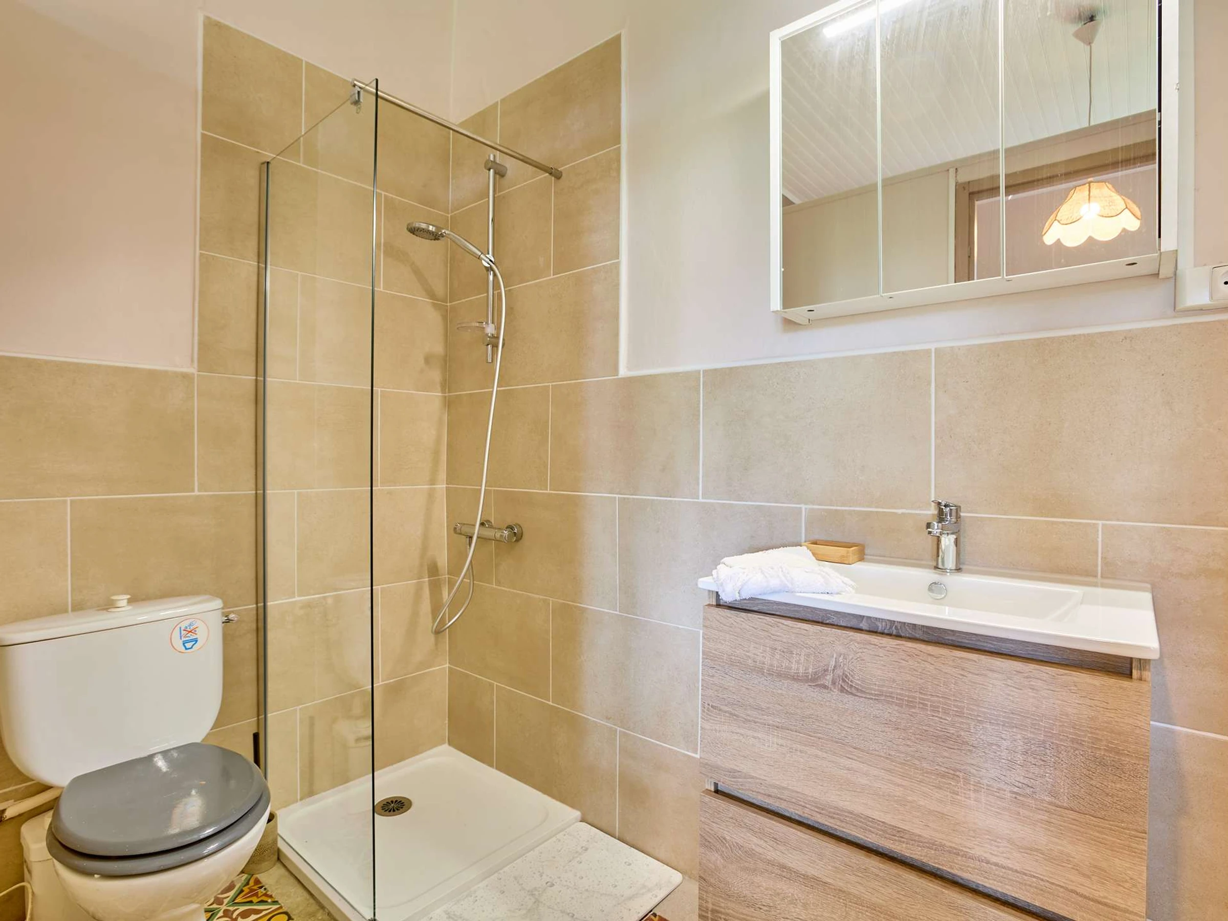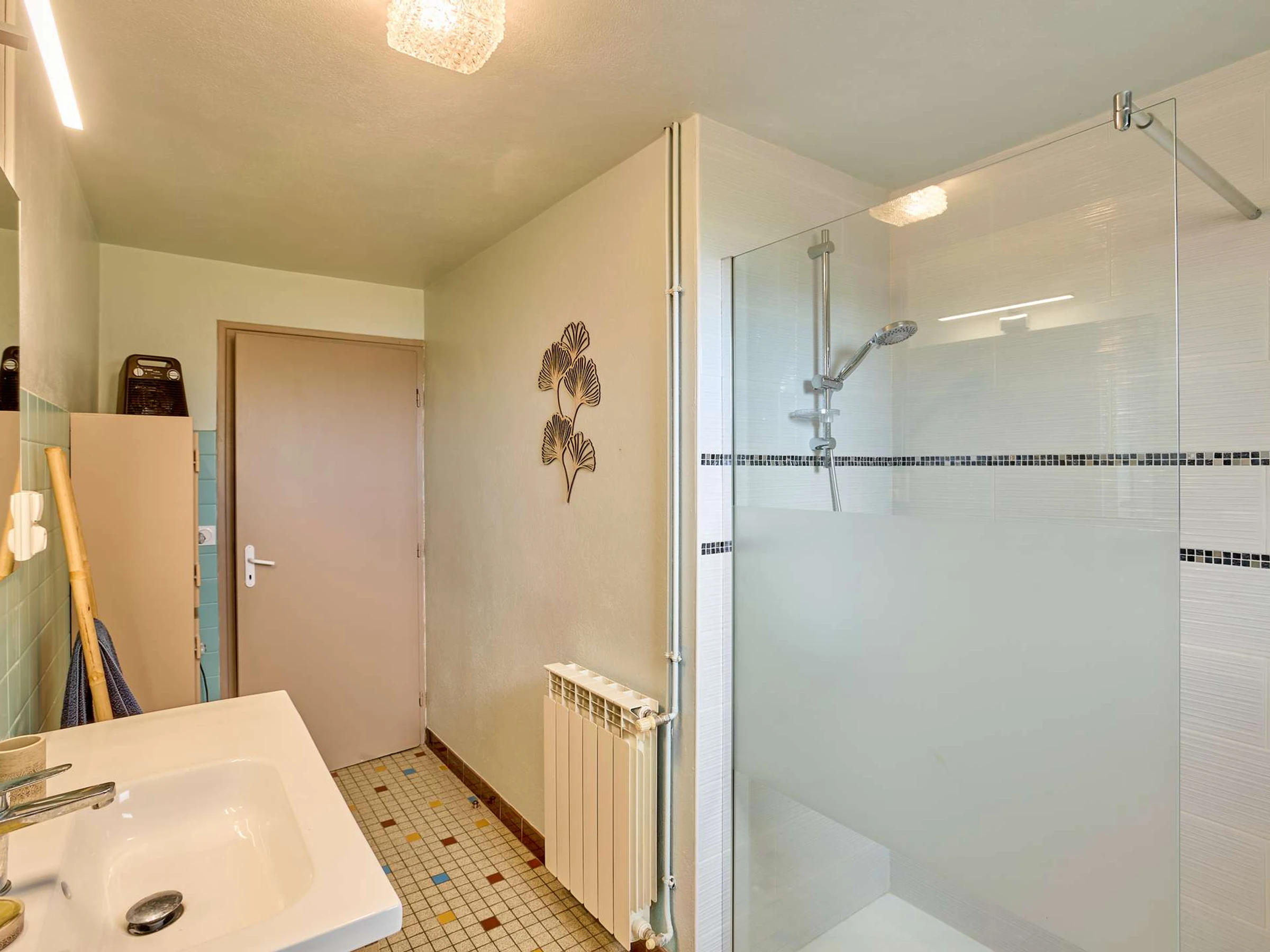 Côté nuit, une première chambre avec un lit en 140 et des rangements vous accueillera. Une seconde chambre est disponible à l’étage si besoin. La salle de bain, élégante et contemporaine, dispose d’une douche moderne, d’un meuble vasque et d’espaces de rangement.