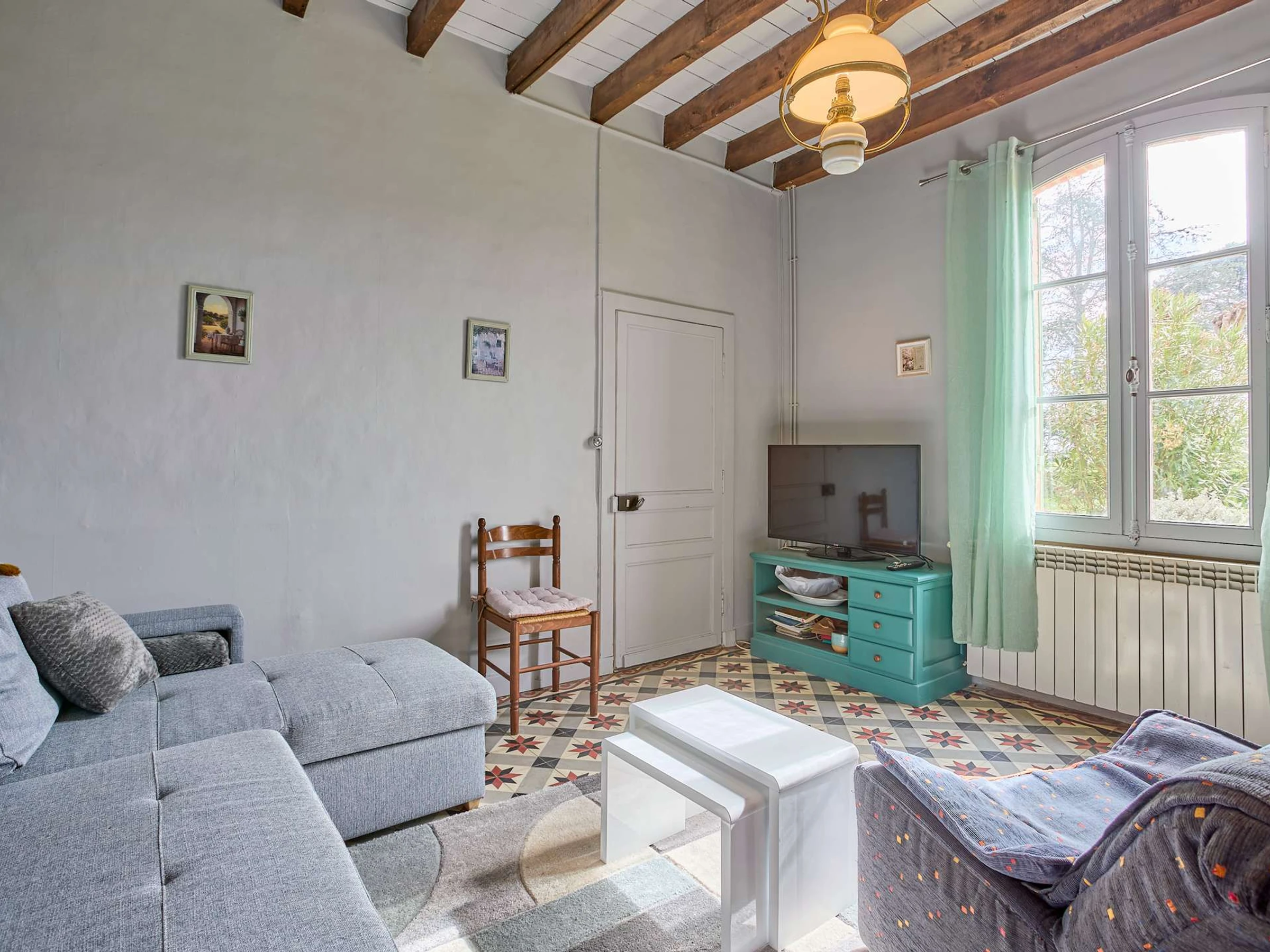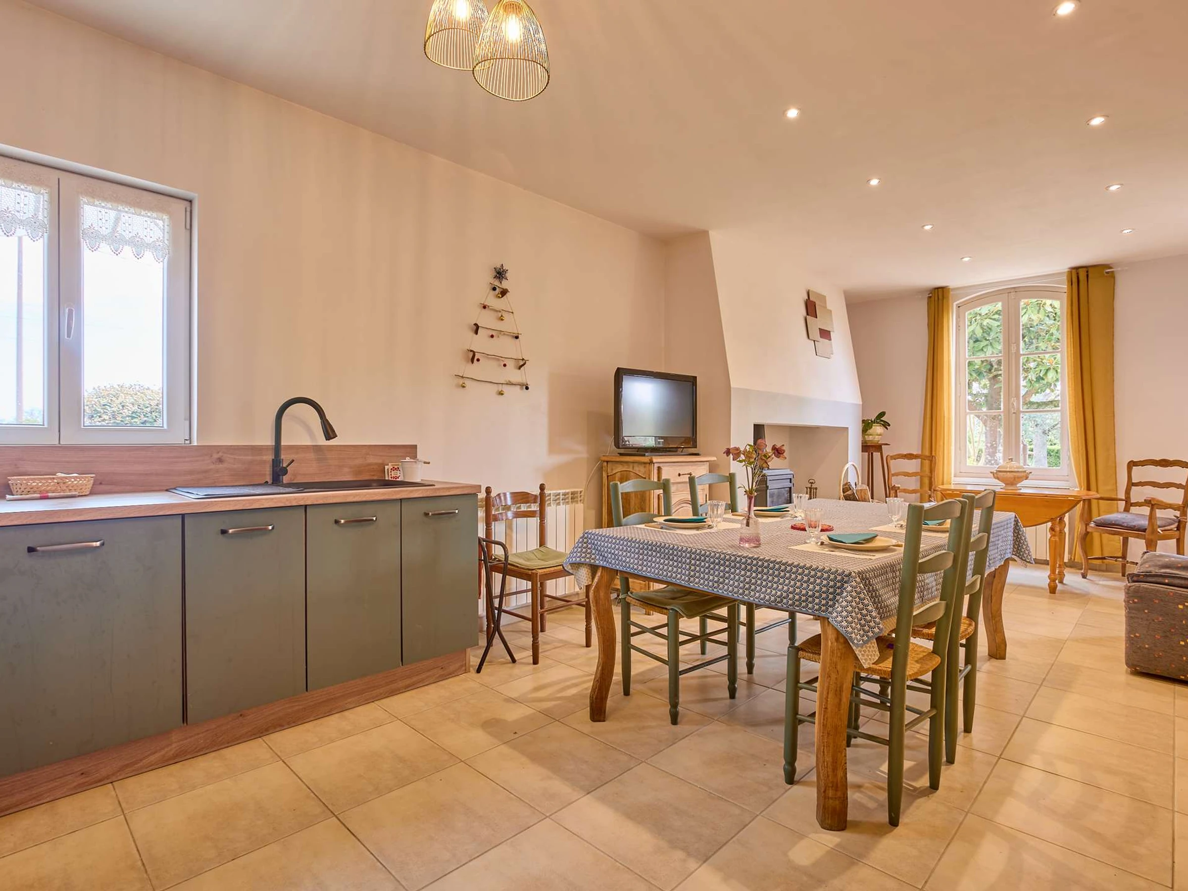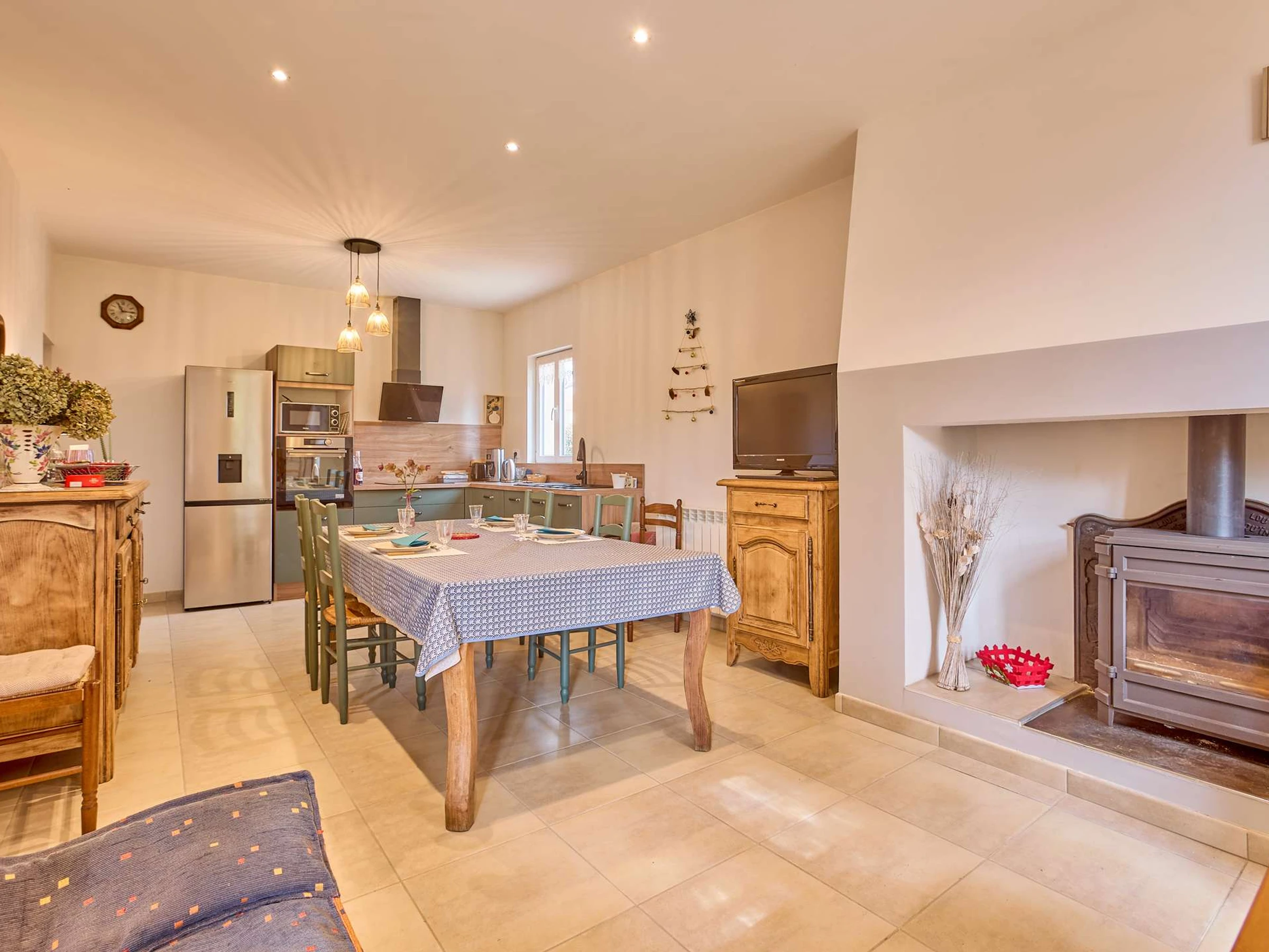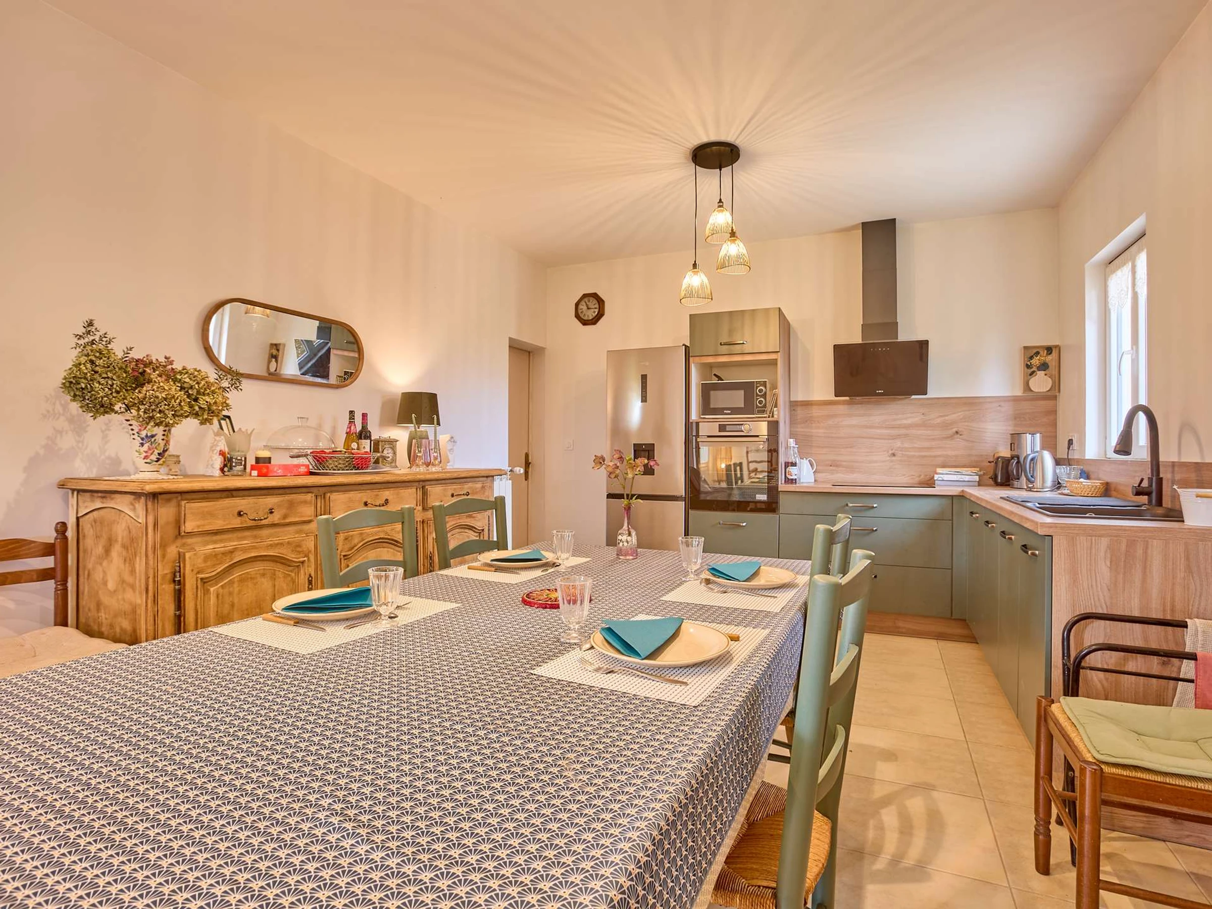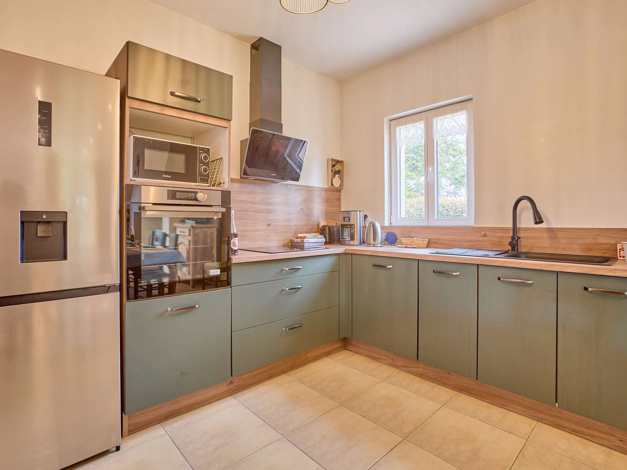Agencée sur deux niveaux mais principalement de plain-pied, elle se compose d’un salon chaleureux et d’une grande cuisine moderne entièrement rénovée, équipée d’un grand réfrigérateur et d’un ensemble électroménager fonctionnel.