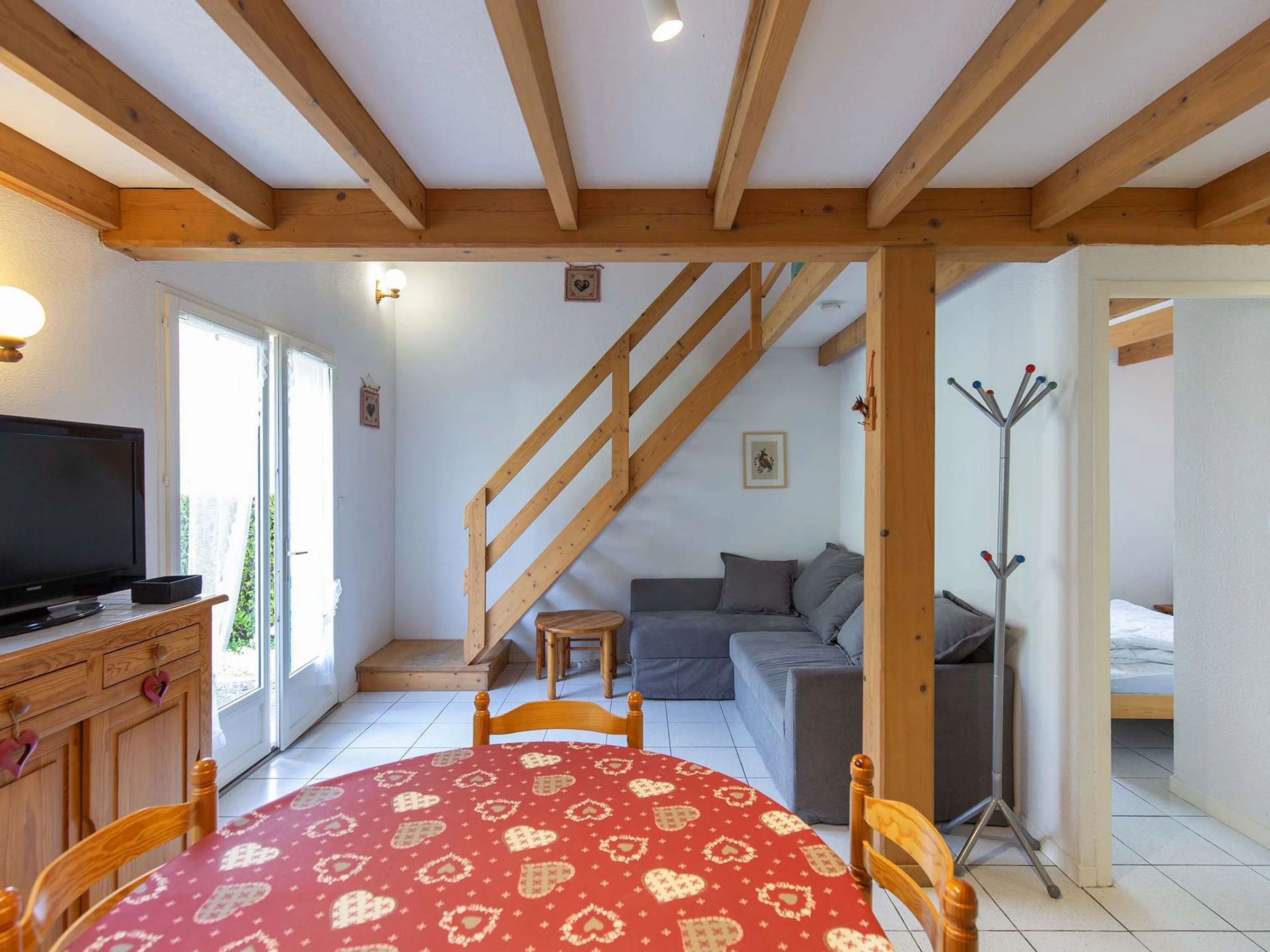 Séjour équipé d’un téléviseur, canapé, coin repas et cuisine ouverte.