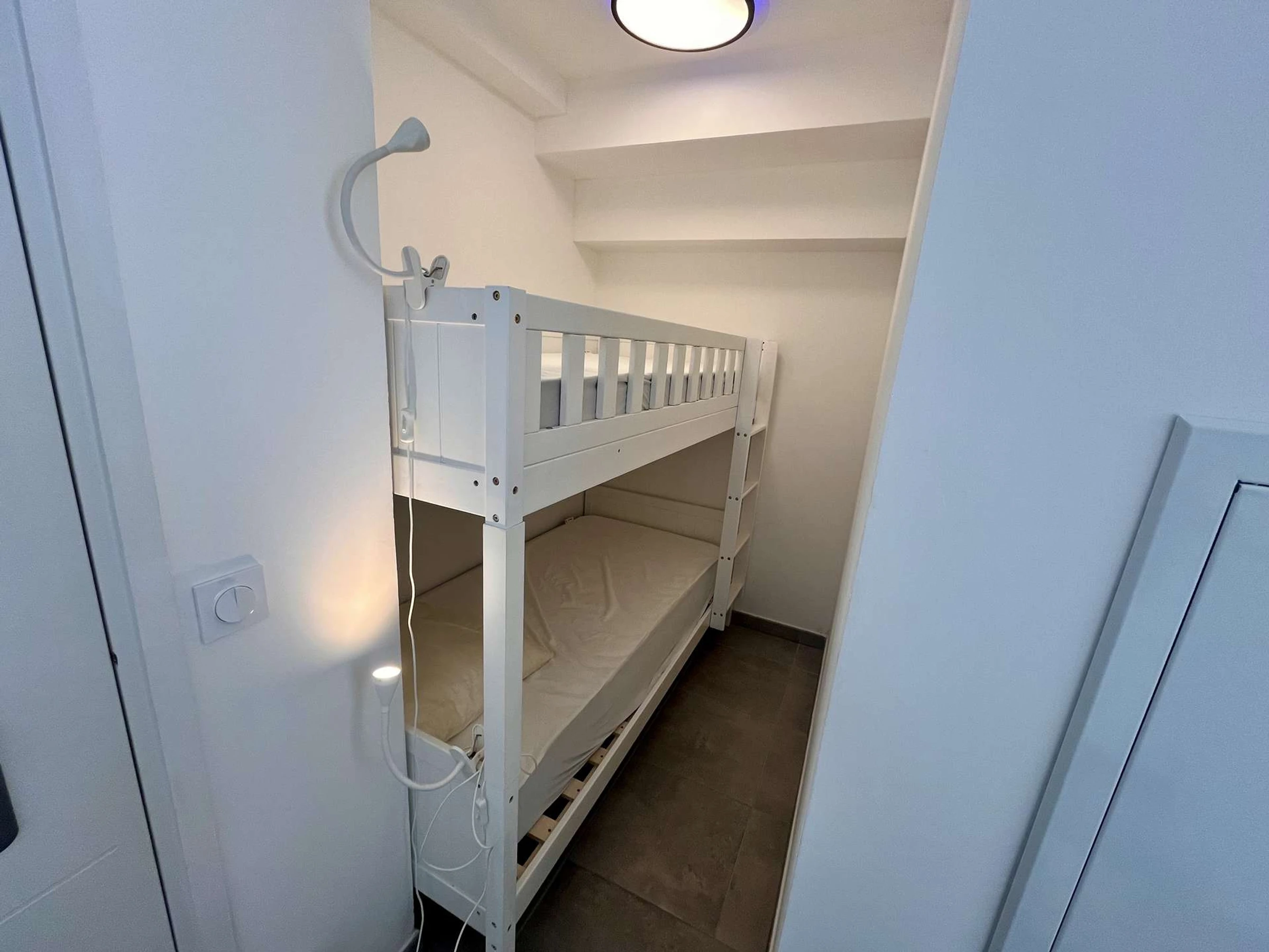 Il comprends un séjour, une cuisine ouverte, une chambre avec un lit 160 cm et une climatisation mobile, une salle d'eau avec wc, un espace nuit avec lits superposés en 90 cm.