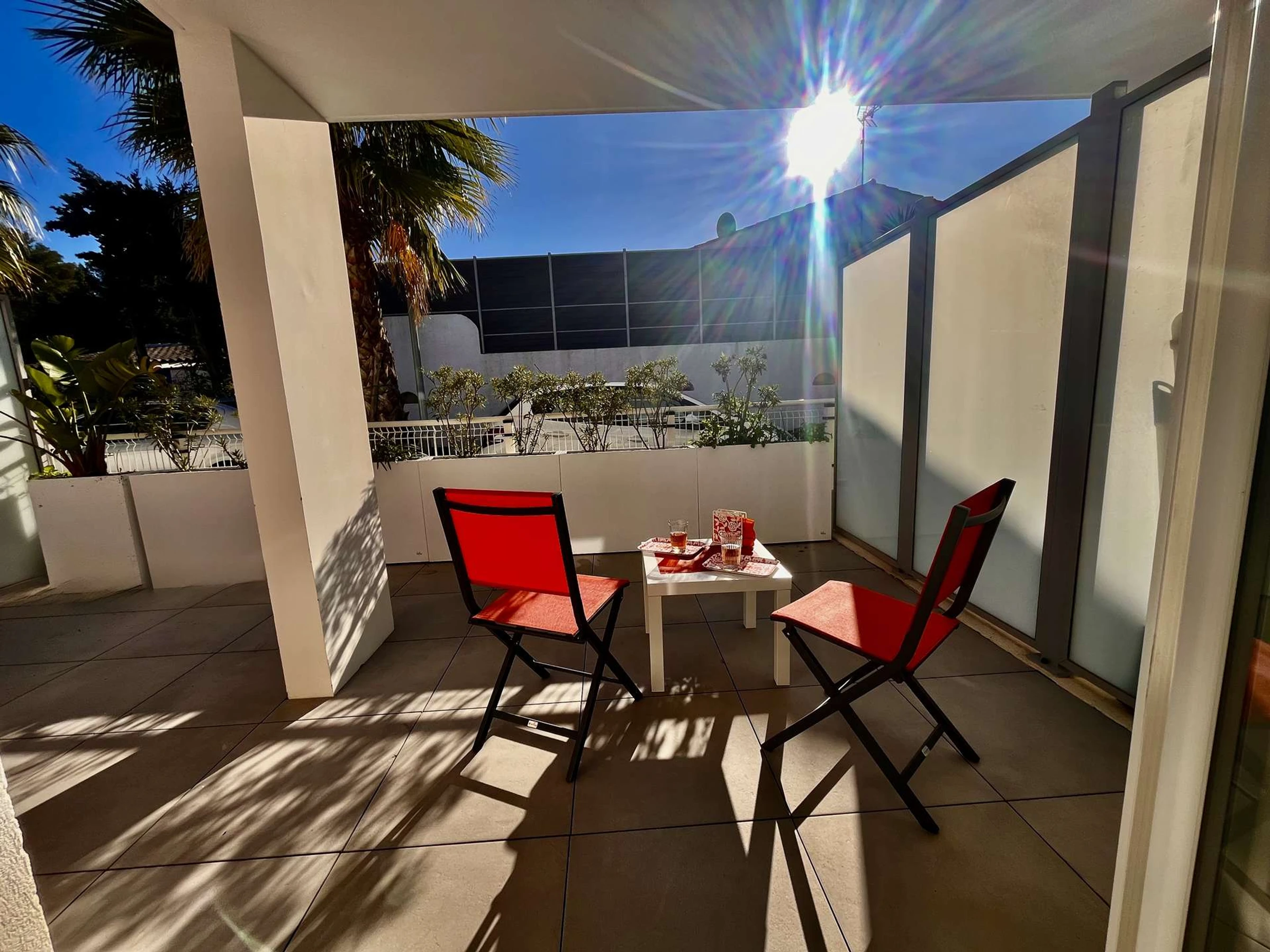 Une belle terrasse avec parasol et une double place de parking en enfilade en sous-sol complètent cette location.