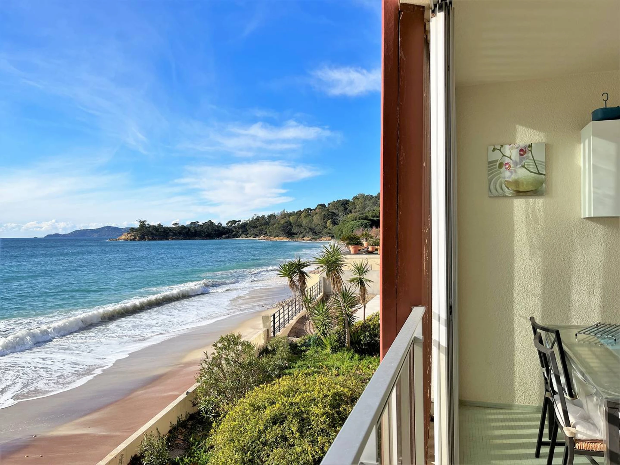 Les plus de cette location de vacances : aucune route à traverser pour aller à la plage, vue panoramique sur la mer, la plage, les îles d'or et la baie de Cavalière. Accès wifi