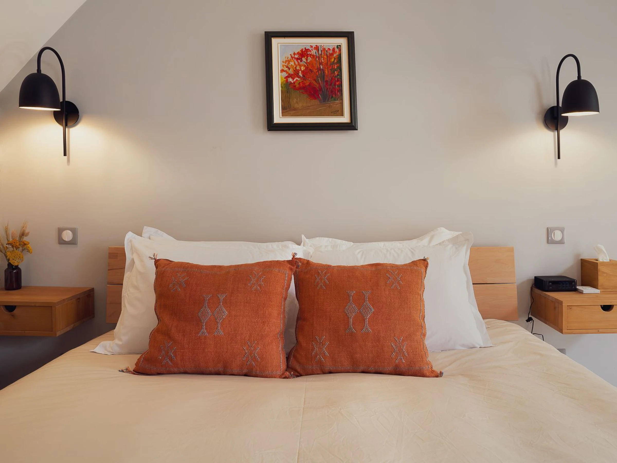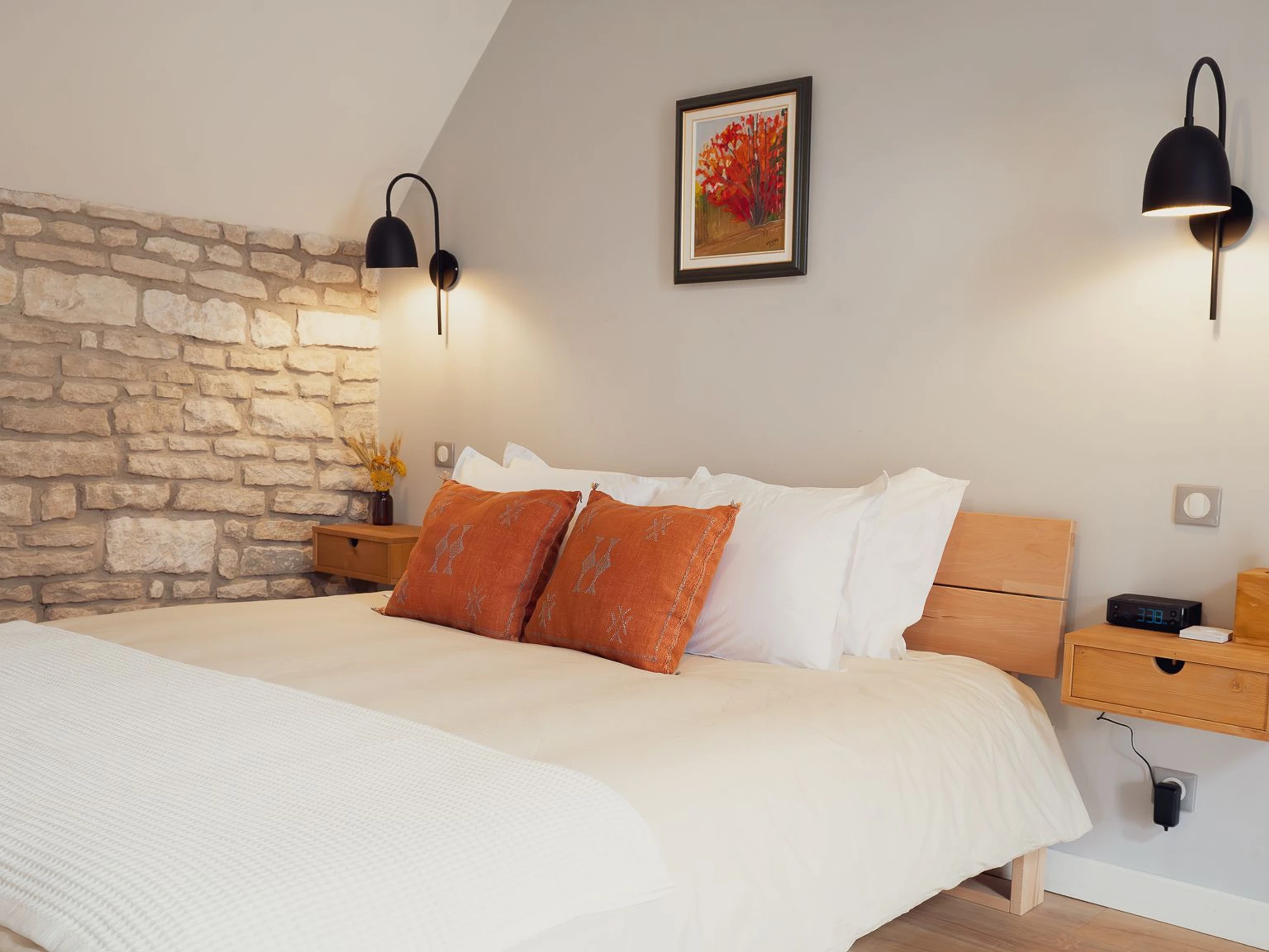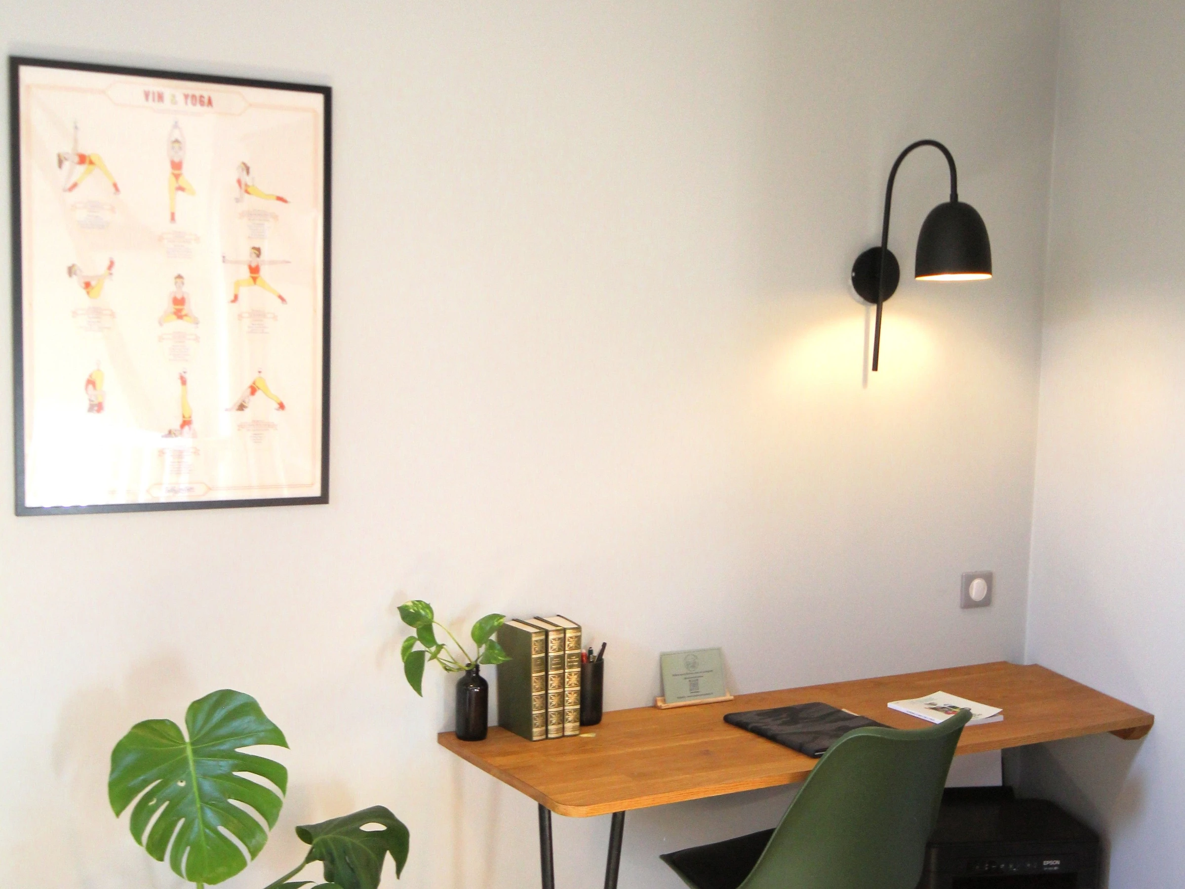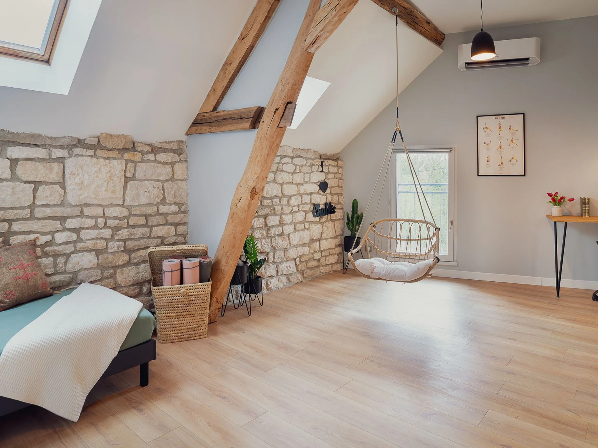 À l'étage : sur le palier, un lit simple (90x200), quelques tapis de yoga, un espace dédié au télétravail avec une jolie vue sur le Serein, une seconde salle d’eau avec douche et WC, ainsi qu’une chambre avec un grand lit double (180x200).