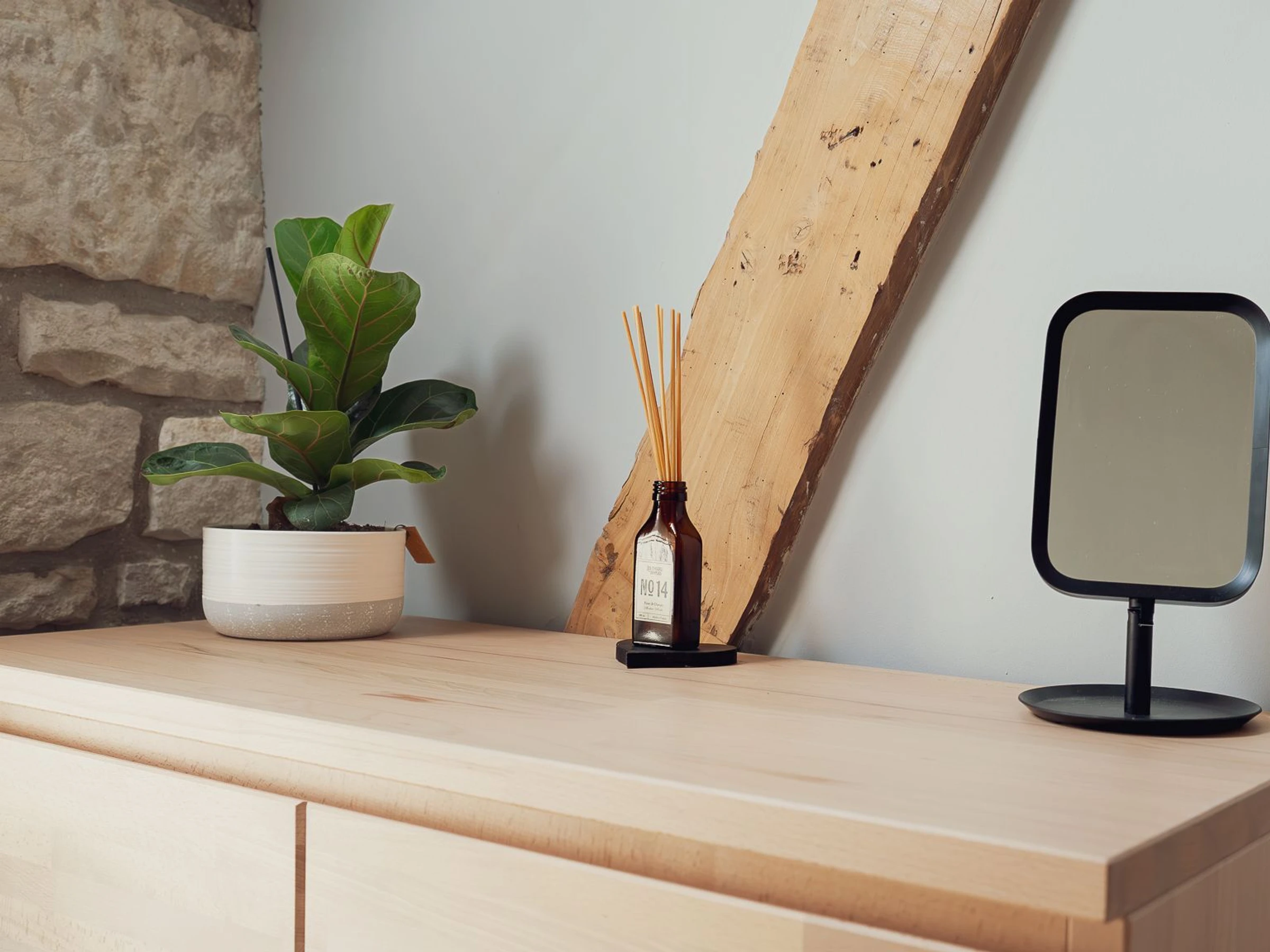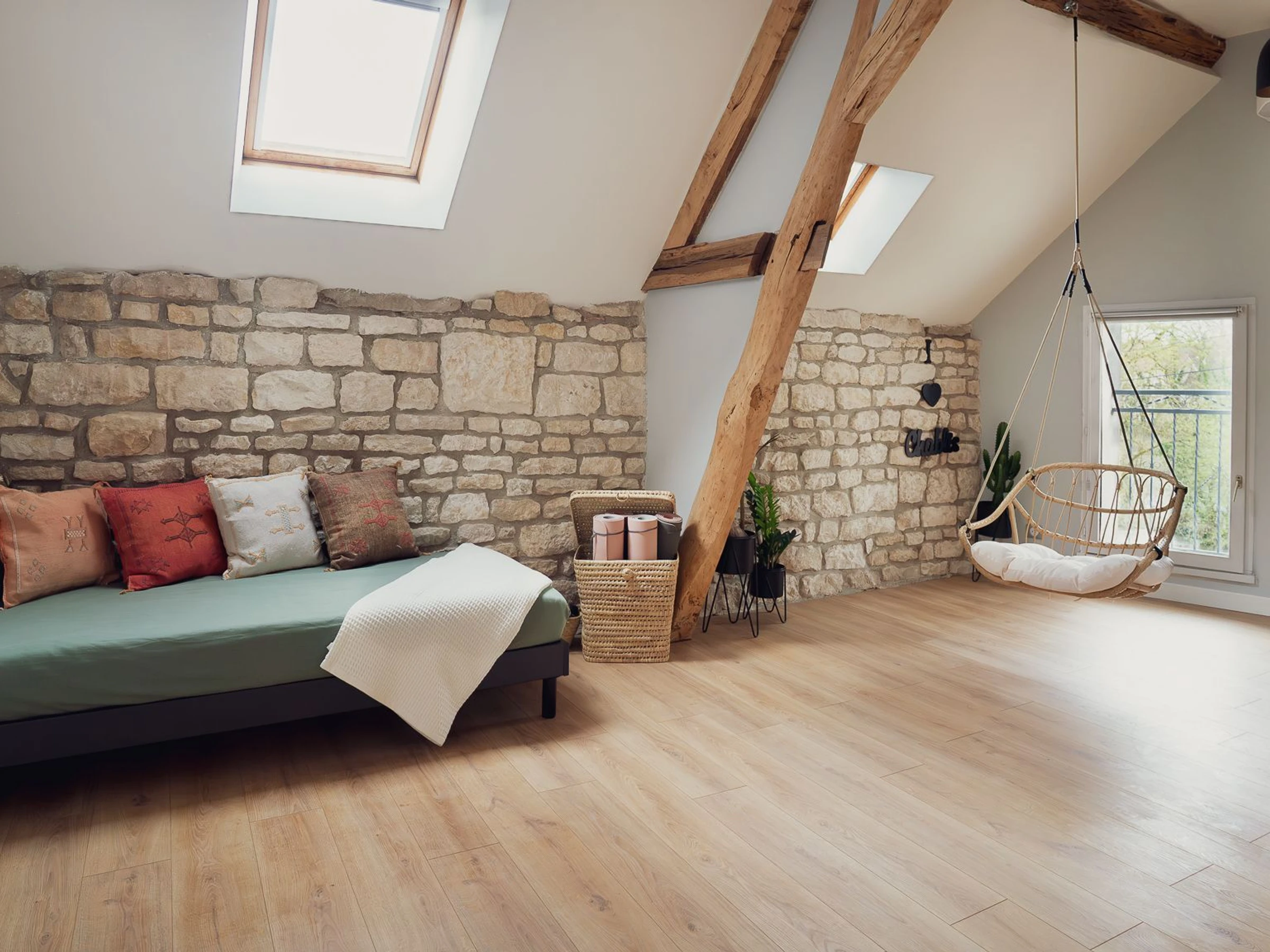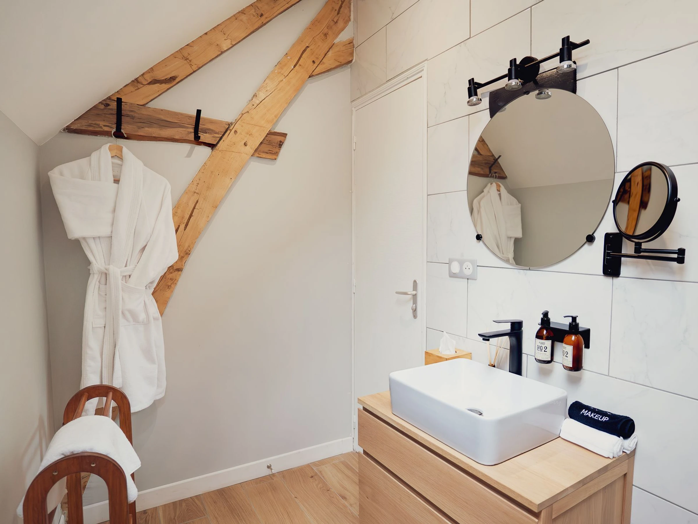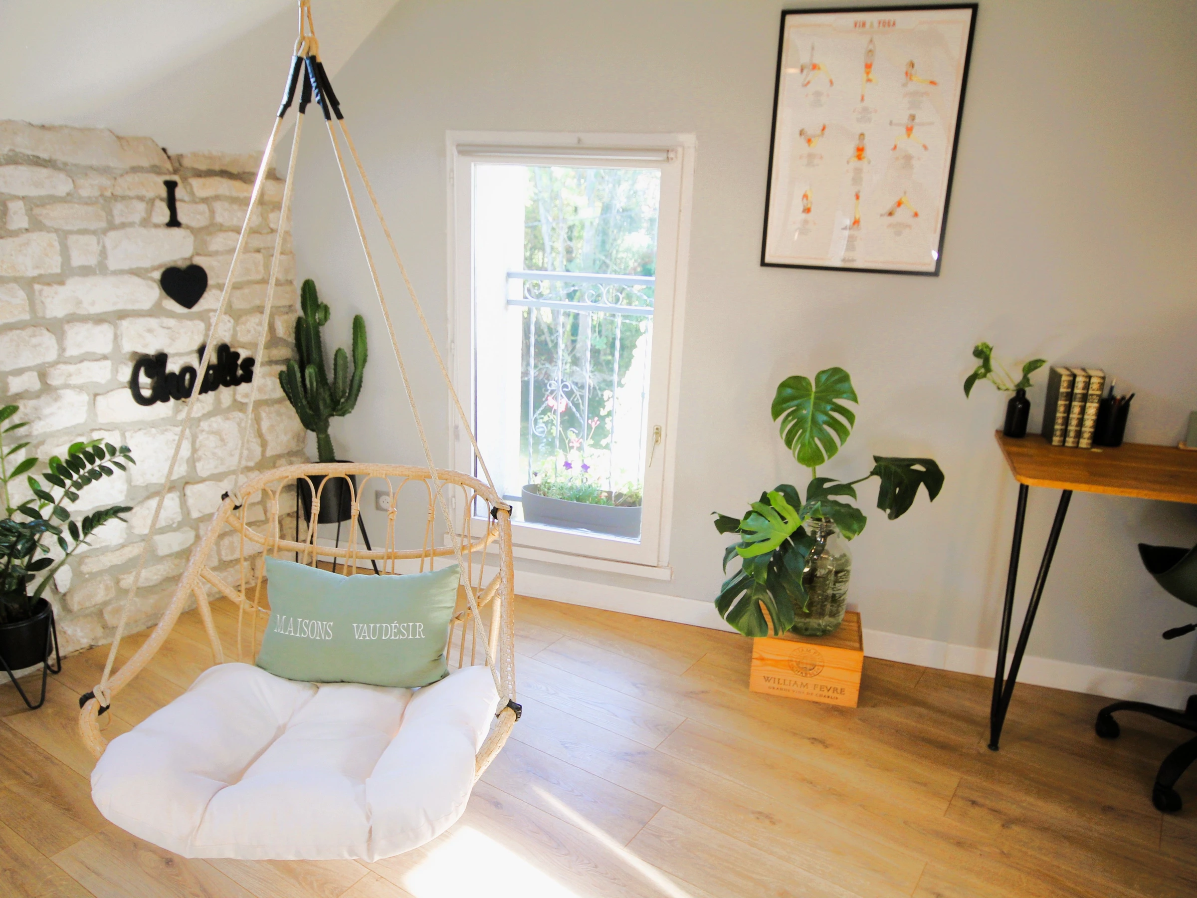À l'étage : sur le palier, un lit simple (90x200), quelques tapis de yoga, un espace dédié au télétravail avec une jolie vue sur le Serein, une seconde salle d’eau avec douche et WC, ainsi qu’une chambre avec un grand lit double (180x200).